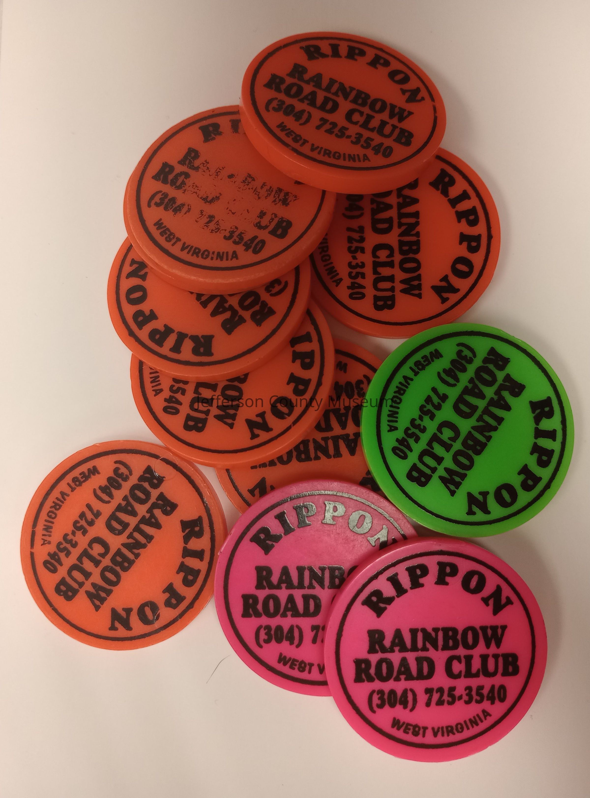 Neon pink drink chip from the Rainbow Road Club. Club information and phone number are printed in black on one side.