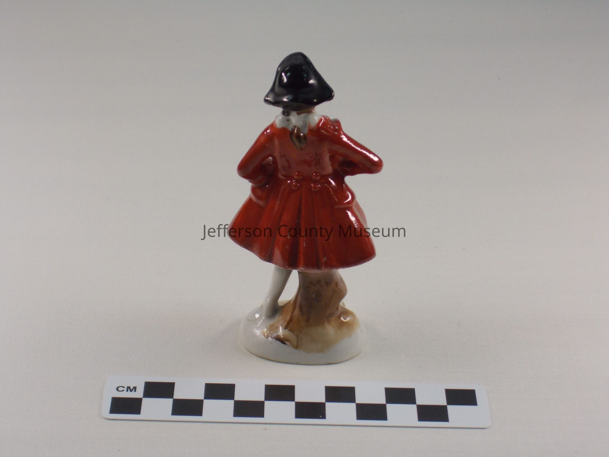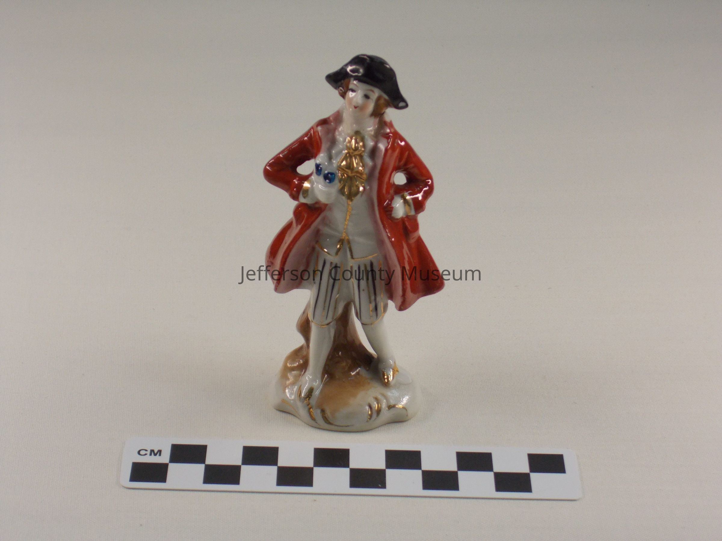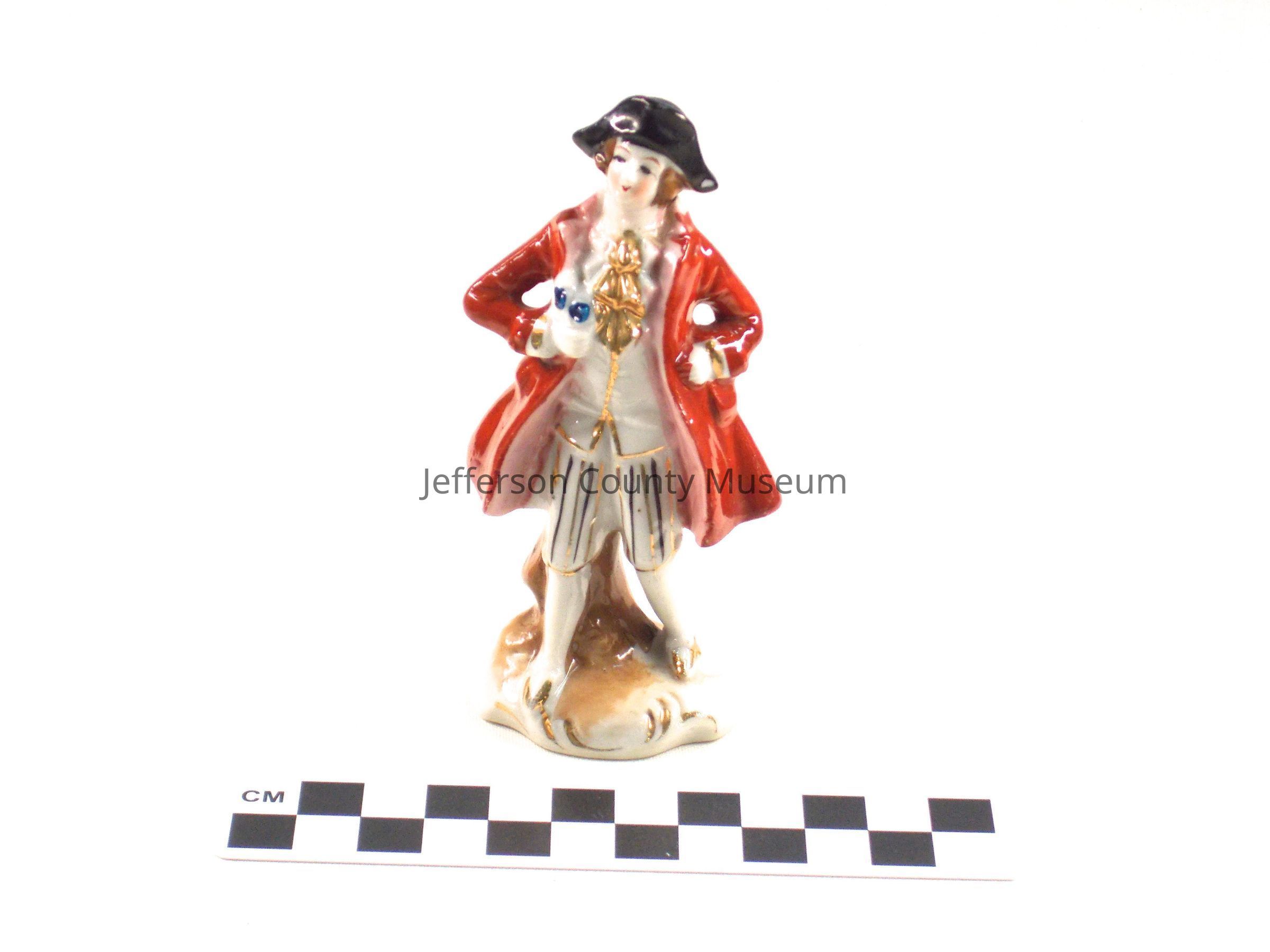 Porcelain figurine of a man dressed in tricorn hat, light brown coat, striped knee breeches, white waistcoat trimmed with gold and gold on base. Holding two blue flowers in right hand. Marked on bottom "MADE IN OCCUPIED JAPAN".Acquisition