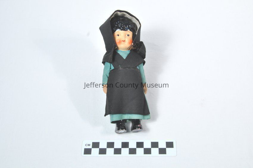 Composition doll dressed as an Amish woman wearing green dress, long black apron and large black shawl bonnet. One of pair with catalog number 1407.Acquisition