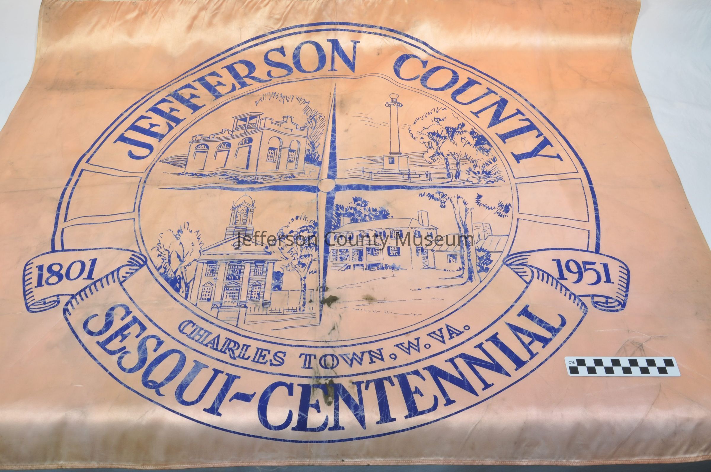 Salmon colored satin flag or banner with blue logo in a circular design. In circle are points of the compass and "JEFFERSON COUNTY SESQUI-CENTENNIAL 1801 1951 CHARLES TOWN, W.VA." Scenes depicted in circle are the firehouse at Harpers Ferry ("John Brown's Fort"), the Rumsey Monument at Shepherdstown, the Jefferson County court house, and a house with an outbuilding attached.Acquisition