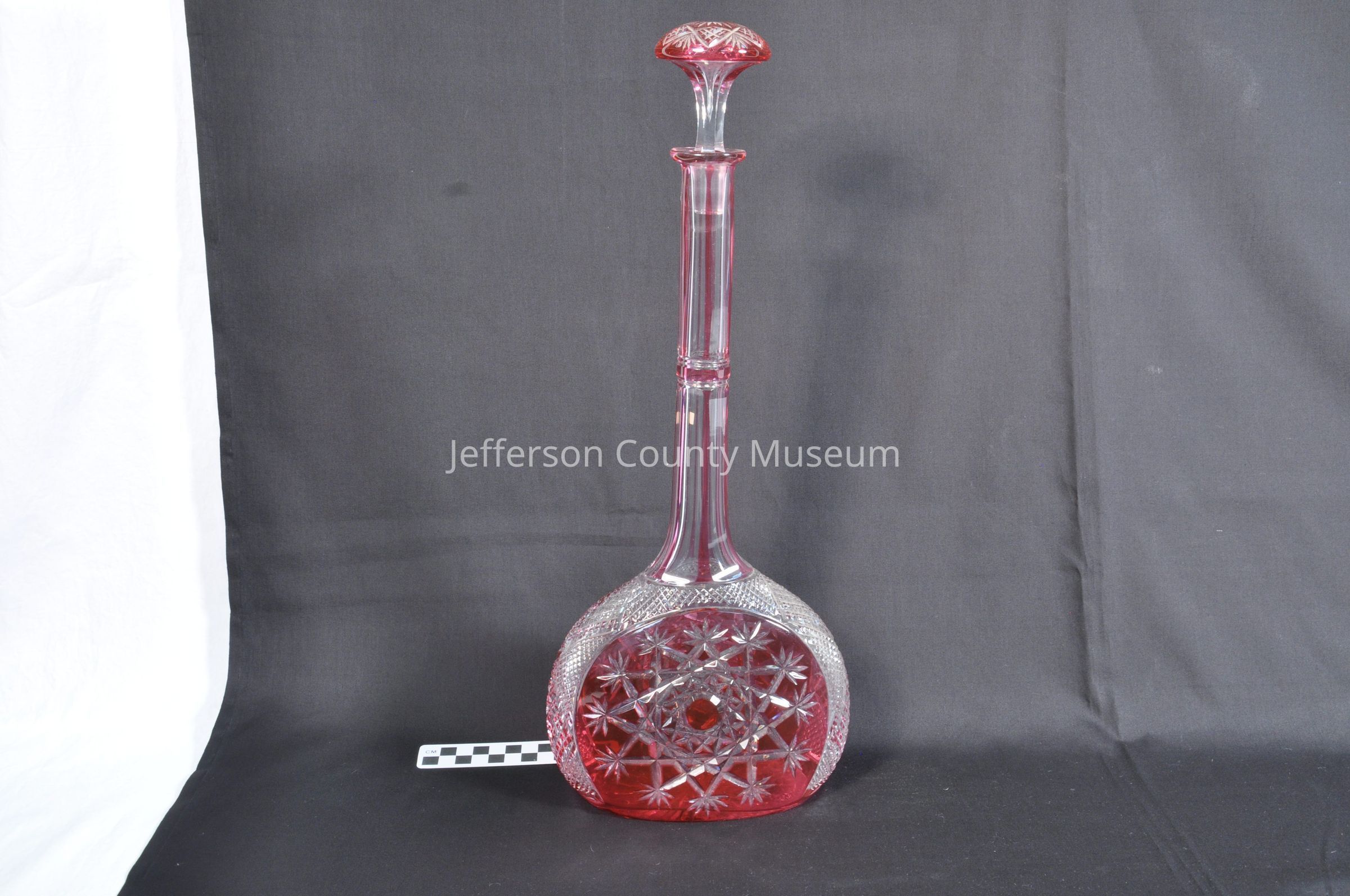 Press-cut long necked decanter with glass stopper. Clear glass with red flashing.Acquisition