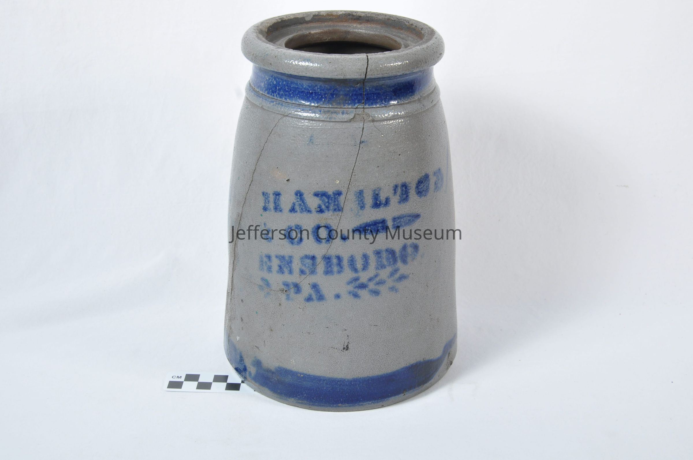 Gray stoneware churn with cobalt stencilling and decoration. Wider at bottom than top. Stencilling is "HAMILTON & CO. ----ENSBORO PA"Acquisition