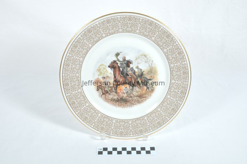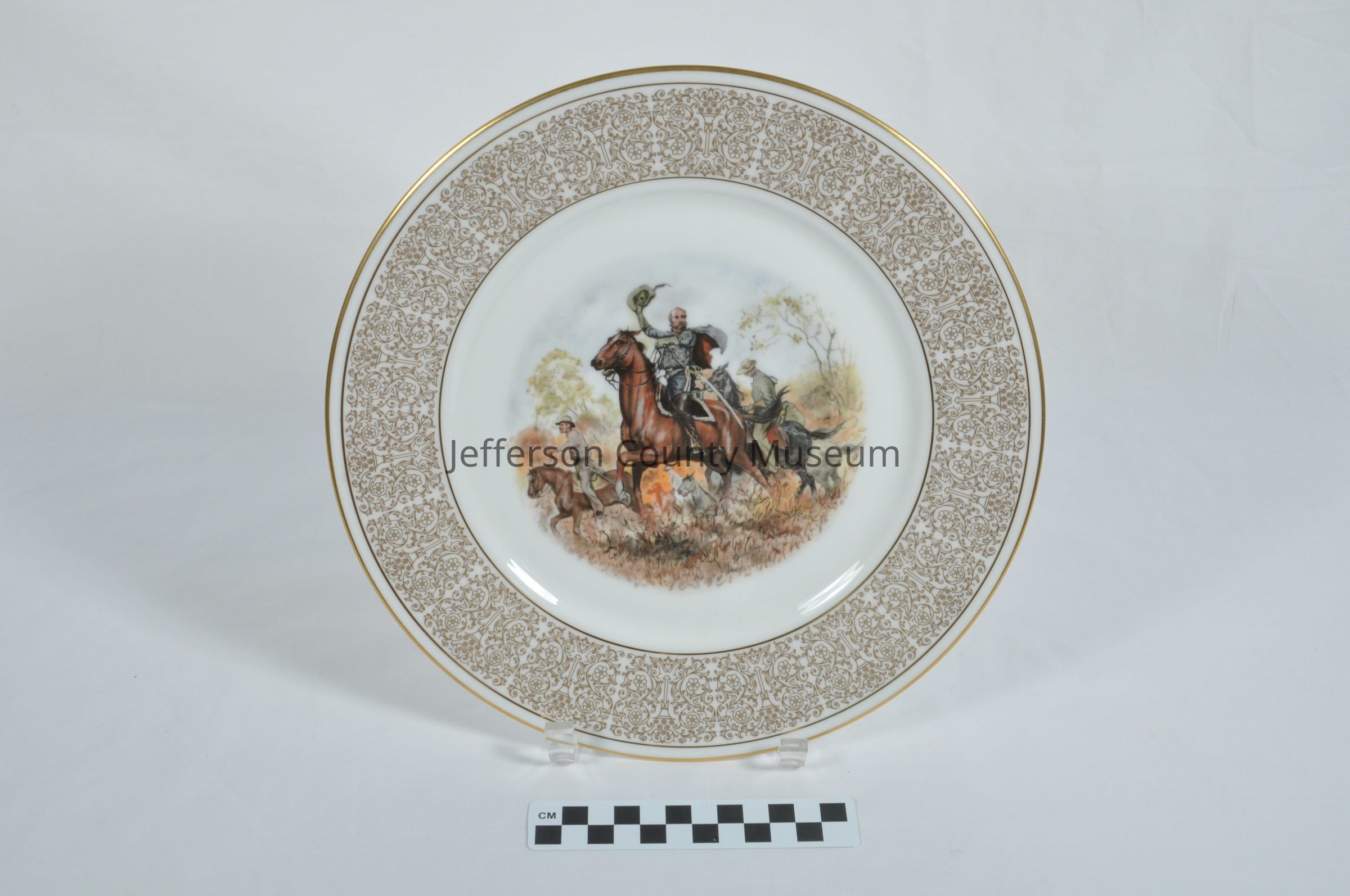 One of ten Confederacy Collection commemorative plates with gold around rim and elaborate gold design around outer edge. Shows Jeb Stuart on horseback with his hat uplifted in his right hand. Several soldiers and horses in background. Printed on back of plate in gold "TRUSTEES OF THE WHITE HOUSE OF THE CONFEDERACY Co-chairman: Bruce Catton Virginius Dabney. Mrs. Dwight D. Eisenhower, Mills E. Godwin, Jr., Governor Linwood Holton, Mrs. Lyndon B. Johnson, Archie K. Davis, Governor Ronald Reagan, U.S.Senator John C. Stennis. J.E.B. STUART Serial No. 148 Limited edition series issued 1971 A. D. on behalf of the restoration of the White House of the Confederacy and the construction of the new Museum of the Confederacy, Richmond, Virginia OXFORD BONE CHINA MADE BY LENOX U.S.A.". In center is seal of the Confederacy. Around George Washington on horseback is "THE CONFEDERATE STATES OF AMERICA: 22 FEBRUARY 1862 DEO VINDICE". Number is on the outside of the box, not on the actual plate since plate is in its original packaging and does not look to have been opened.Acquisition