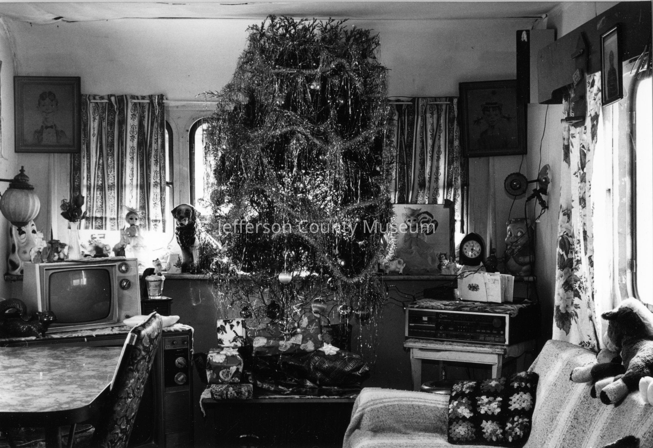 Franklintown; Mobile home trailer interior decorated for Christmas.