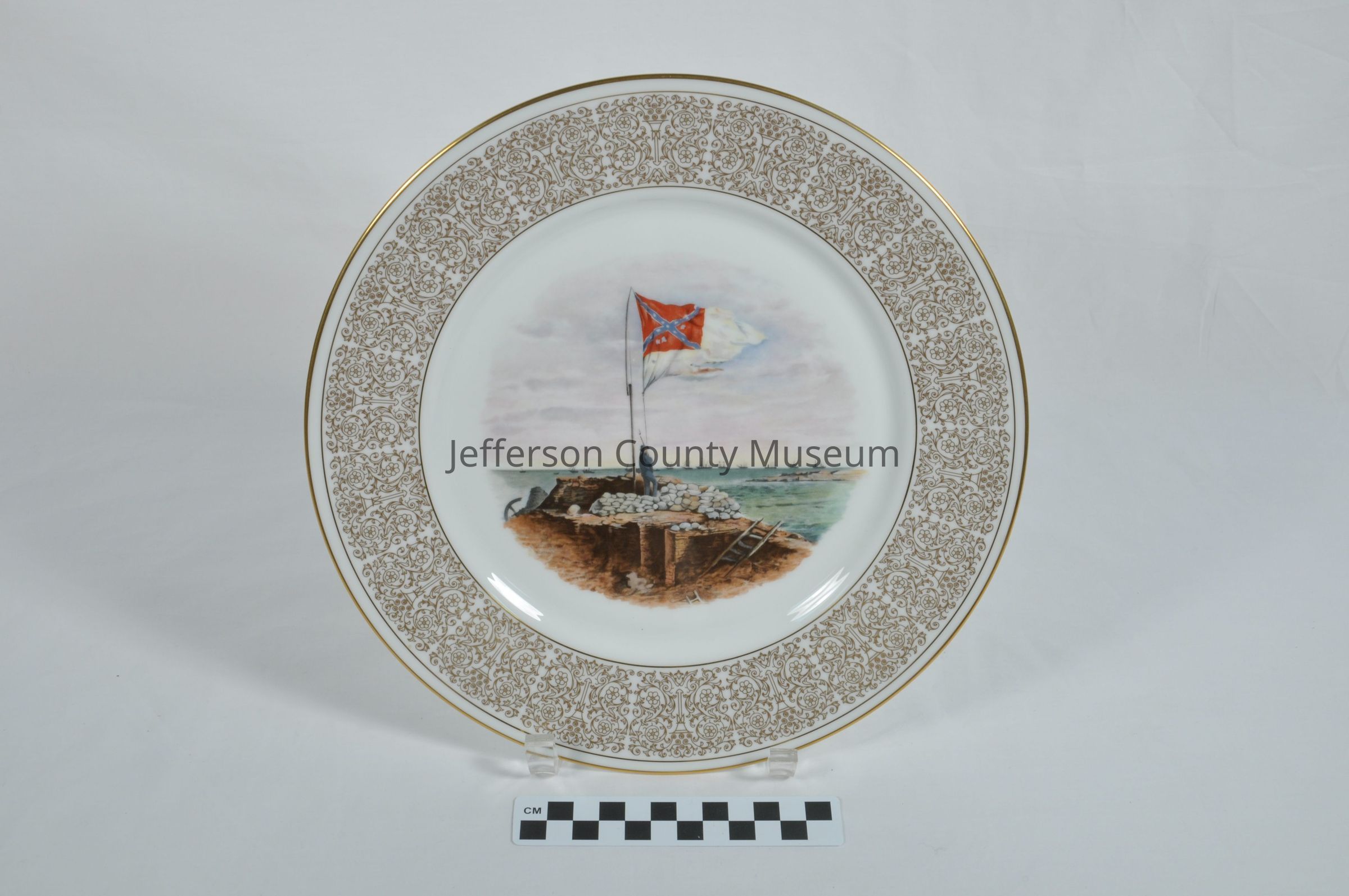 Plate is exactly like catalog #1419 except scene is of Fort Sumter with Confederate flag flying and description on back "FORT SUMTER".