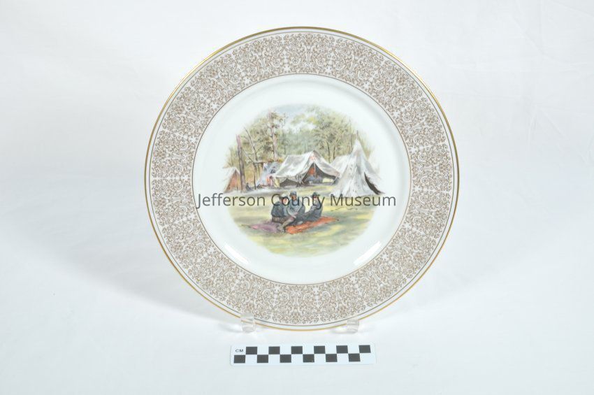 Plate is exactly like catalog #1419 except scene is of Confederate camp with three soldiers sitting on a blanket and tents in background. Description on back is "CONFEDERATE CAMP". Box numbered only.Acquisition