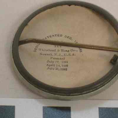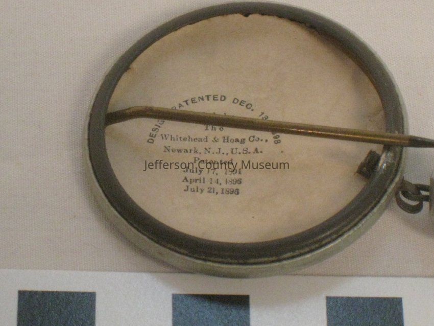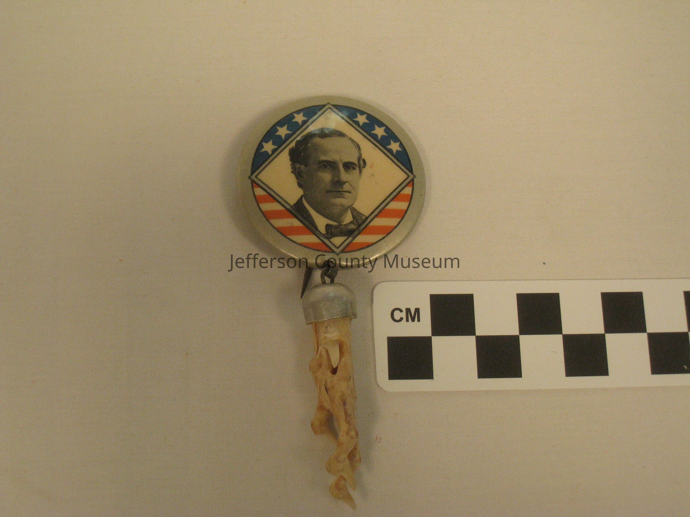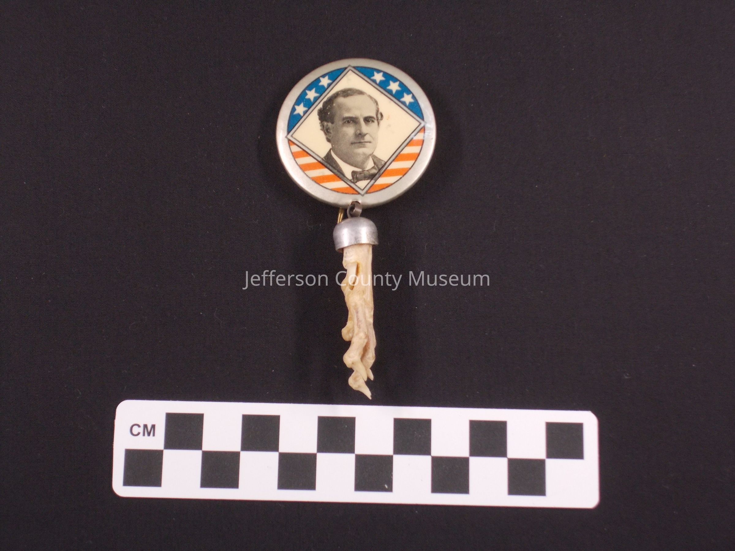 Button with pin on back shows William Jennings Bryan with American flag like design around picture. Hanging from button is a skeletonized rabbits foot. On back is "DESIGN PATENTED DEC. 13, 1898 Made by the Whitehead & Hoag Co., Newark, N.J., U.S.A. Patented July 17, 1894 April 14, 1896 July 21, 1896".Acquisition