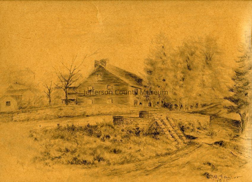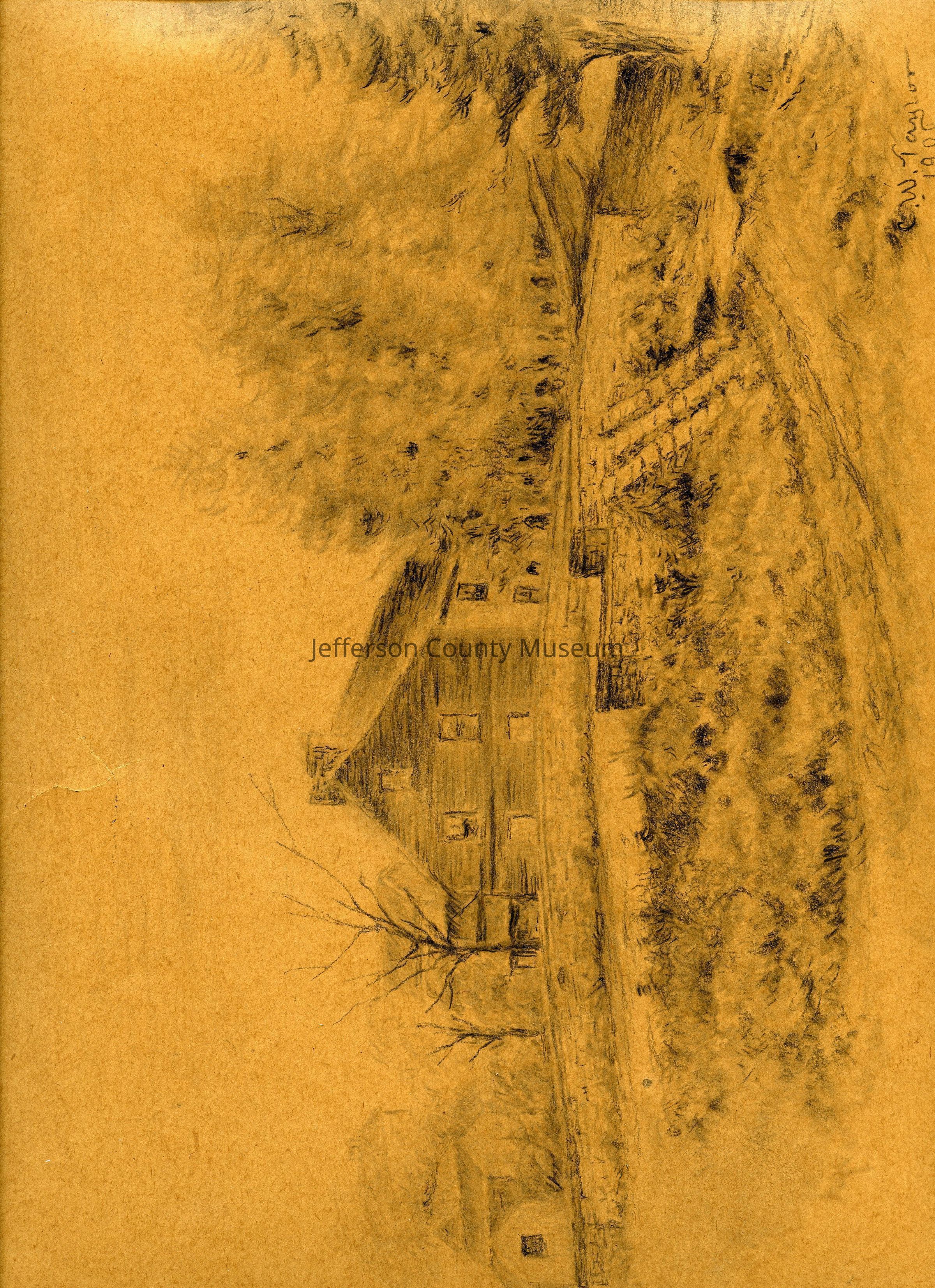 Charcoal and pencil sketch of "Hull's Tavern, 1900" signed by C. W. Taylor