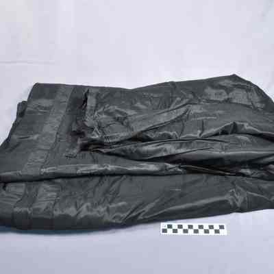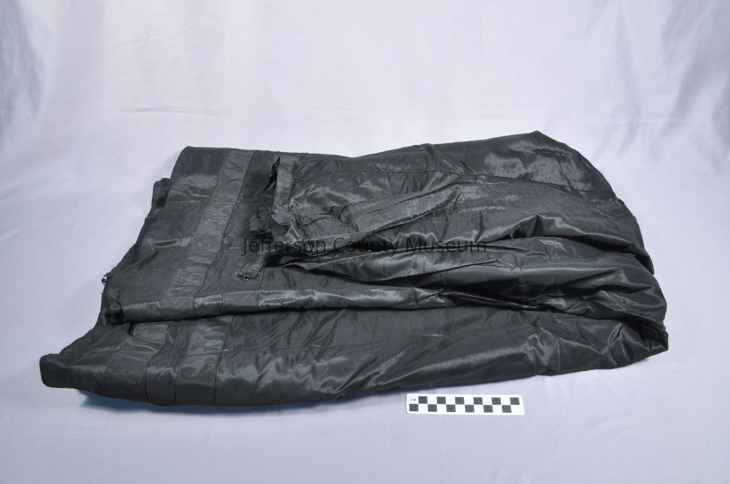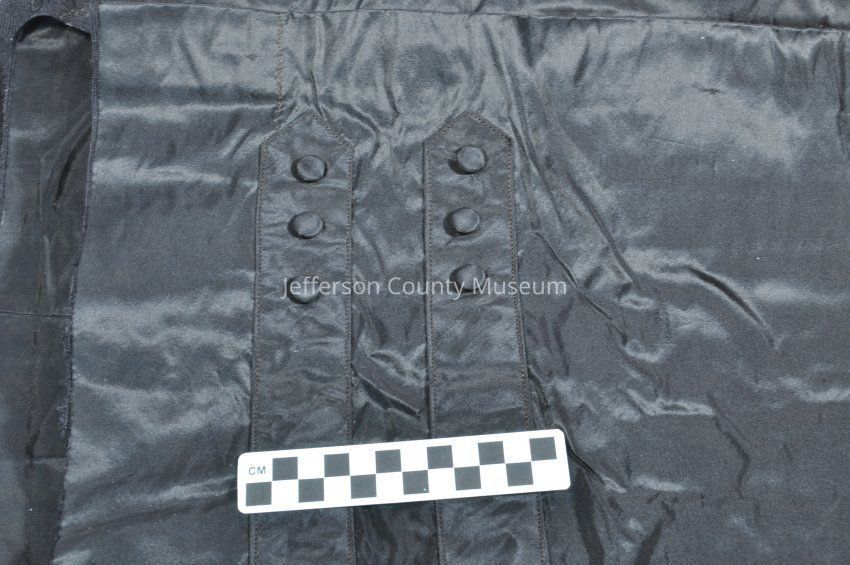 Long, black, silk skirt. Two black silk bands sewn around bottom. At end of each band are three buttons for decoration. Metal hooks and loops for closing at waist.Acquisition
