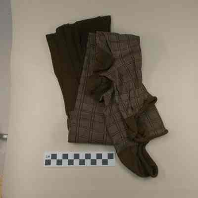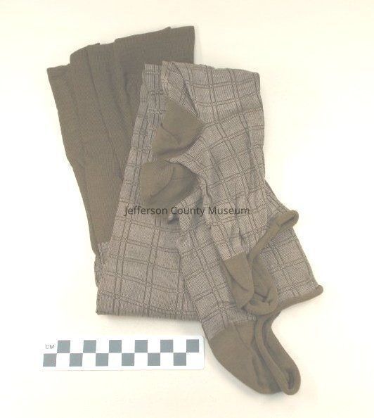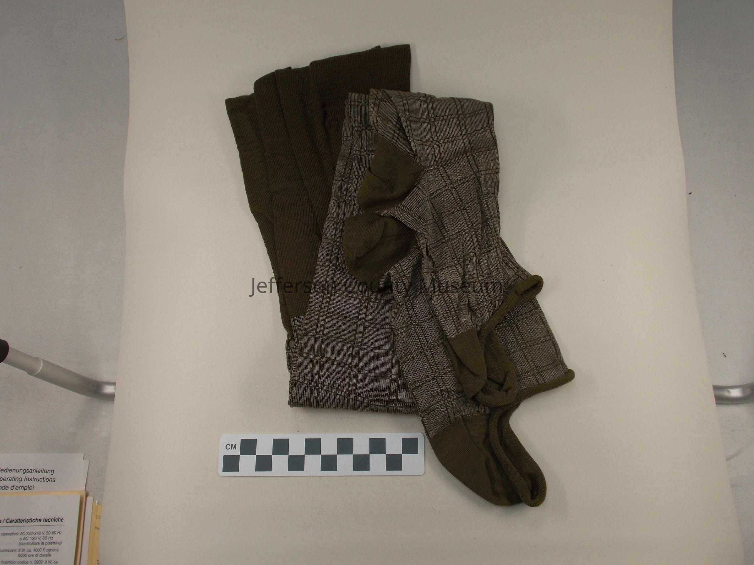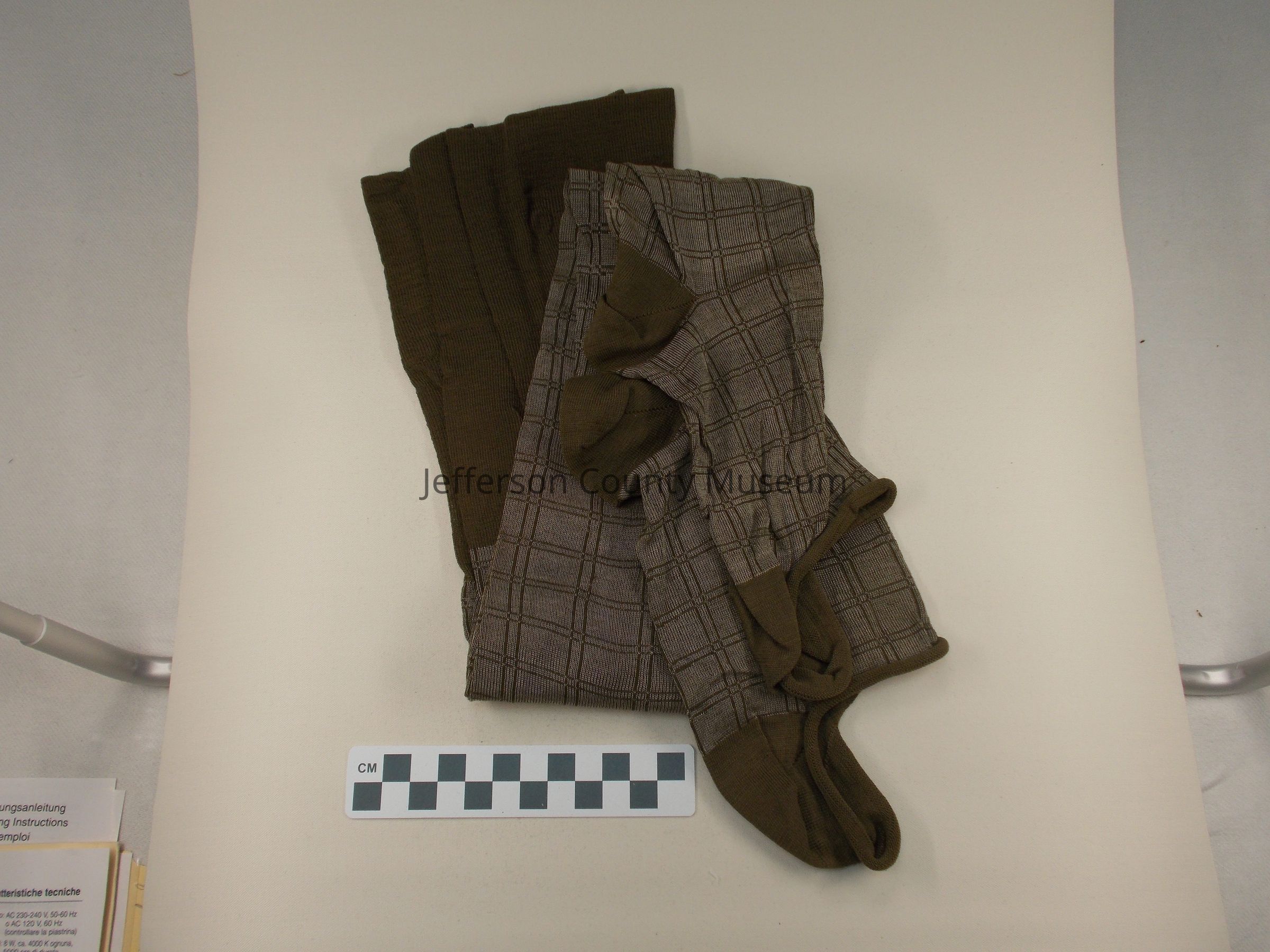 Dark olive and olive and white checked thigh length stockings. Foot of stockings is open-toed.Acquisition