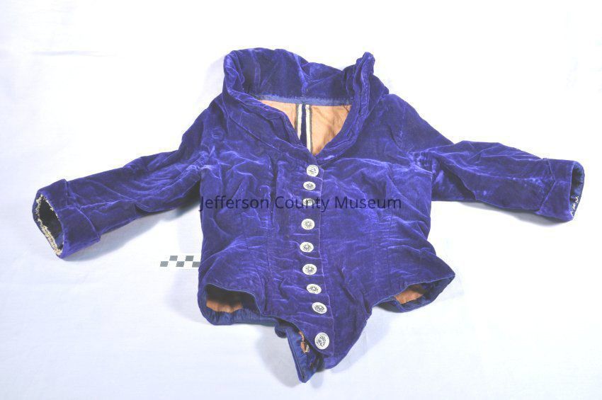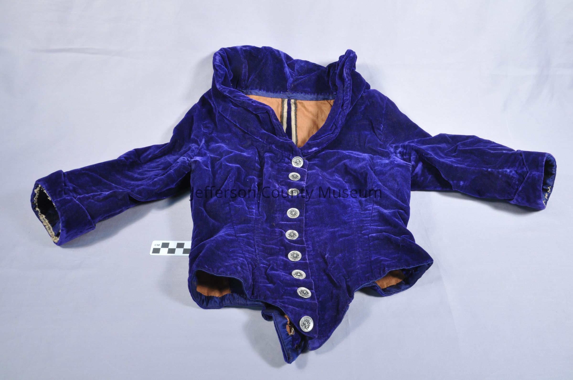 Royal blue velvet lady's jacket. Nine silver colored buttons for decoration. Closure is with metal hooks and loops. Small lace trim was sewn around bottom of cuffs. Left side has mostly deteriorated.Acquisition