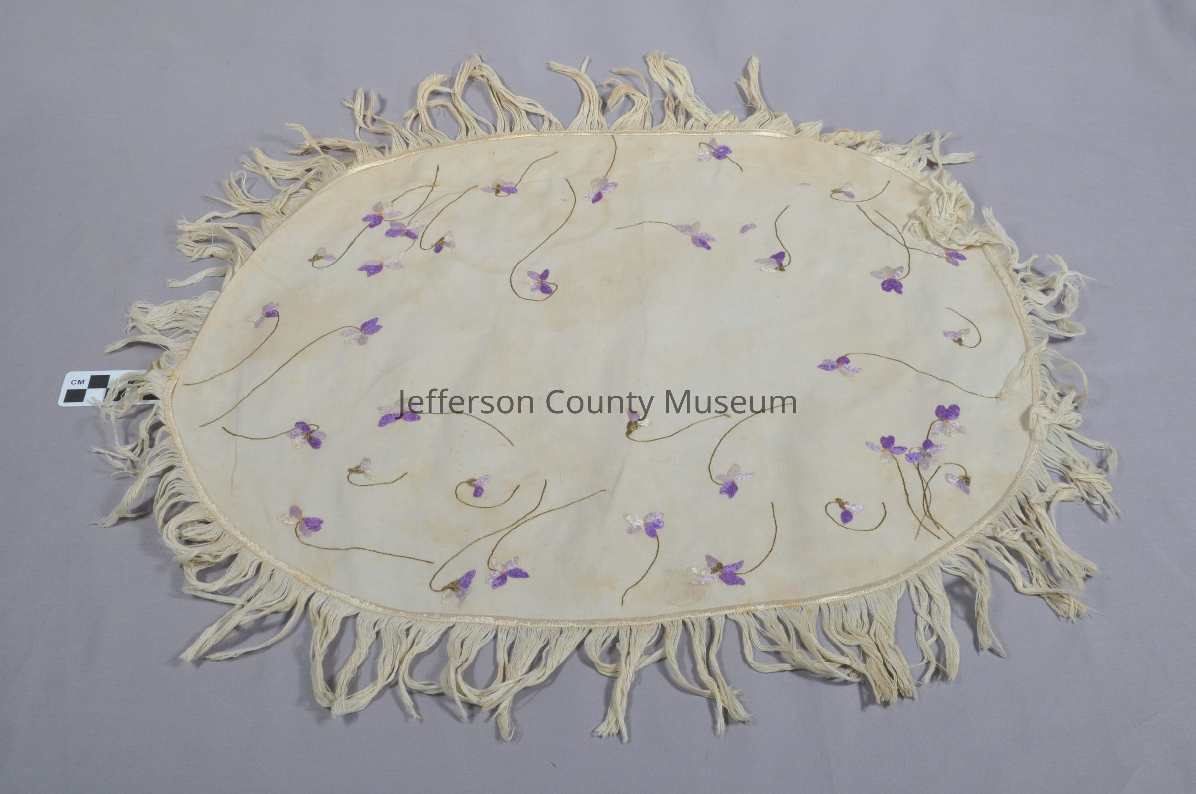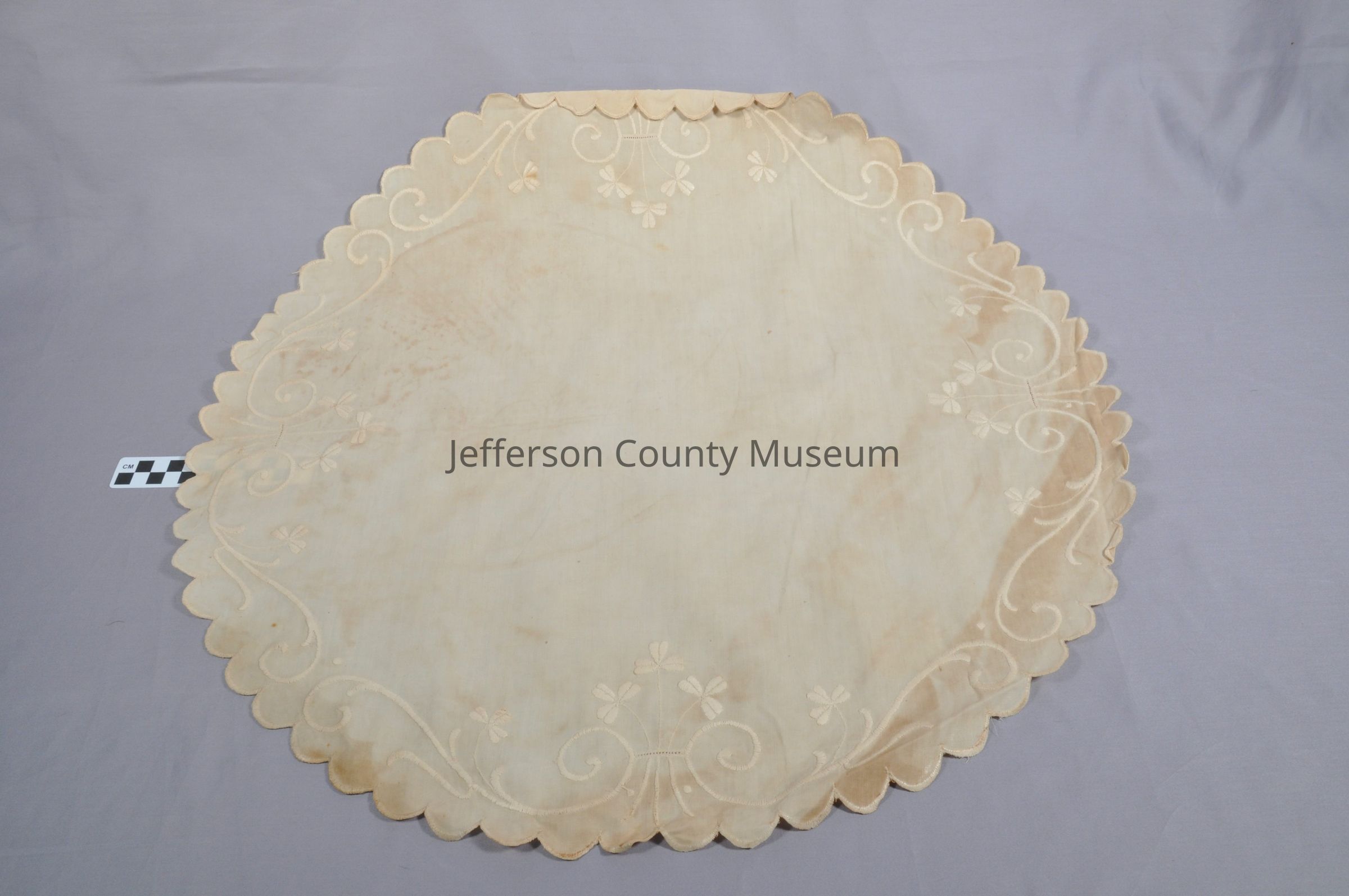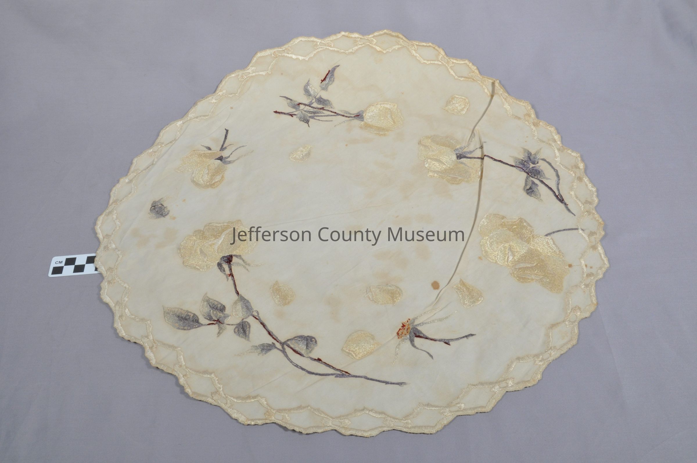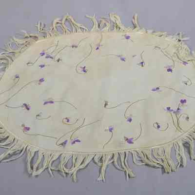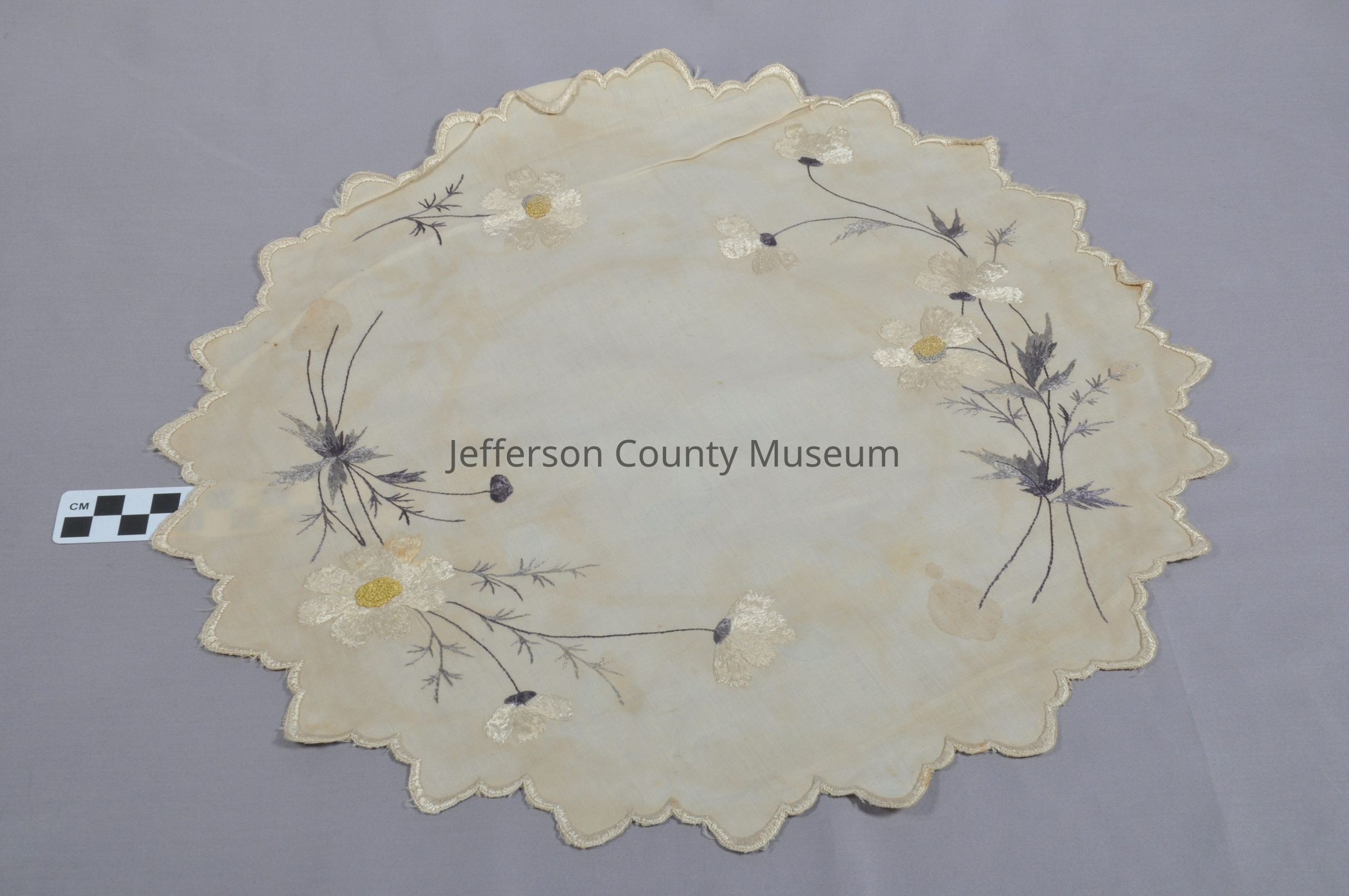 Seven centerpieces and doilies. Two are rectangular, four are round and one is oblong. All were probably white at one time but are now faded to off-white. All are embroidered with designs of flowers and leaves.Acquisition