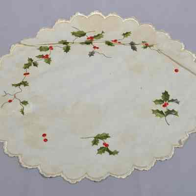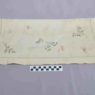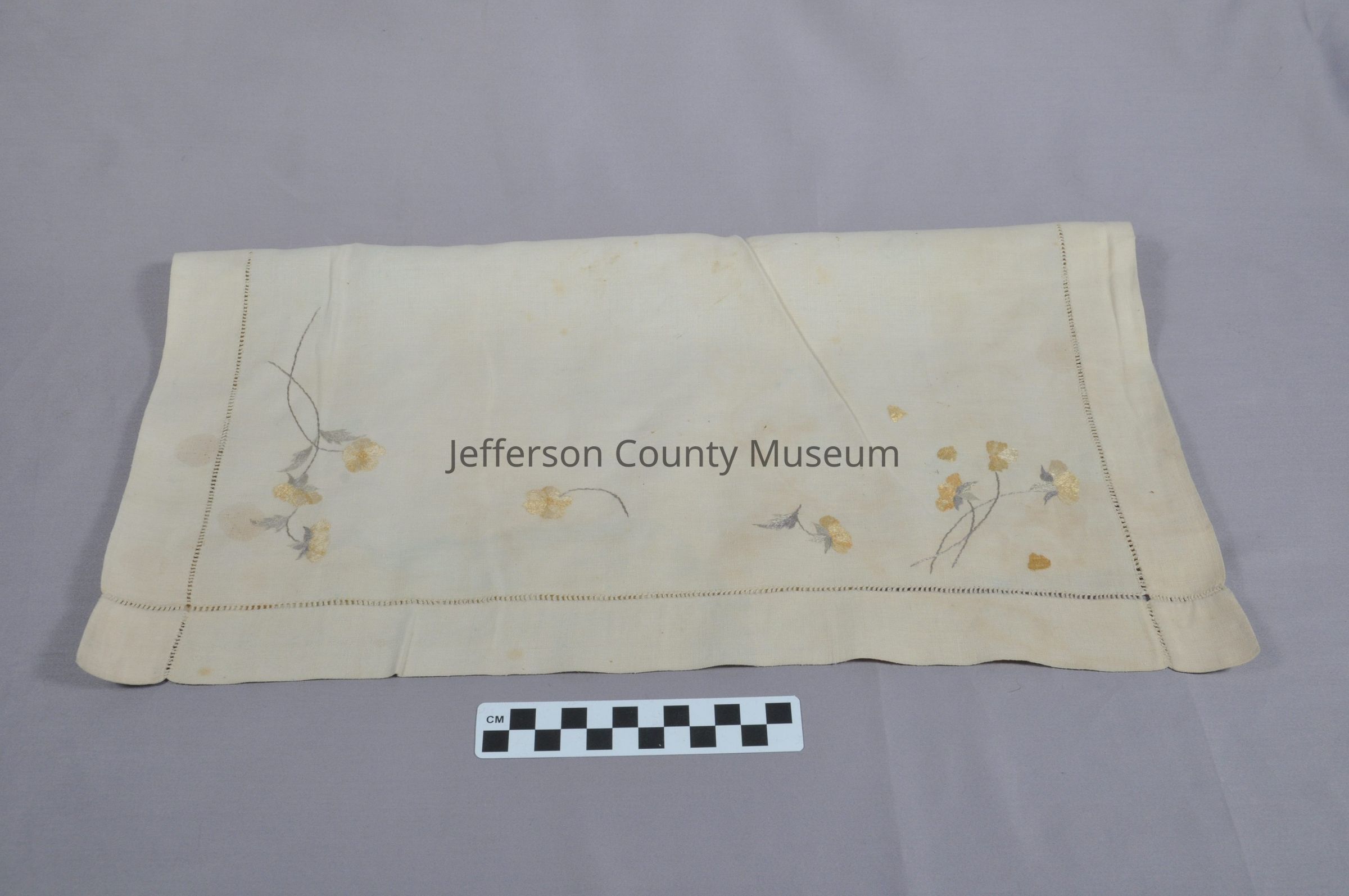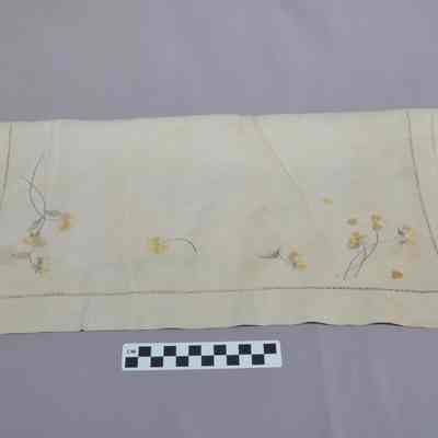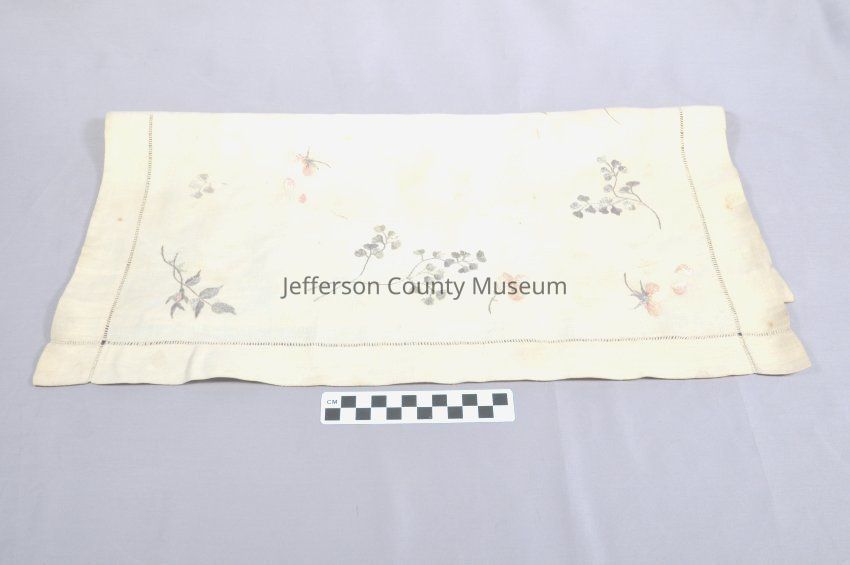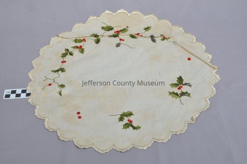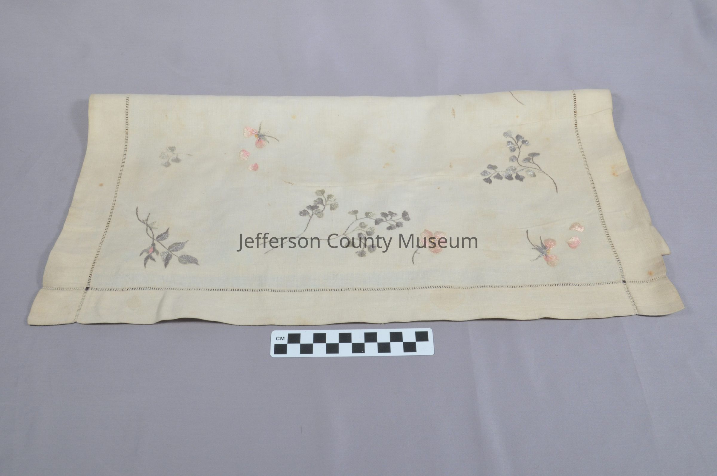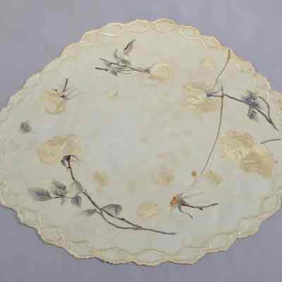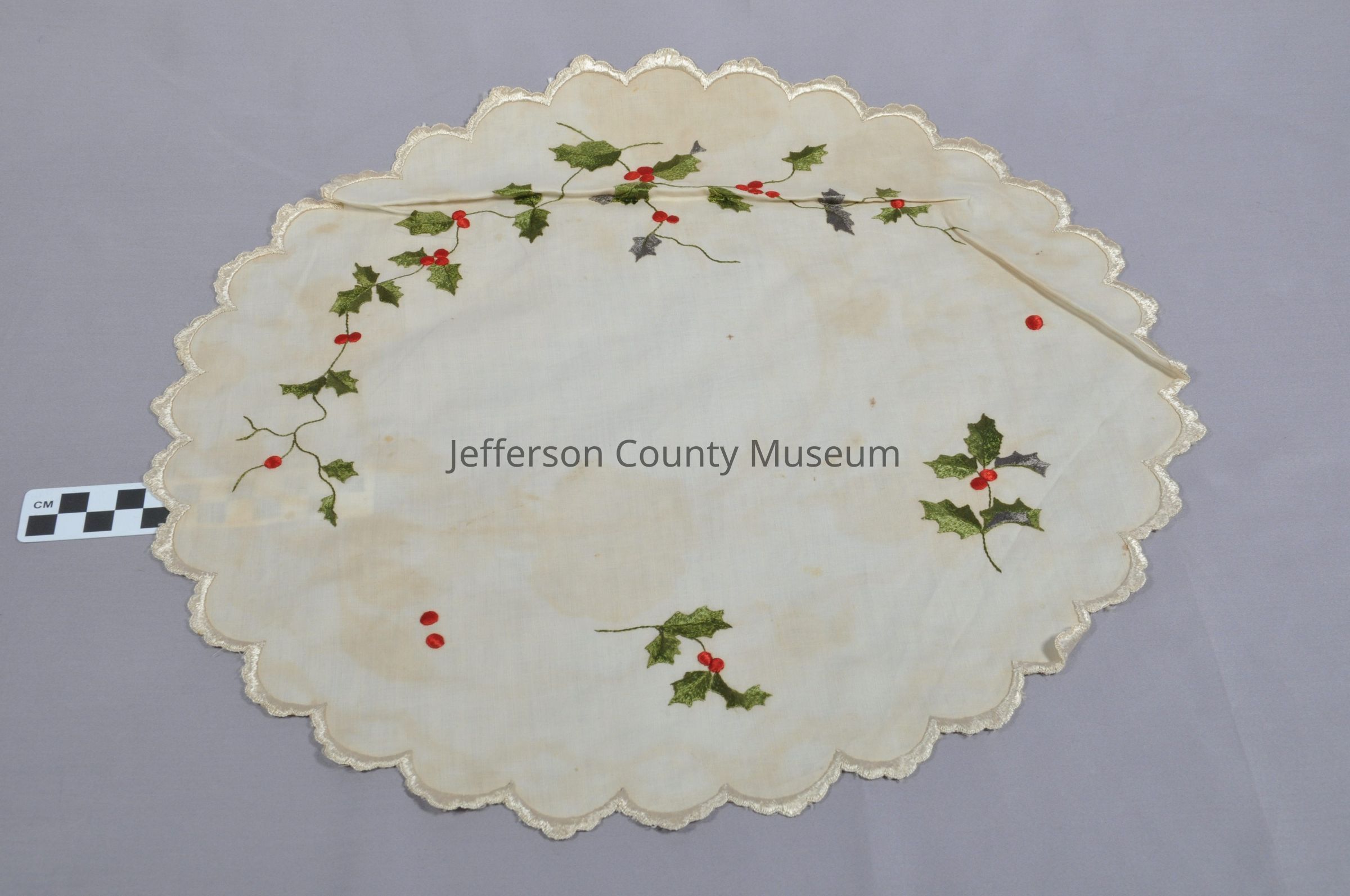 Seven centerpieces and doilies. Two are rectangular, four are round and one is oblong. All were probably white at one time but are now faded to off-white. All are embroidered with designs of flowers and leaves.Acquisition