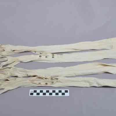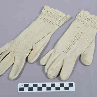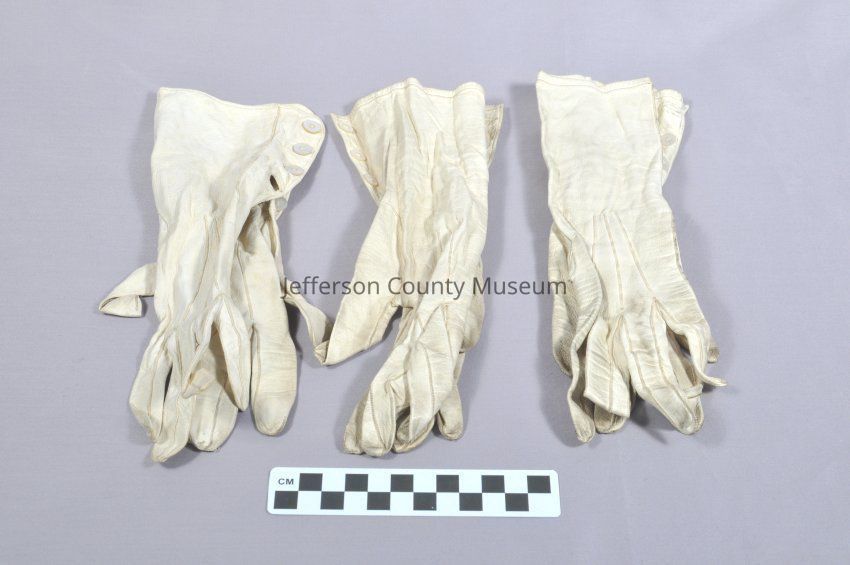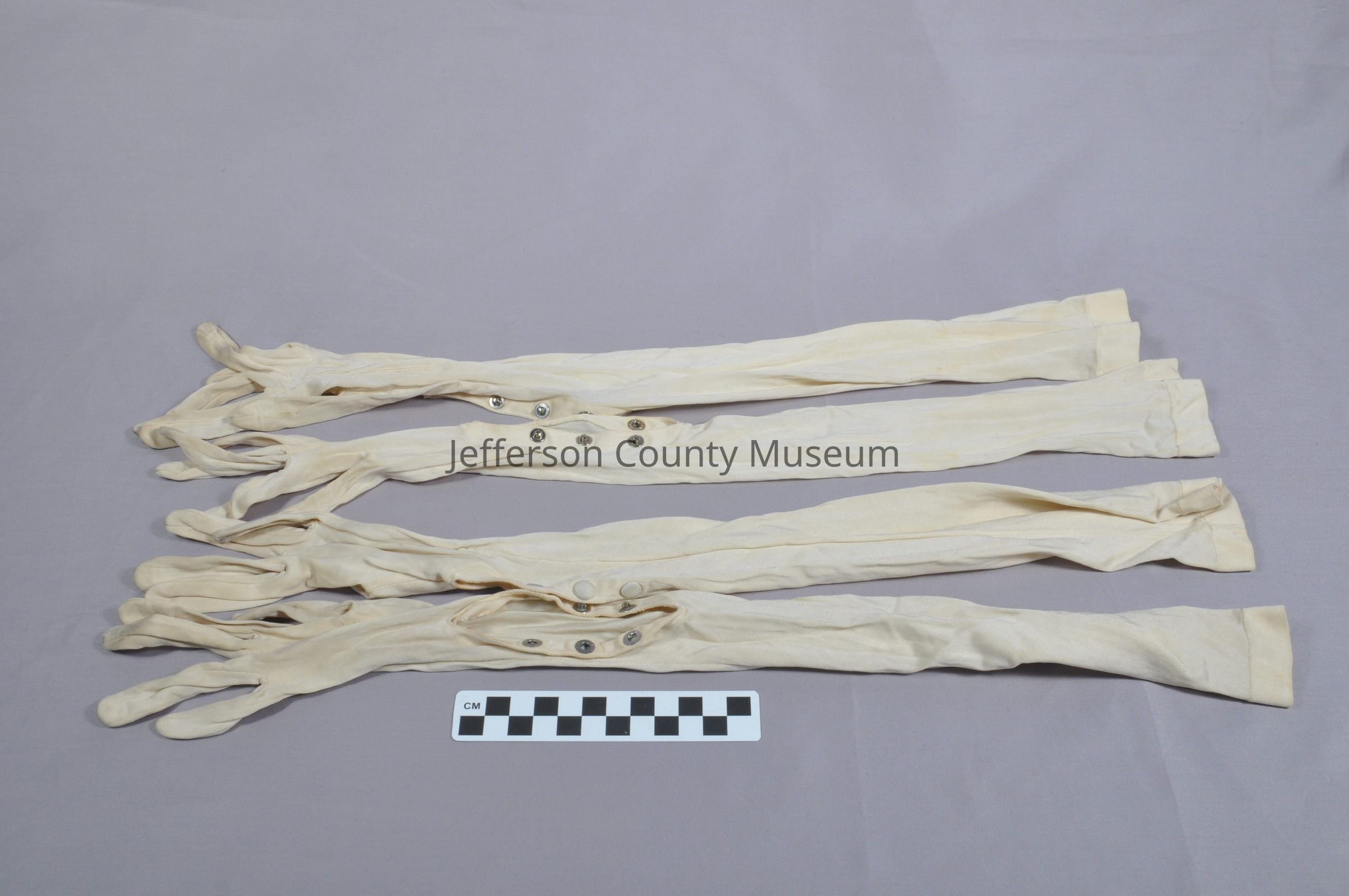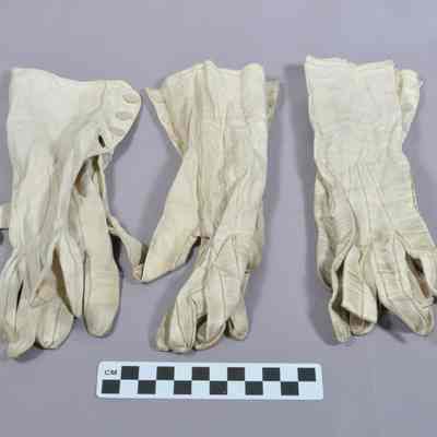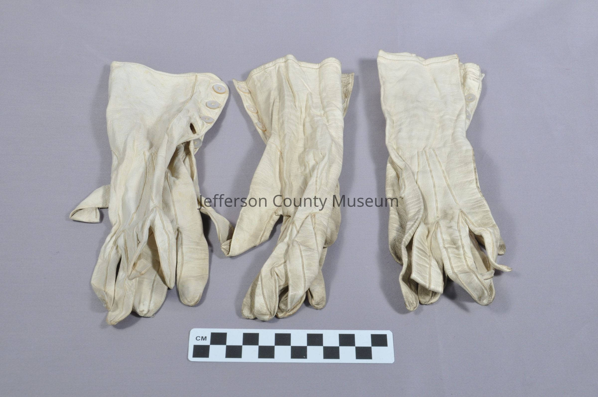 Six pairs of evening gloves. Three are leather, two are silk and one is knit. All are off-white. Some may have been white at one time.