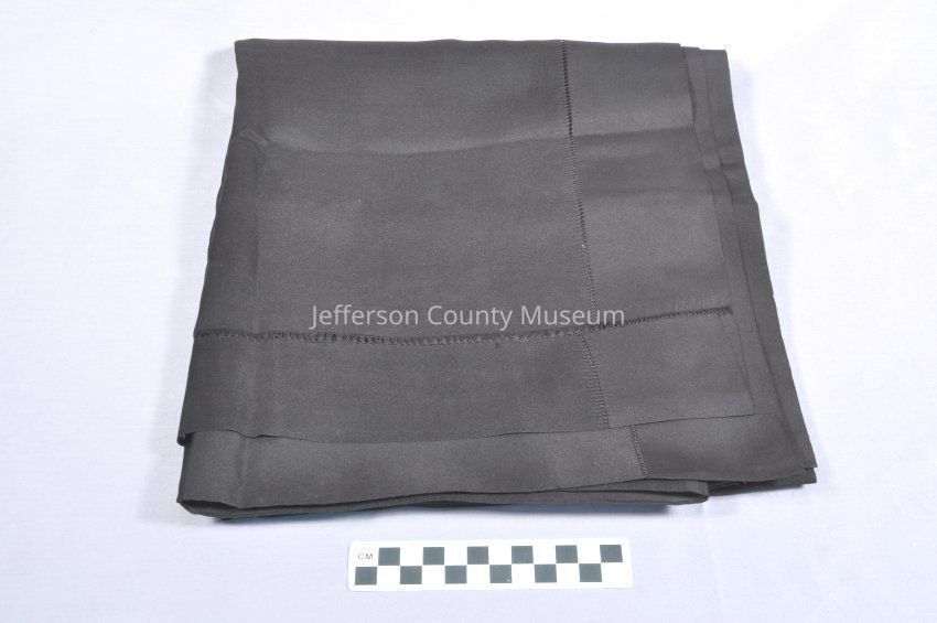 Black silk mourning veil. Border is double layered. The only decoration is an open weave where the border is attached and a wider open weave about 1/3 of the way across the veil.Acquisition