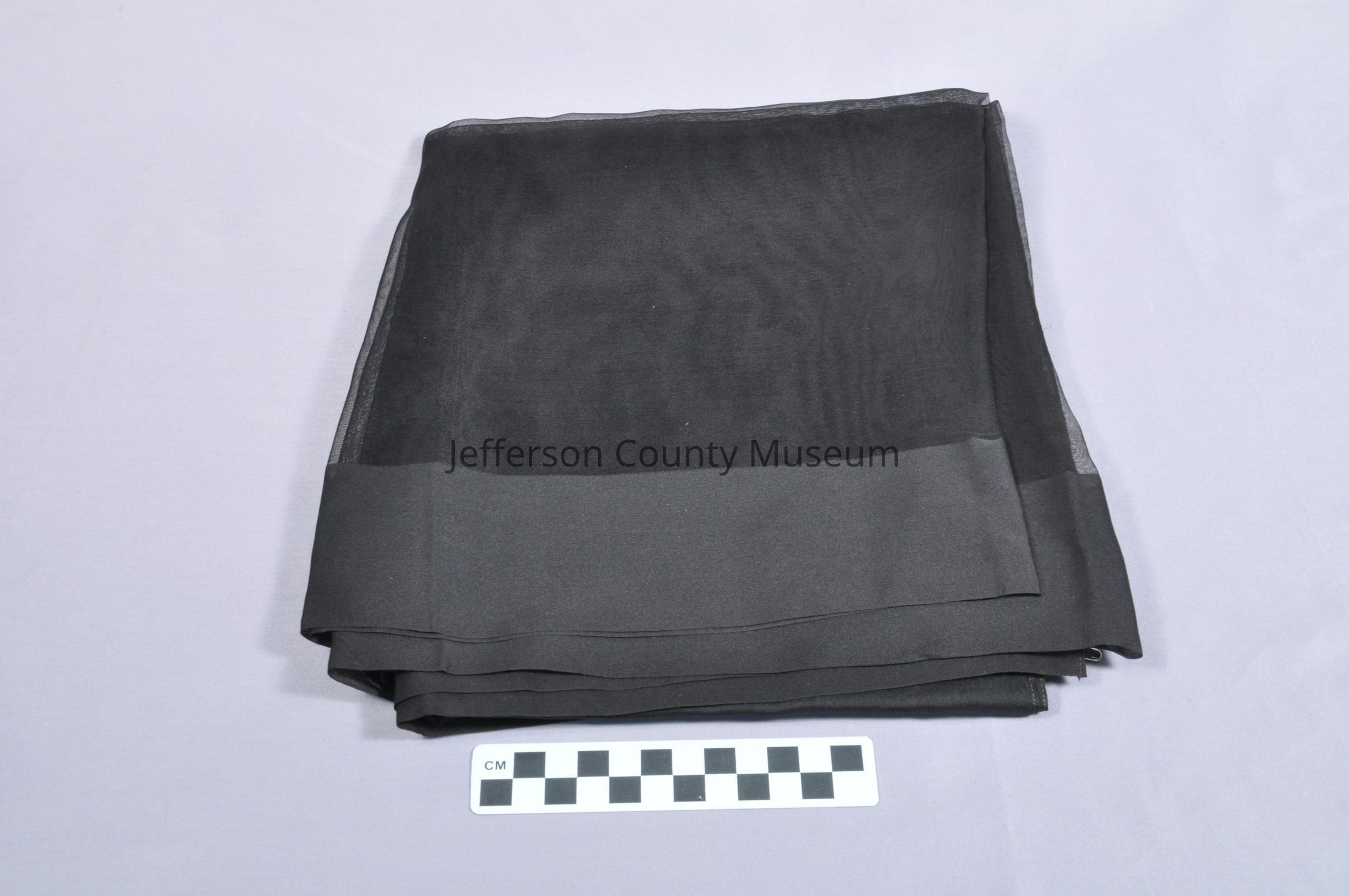 Black silk mourning veil. Two sides have double or triple weave to form a heavy border. Two ends have double weave to form a much wider, heavy border.Acquisition
