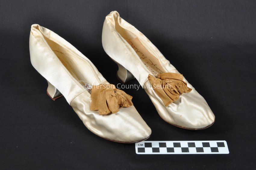 Off-white (probably once white) French heel woman's shoes with dark gold bows on instep. Small nail or tack pounded into right heel. Numbers stamped inside both shoes "8 1101". Right shoe is 1450a and left shoe is 1450b. Inside left shoe is a note "Slippers of Annie Gibson married Dec 26 1894 to Wm. Bainbridge Packett.Acquisition