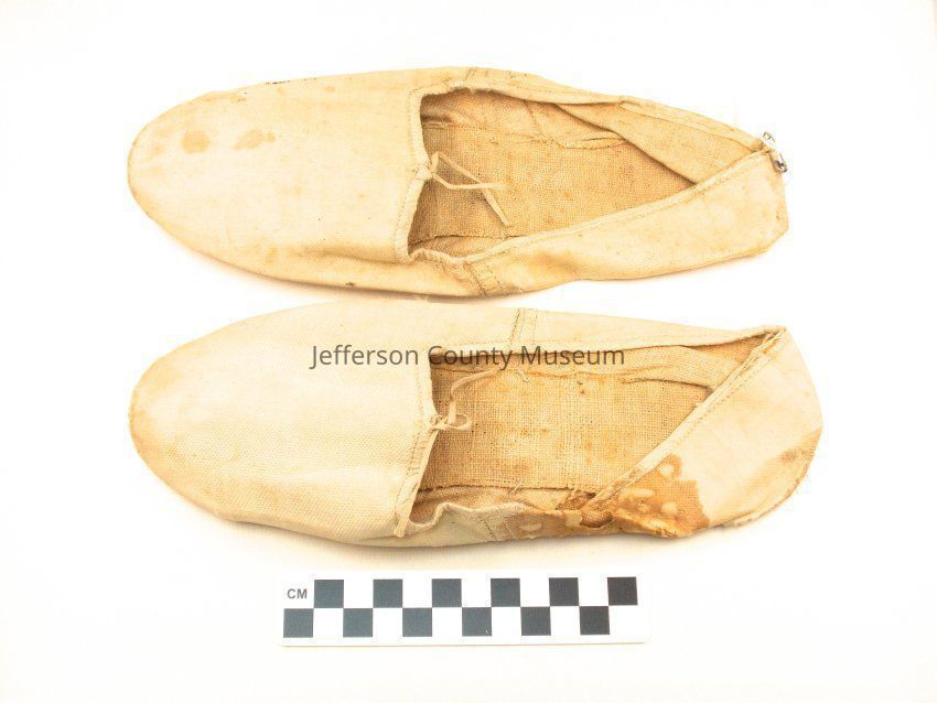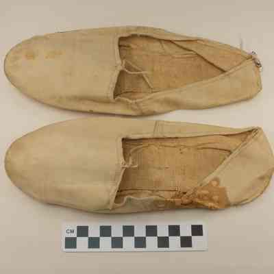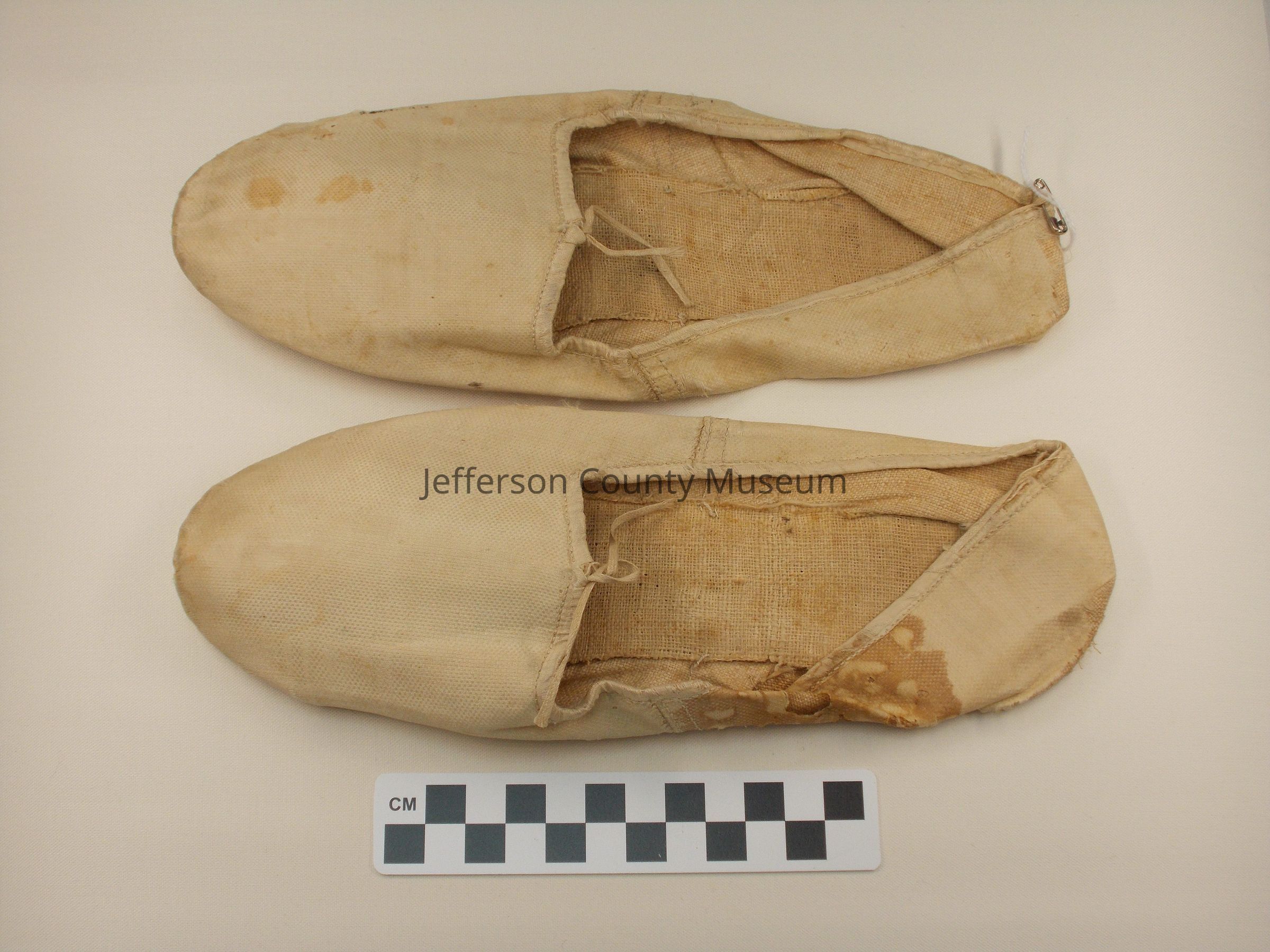 Linen or cotton off-white lady's slippers. Strings at instep for tying. A "G" or "6" is handwritten on bottom of each in ink.Acquisition