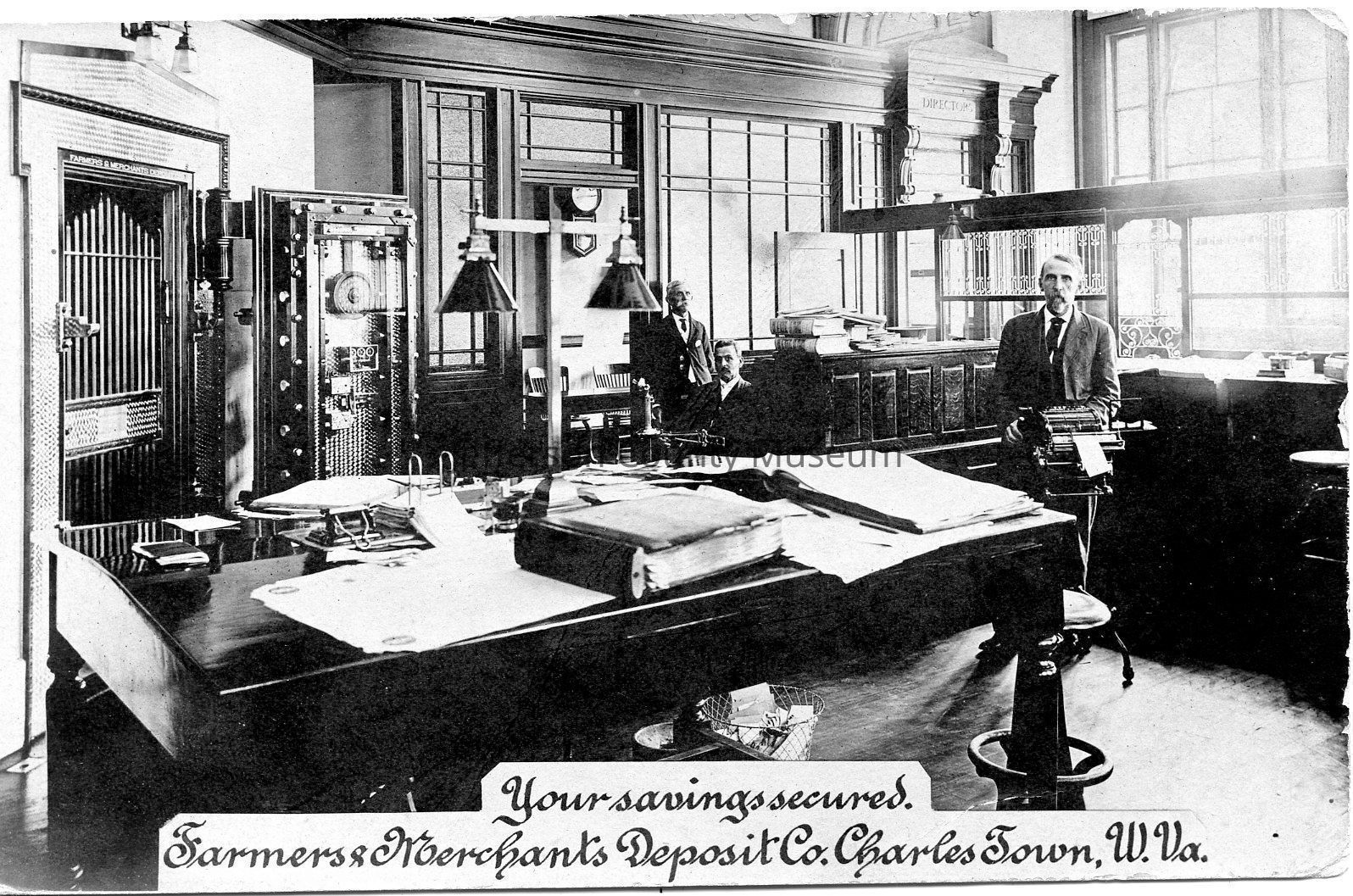Front reads: "Your savings secured. Farmers & Merchants Deposit Co. Charles Town, W. Va."Acquisition