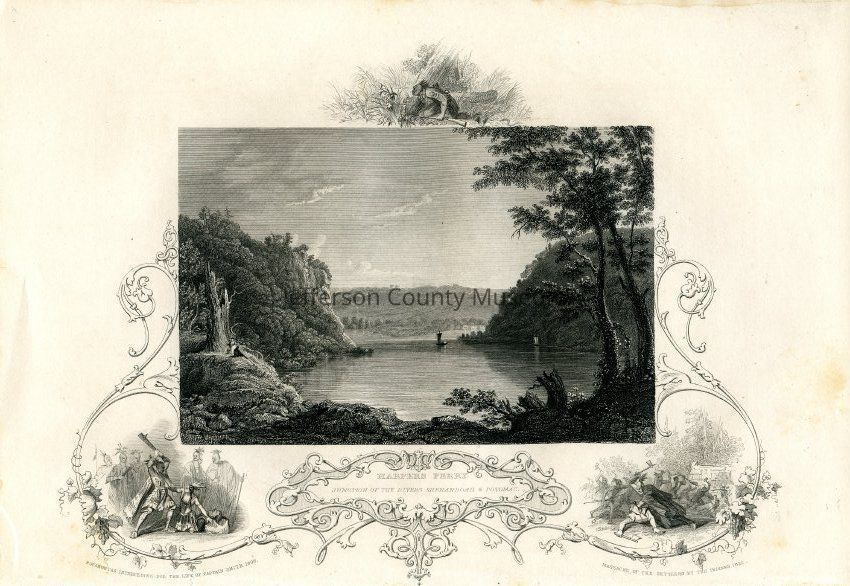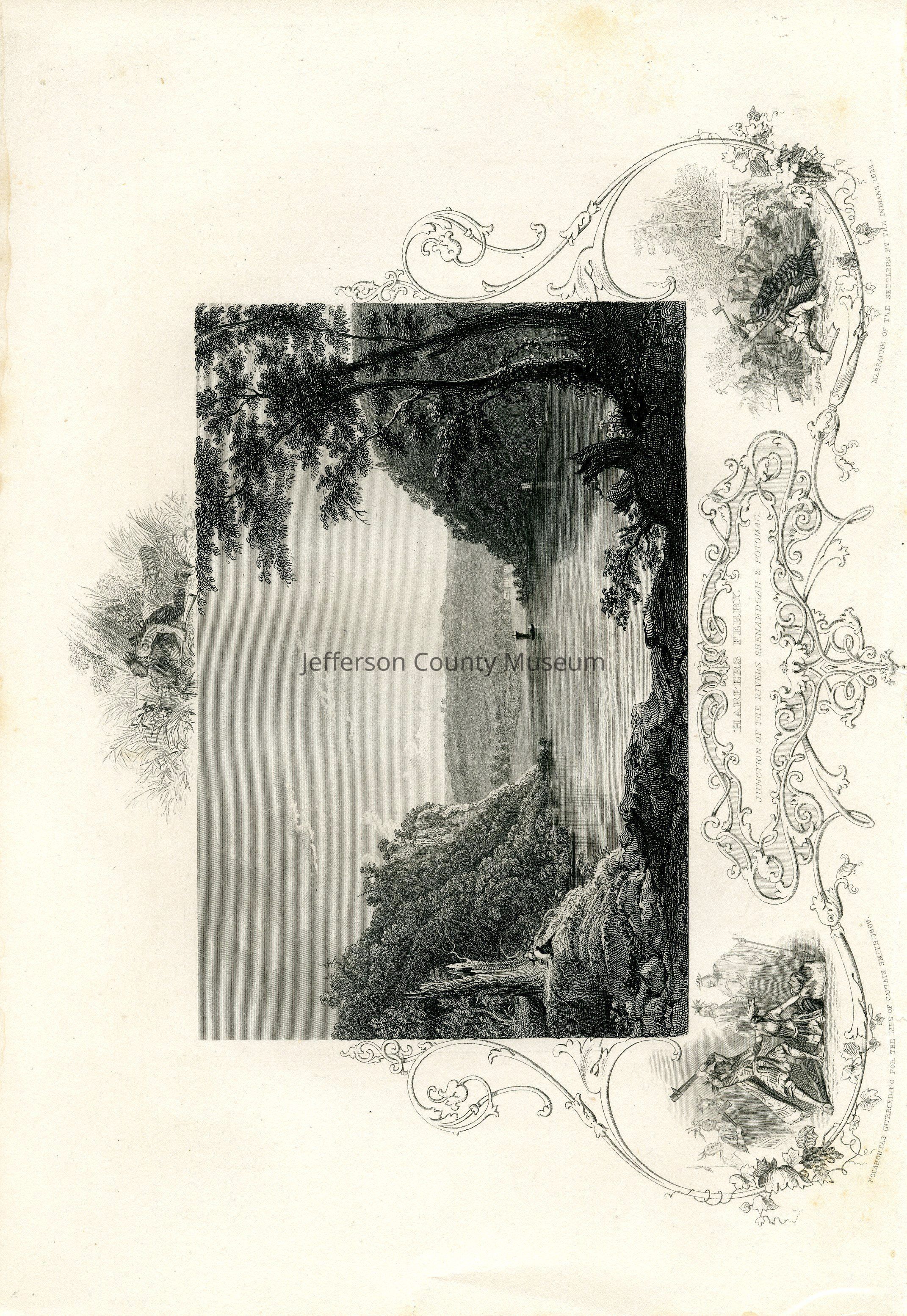 IMG2983-1: Front reads: "Harpers Ferry, Junction of the rivers Shenandoah and Potomac, Pocahontas interceding for the life of Captain Smith, 1606 Massacre of the settlers by the Indians, 1622". size 7.25" x 10.5"