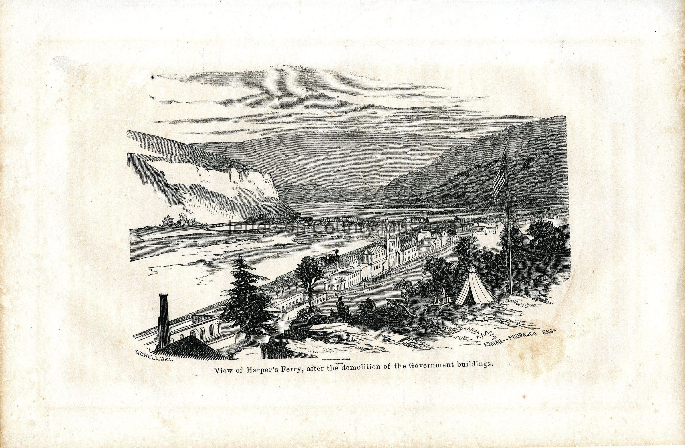 IMG2983-3: Front reads: "View of Harper's Ferry, after the demolition of the Government buildings, Schell del, Adrian - Probasco Eng" size 6.5" x 9.75"