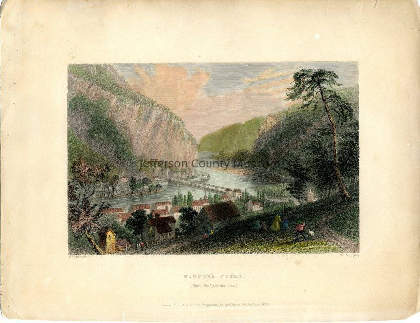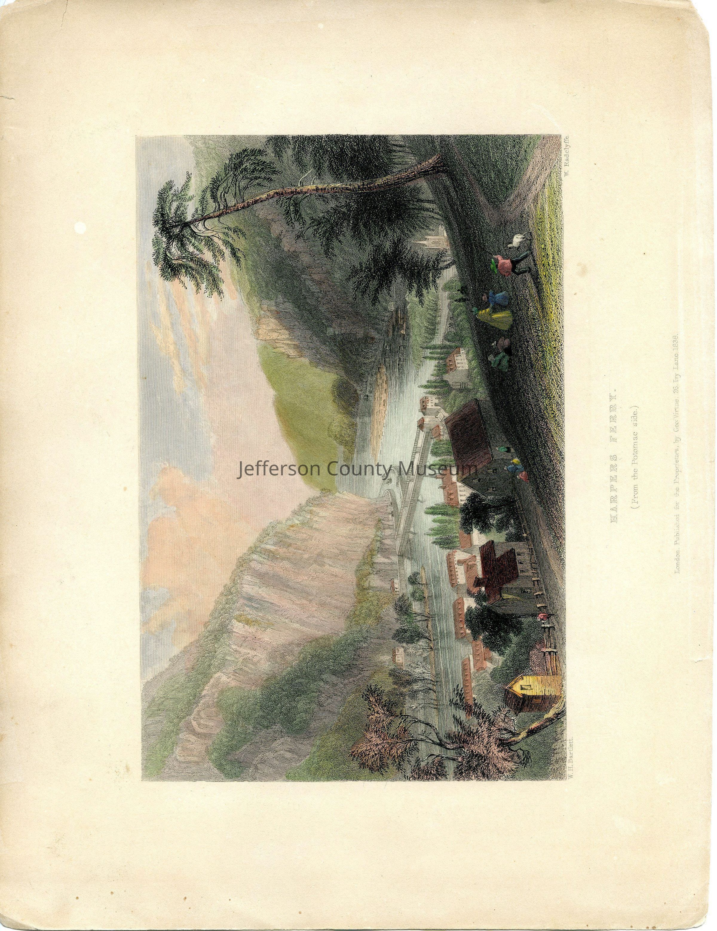 IMG2983-5: Front reads: "Harpers Ferry, From the Potomac side, London, Published for the Proprietors by Geo. Virtue, 26 Ivy Lane, 1838, W.H. Bartlett, W. Radclyffe" Verso reads: Bartlett 1840. size 8.25" x 10.75"