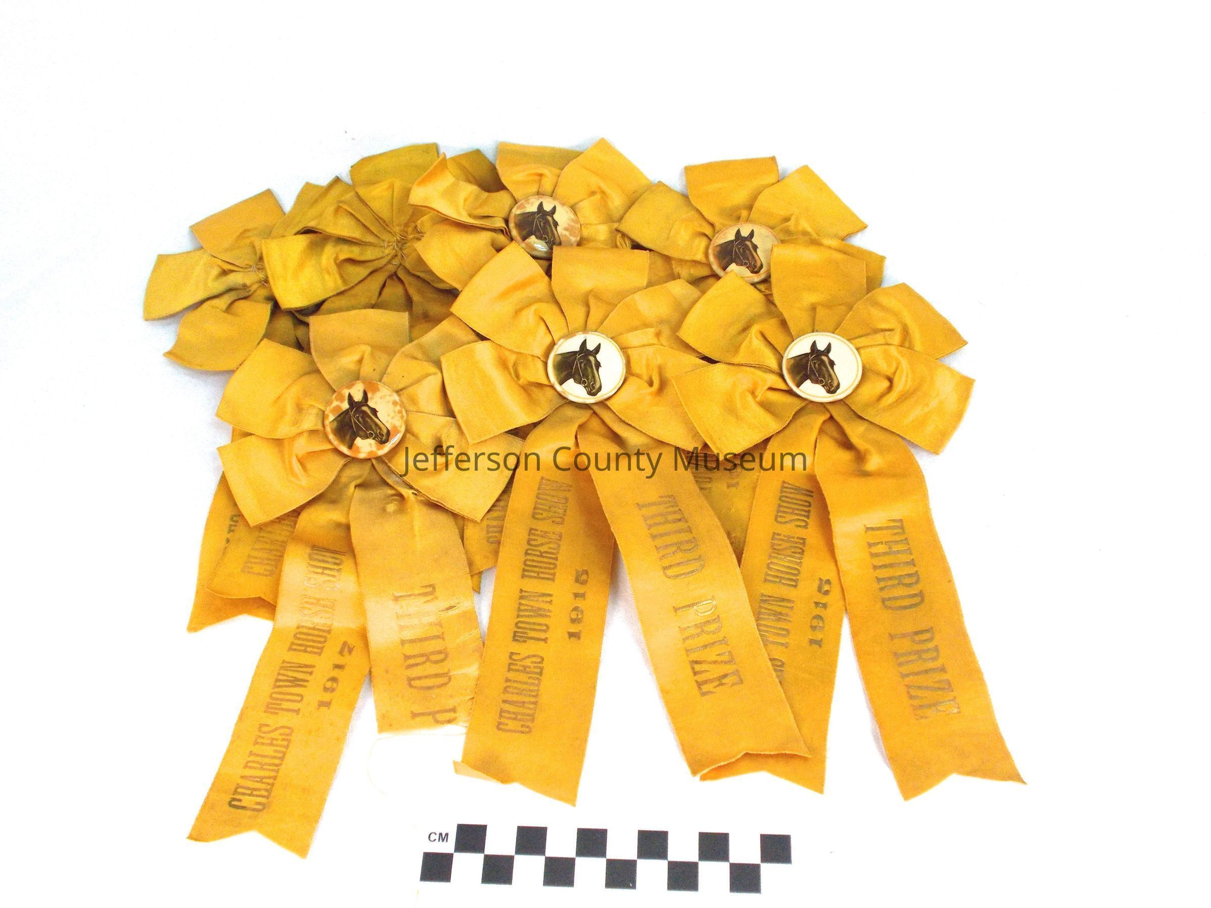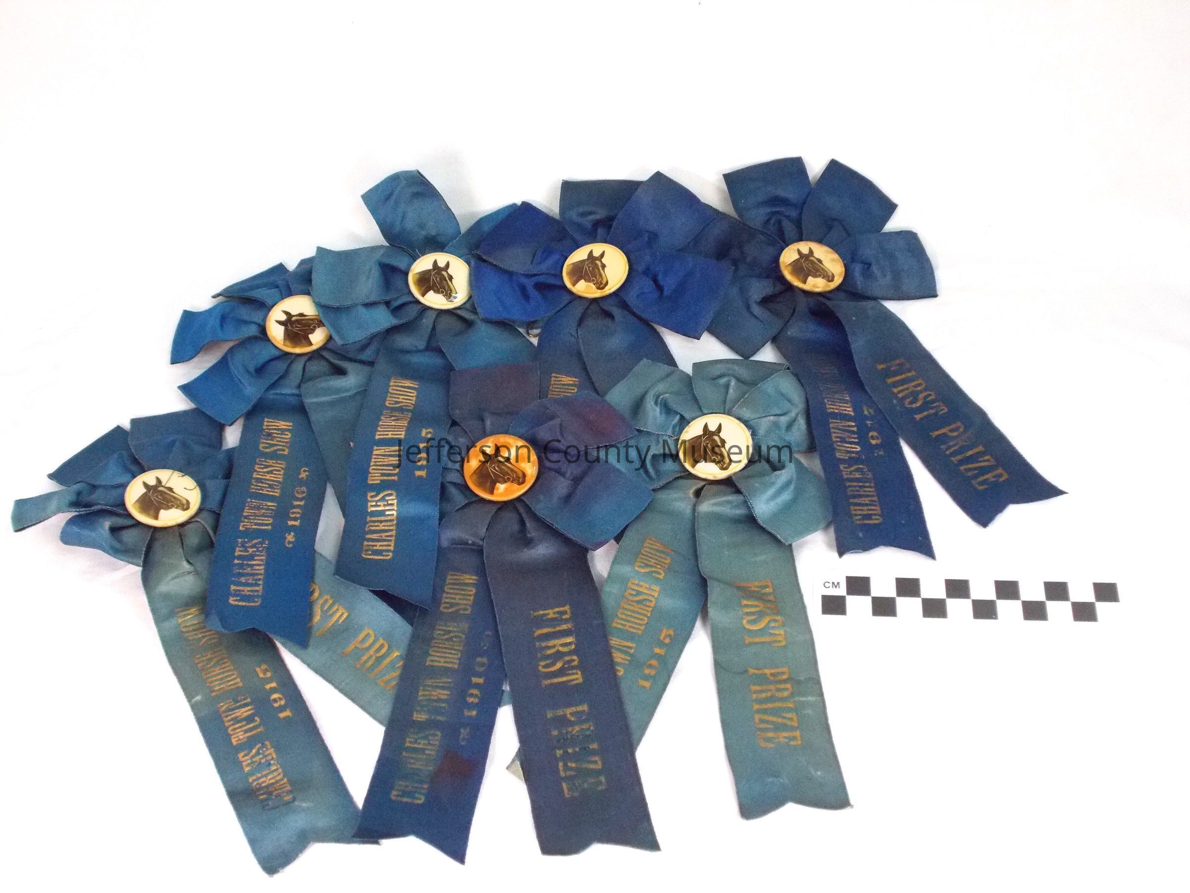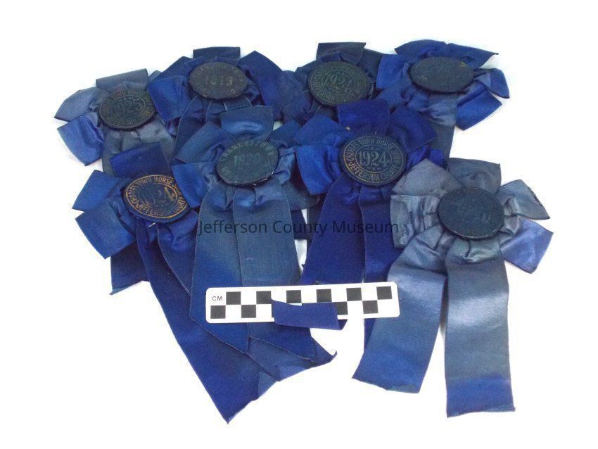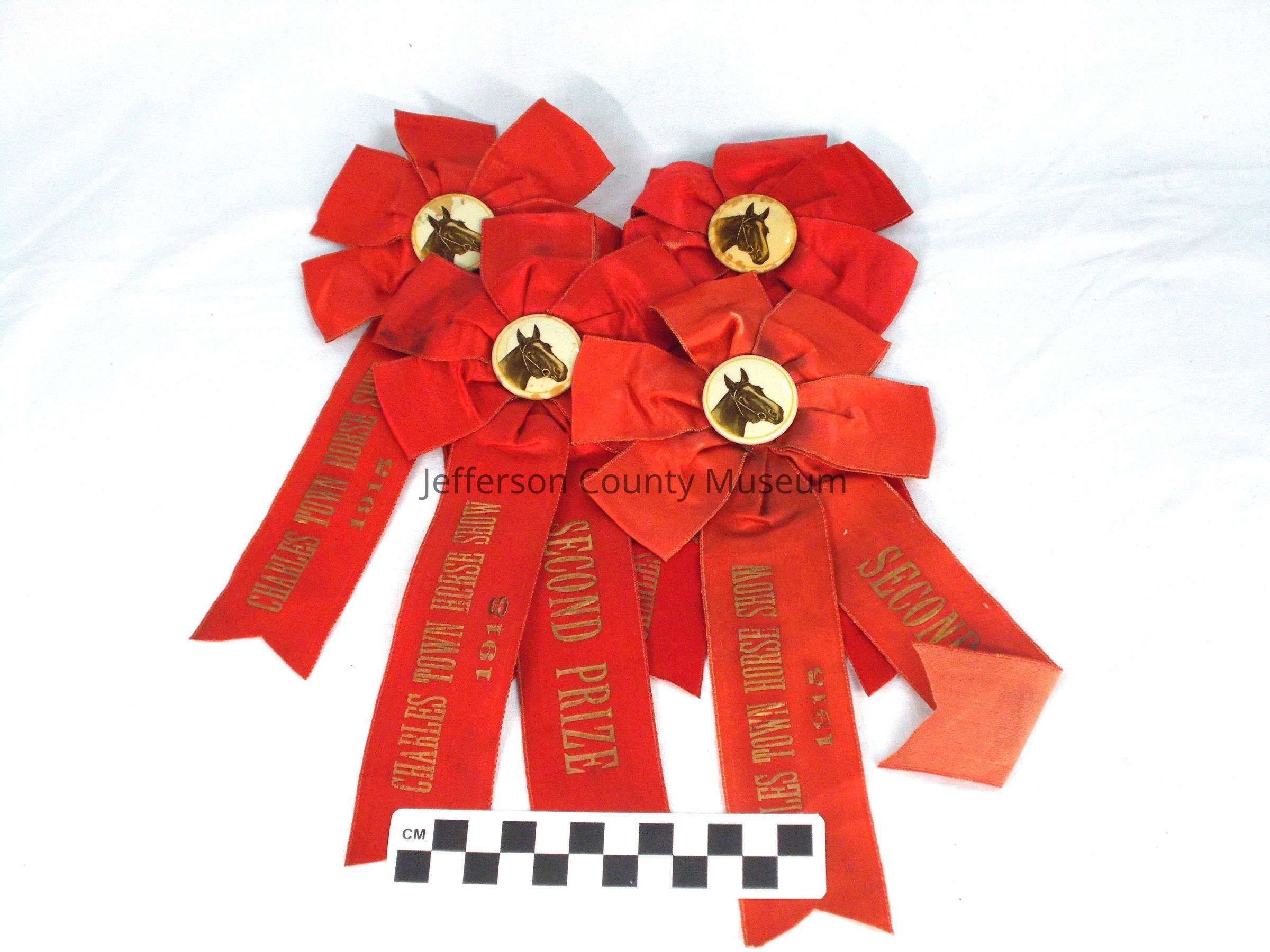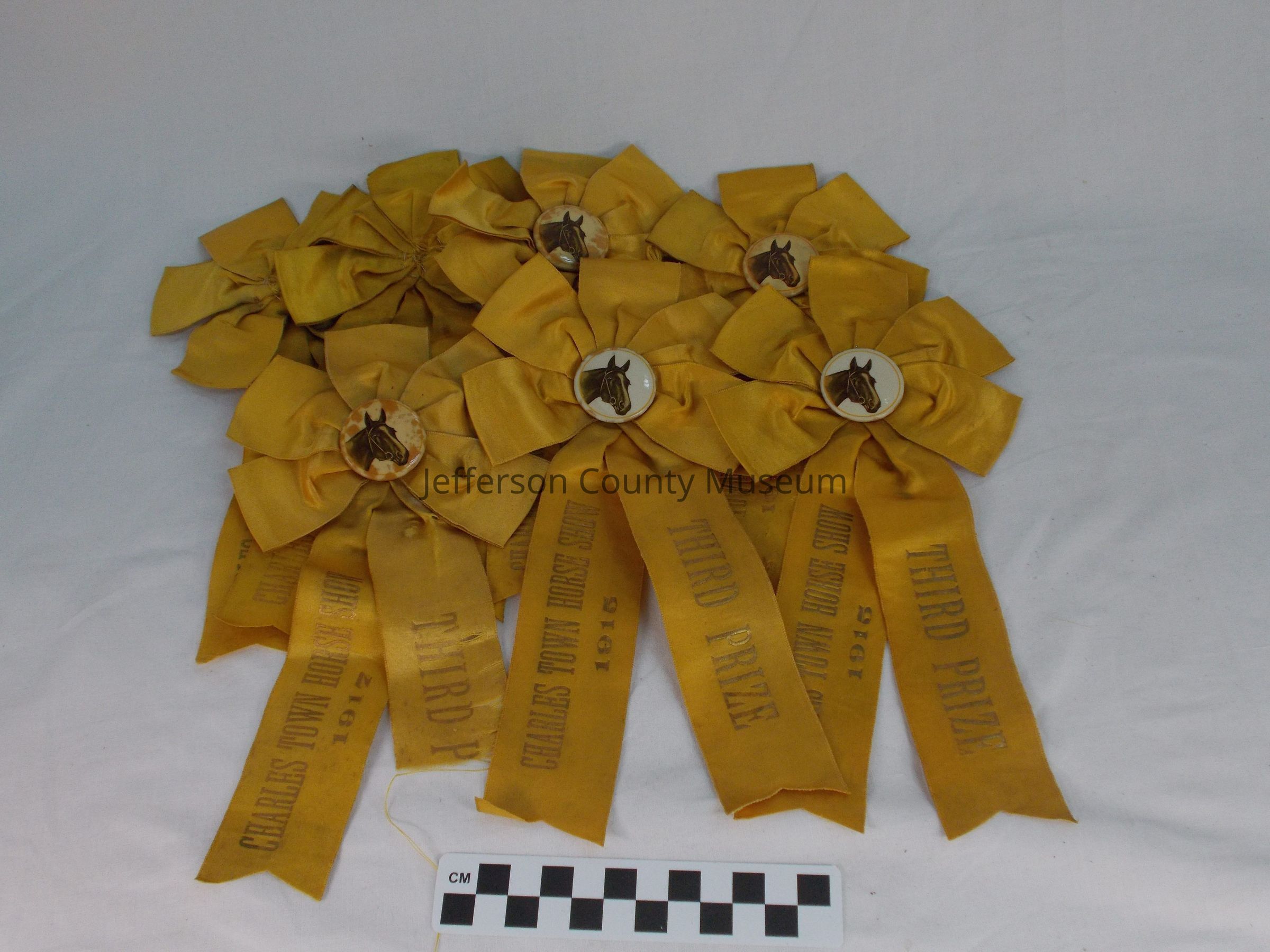52 horse show ribbons, 15 blue, 19 red, 13 yellow and 5 white. All are from the Charles Town Horse Show. Most of them say "CHARLES TOWN HORSE SHOW" with the date and the type of prize. Some have a picture of a horse on a button and others have a round disk in the center with "CHARLES TOWN HORSE SHOW JEFFERSON COUNTY" and the year in the center. One yellow, one red and one blue ribbon is on display in Case 31 as of Feb. 2025.Acquisition