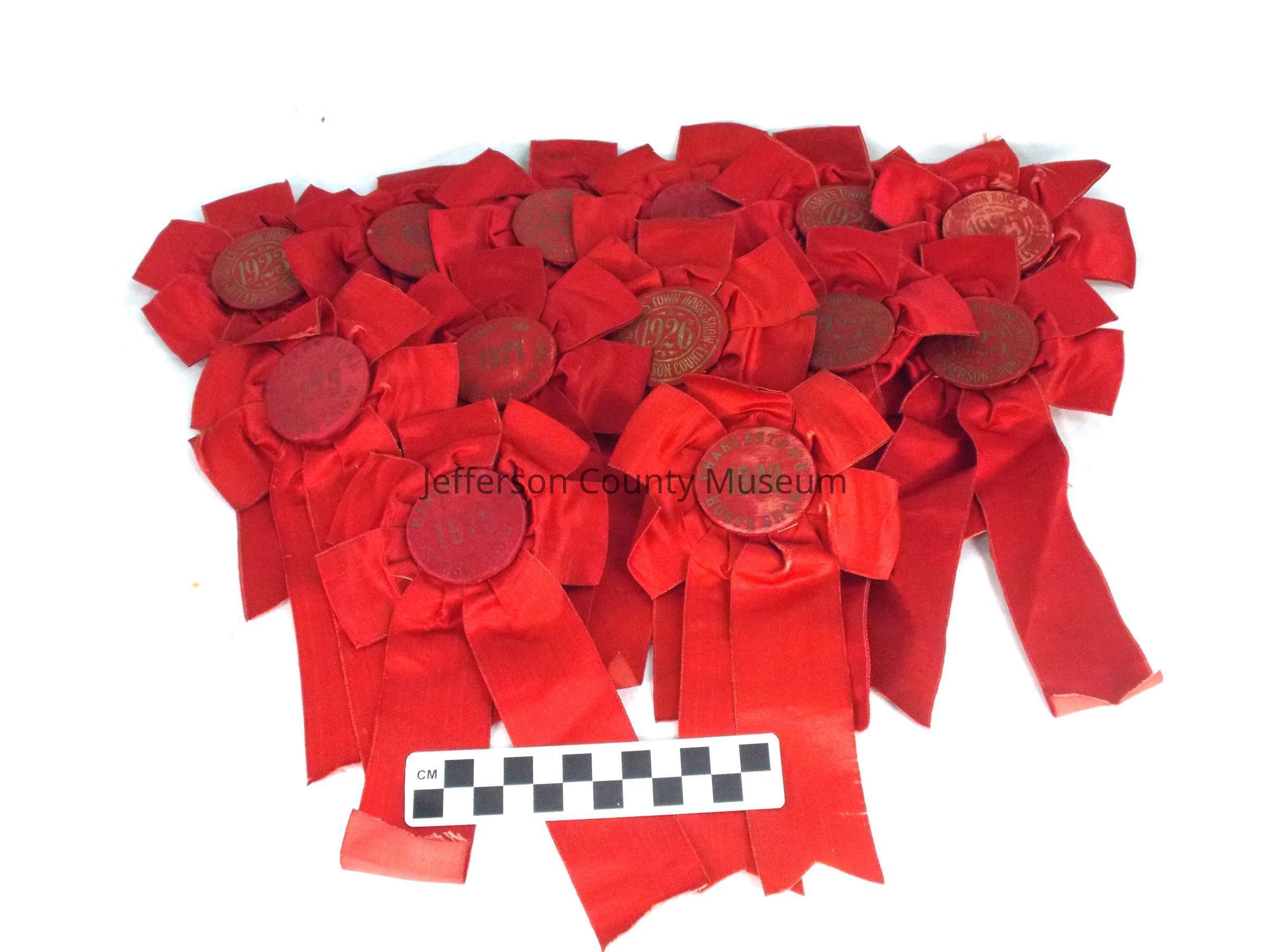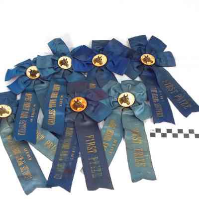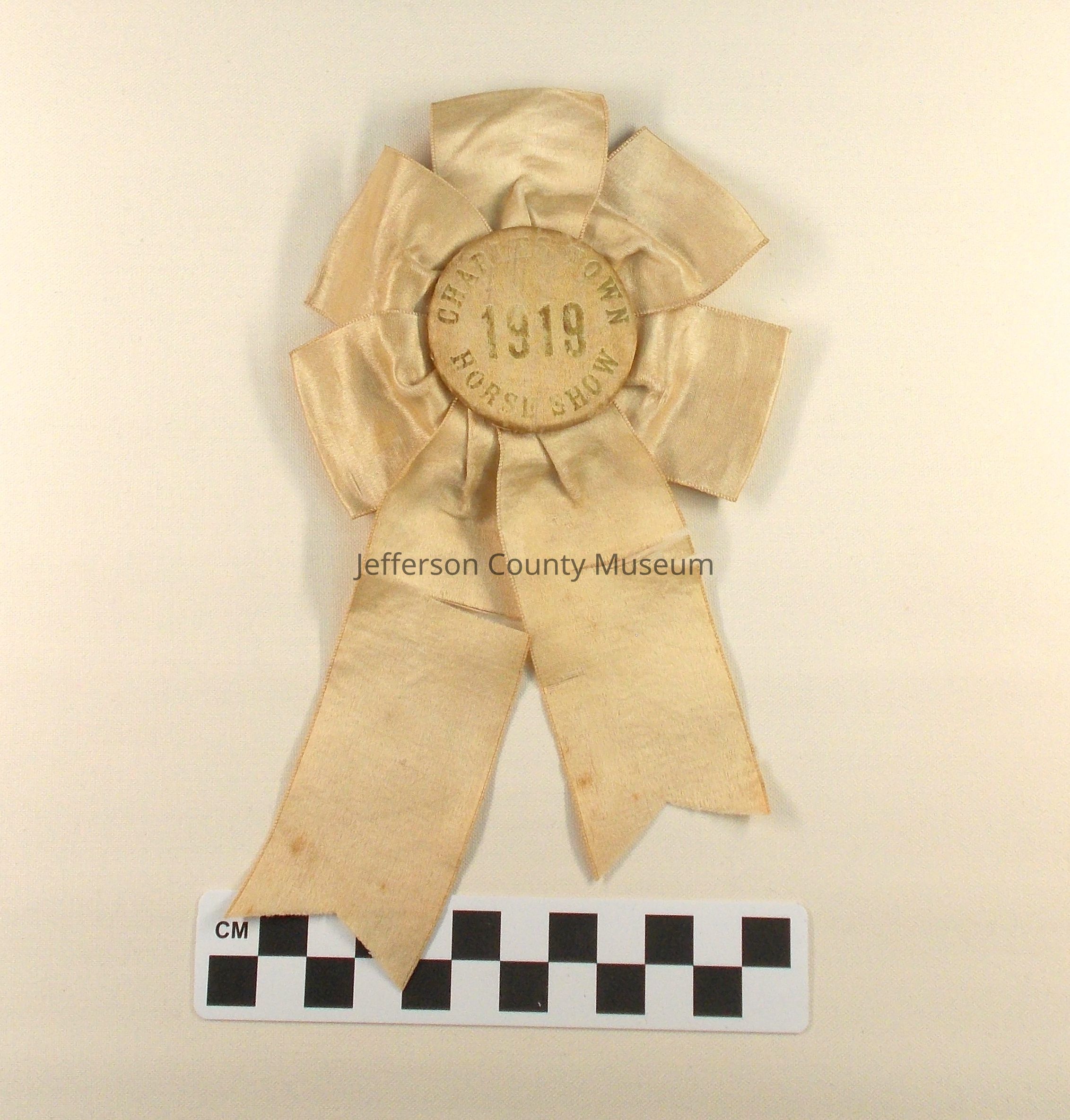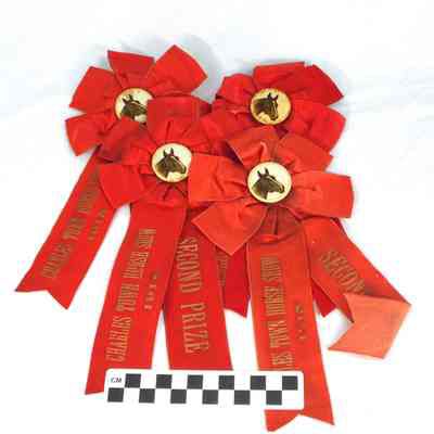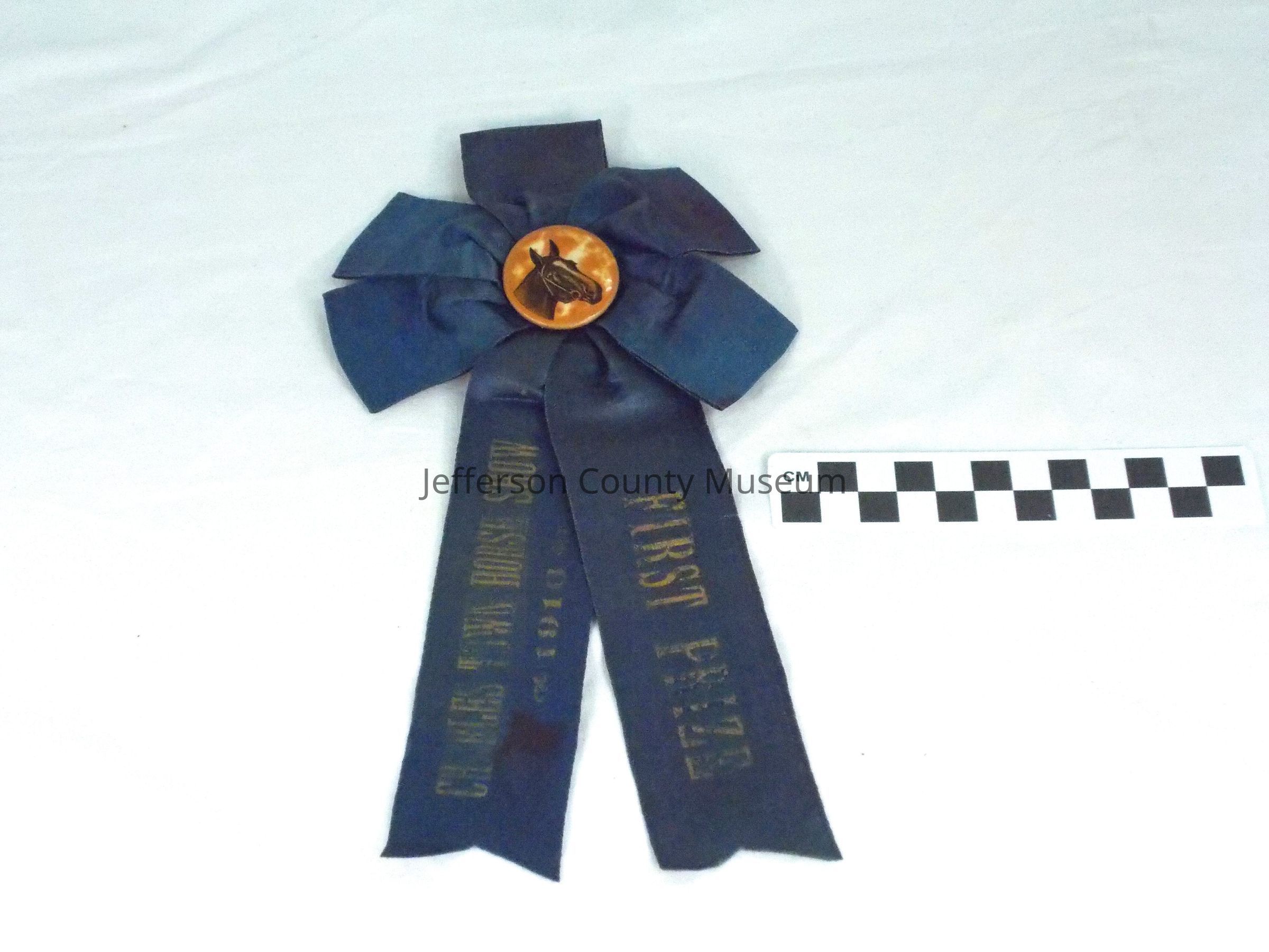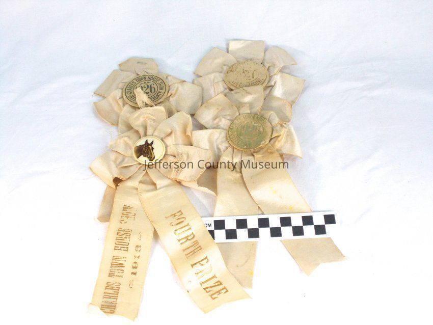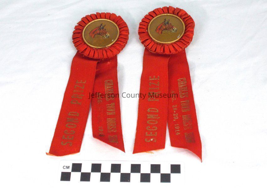 52 horse show ribbons, 15 blue, 19 red, 13 yellow and 5 white. All are from the Charles Town Horse Show. Most of them say "CHARLES TOWN HORSE SHOW" with the date and the type of prize. Some have a picture of a horse on a button and others have a round disk in the center with "CHARLES TOWN HORSE SHOW JEFFERSON COUNTY" and the year in the center. One yellow, one red and one blue ribbon is on display in Case 31 as of Feb. 2025.Acquisition