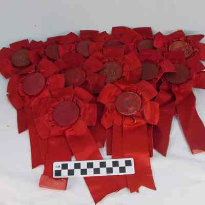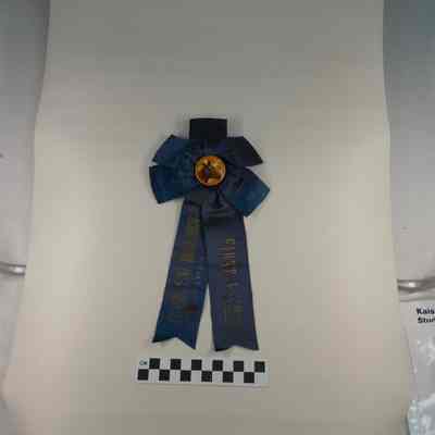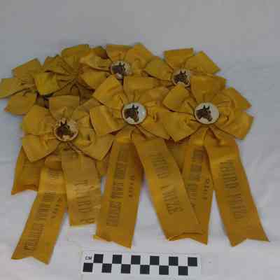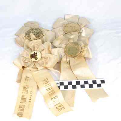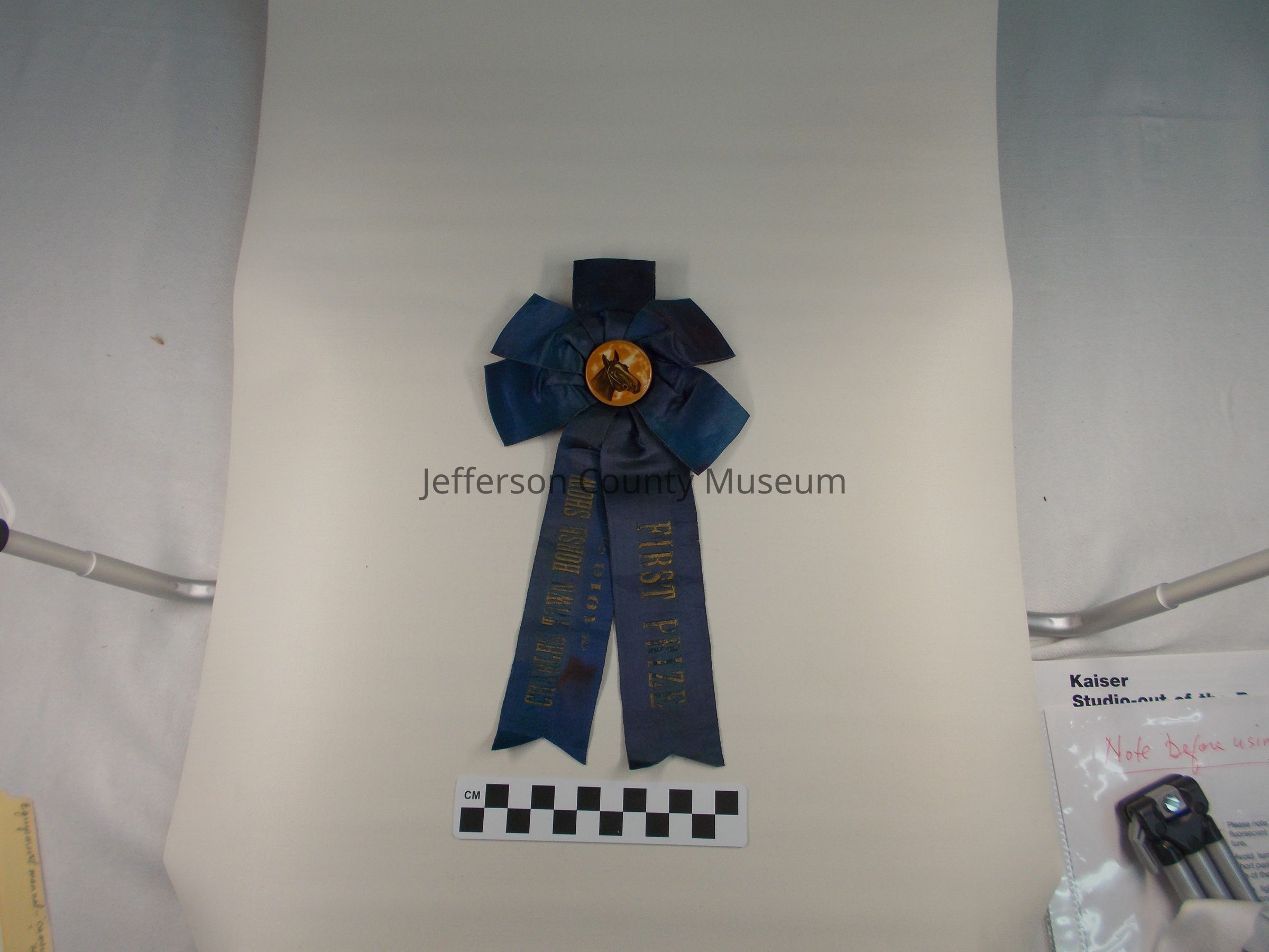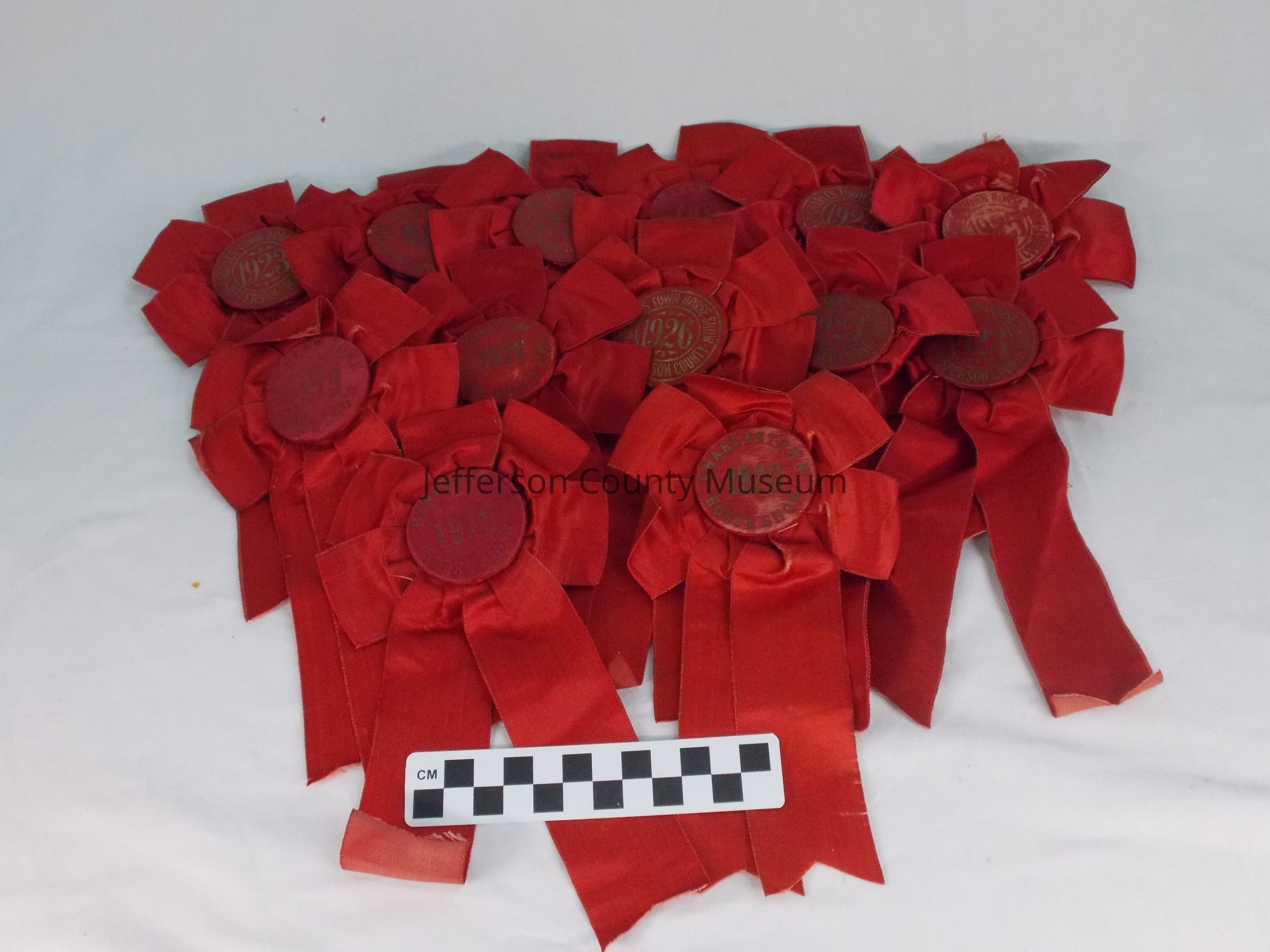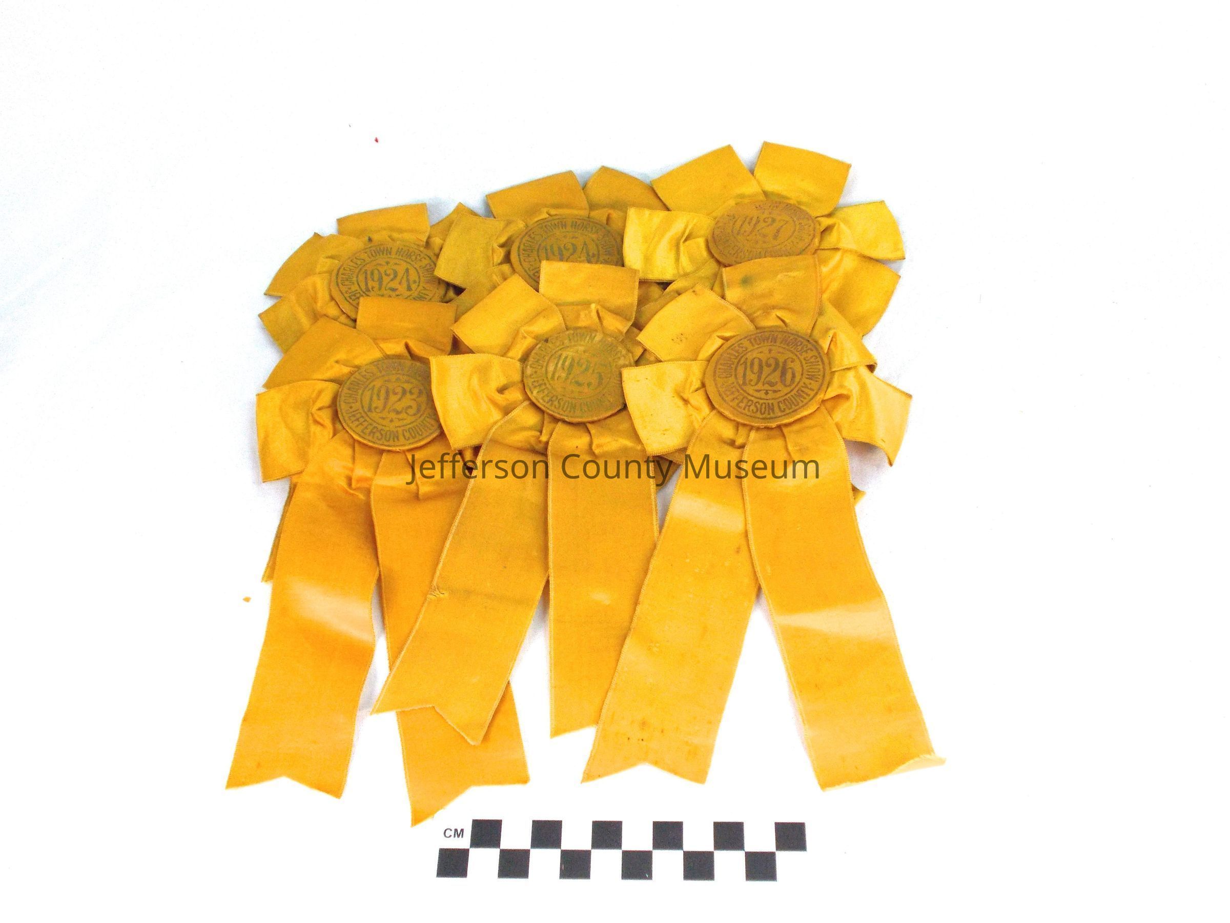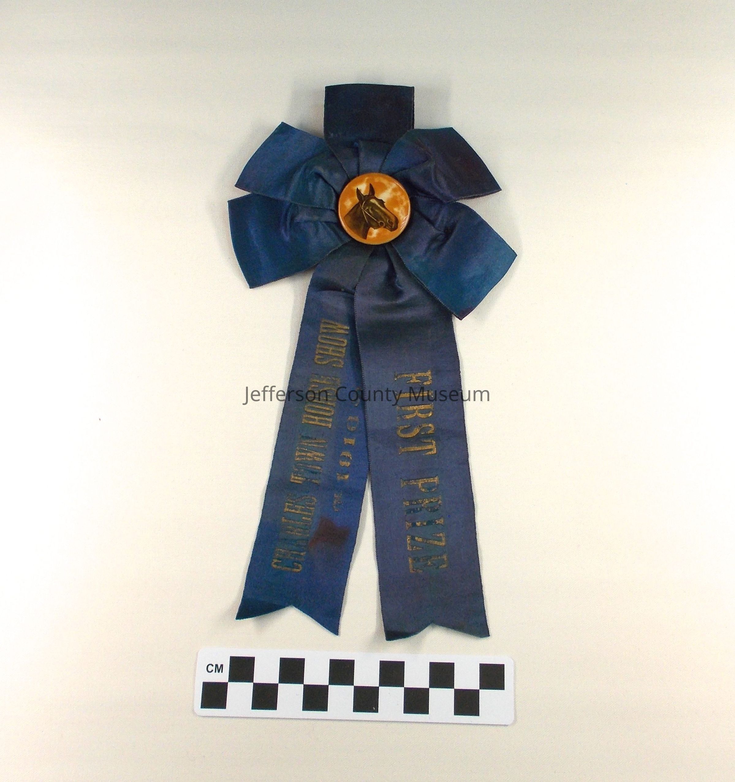 52 horse show ribbons, 15 blue, 19 red, 13 yellow and 5 white. All are from the Charles Town Horse Show. Most of them say "CHARLES TOWN HORSE SHOW" with the date and the type of prize. Some have a picture of a horse on a button and others have a round disk in the center with "CHARLES TOWN HORSE SHOW JEFFERSON COUNTY" and the year in the center. One yellow, one red and one blue ribbon is on display in Case 31 as of Feb. 2025.Acquisition