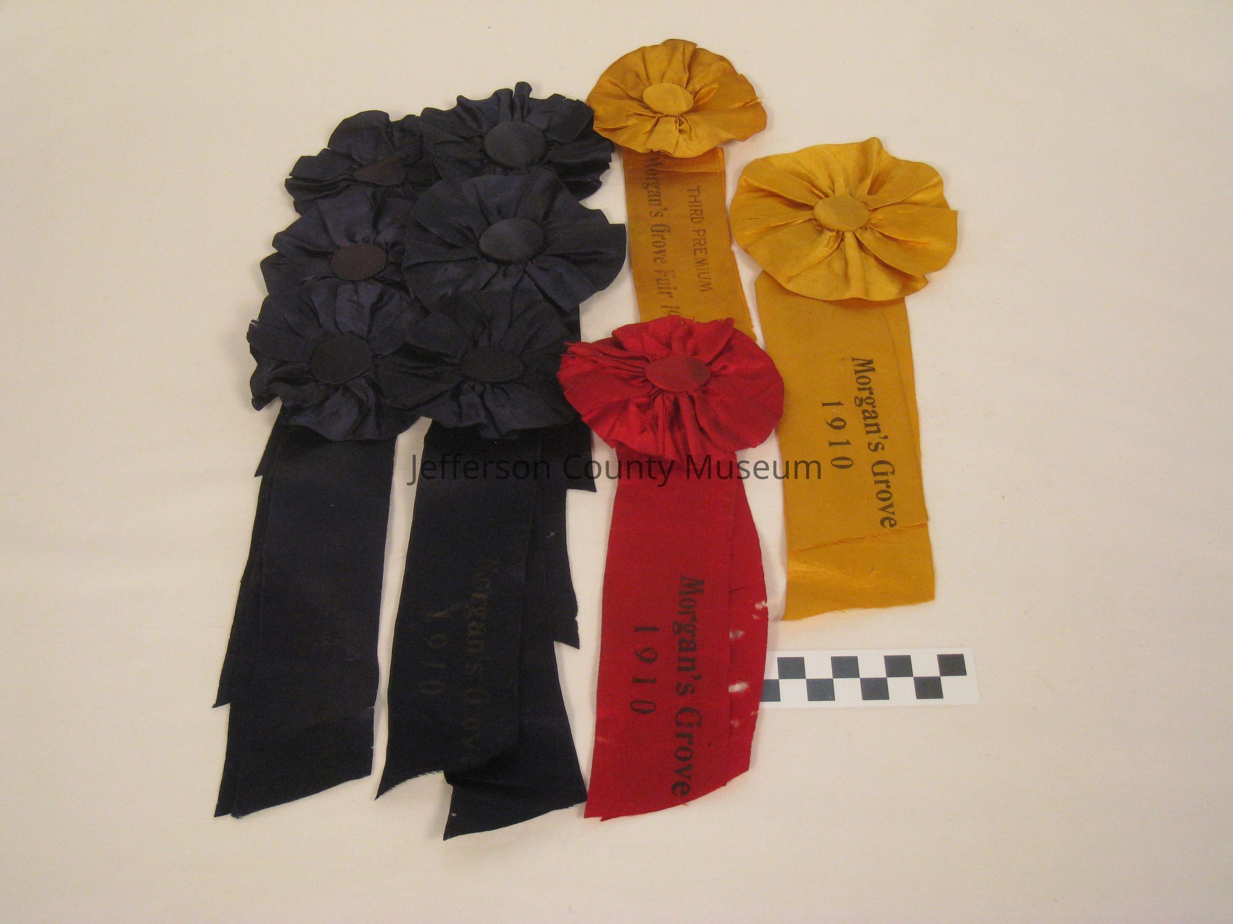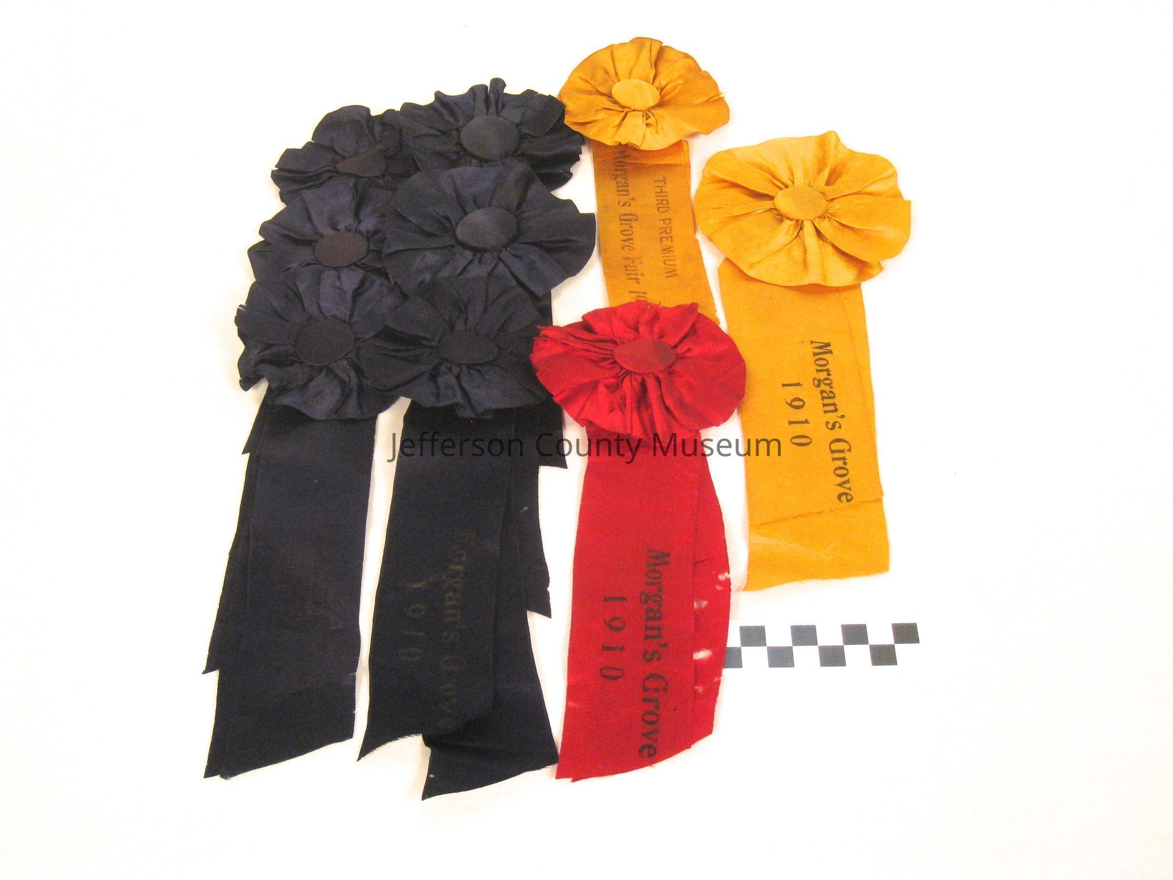 Nine horse show ribbons, 2 yellow, 1 red and 6 blue. All are a simple round ribbon with a button in the center. On the tail of one yellow and one red is "Morgans Grove 1910". The remainder are not legible.Acquisition