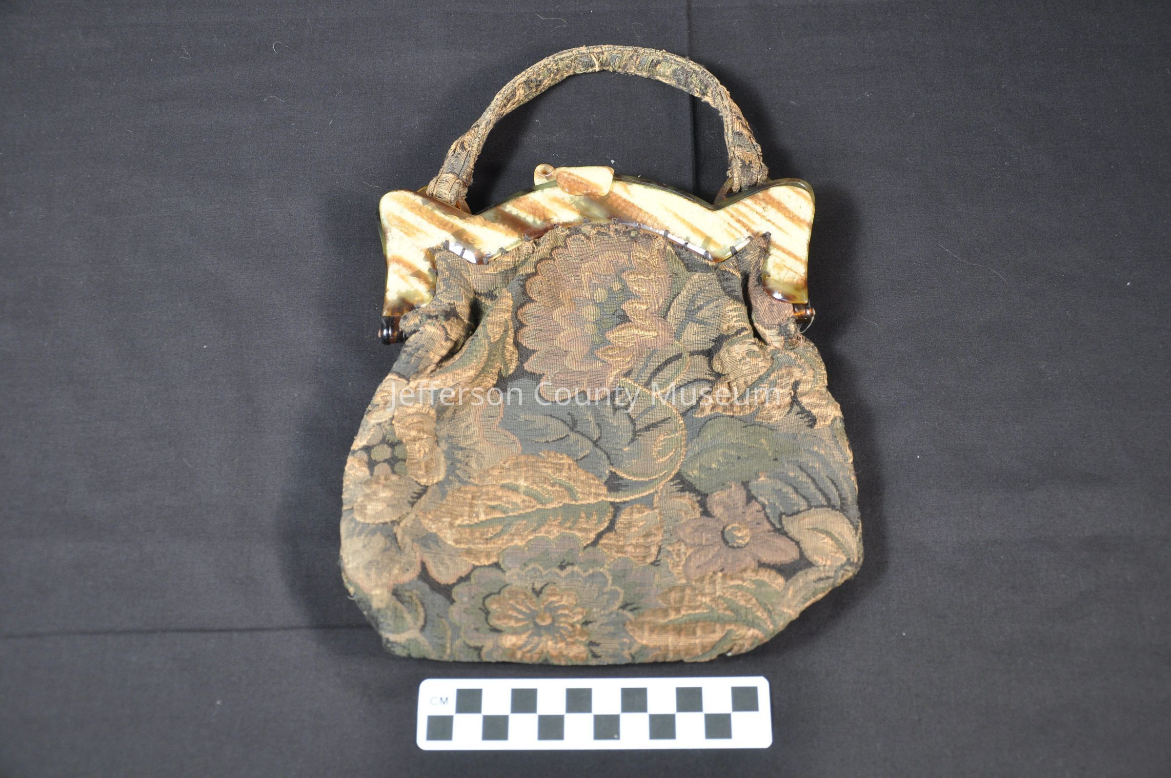 Carpet type purse with tortoise-shell closure at top. Also a short strap for carrying. Decoration on purse is flowers and leaves of dark green and tan.Acquisition