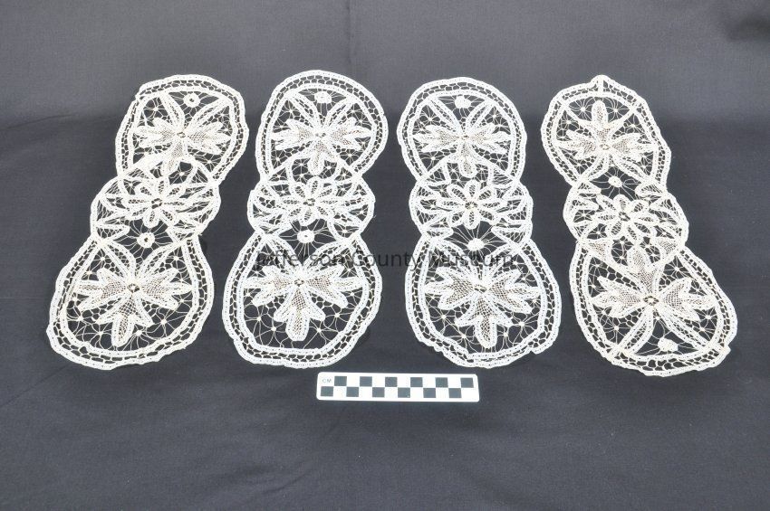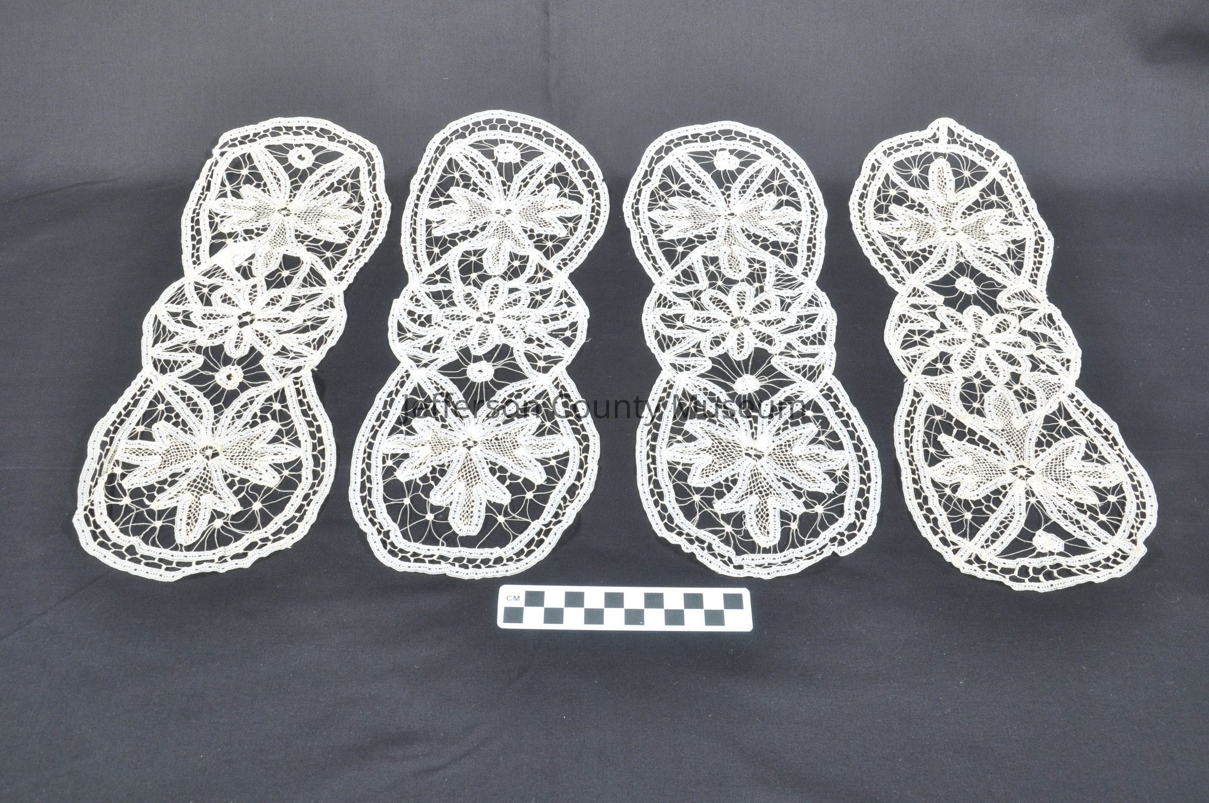 Four handmade doilies. Some thread is darker than others. Round design in center. 4 doilies stored in location with similiar doilies numbers 610 and 202. Each of 4 is seperated by individual pieces of tissue paper.Acquisition