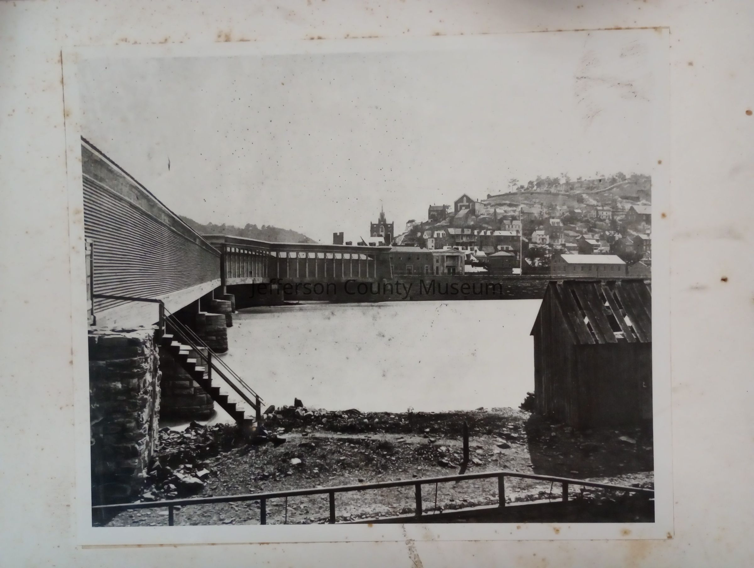 Mounted black and white photograph taken from the Maryland side of the Potomac next to the B&O railroad bridge later destroyed during the Civil War. Across the river, the lower town can be seen.Photograph Details