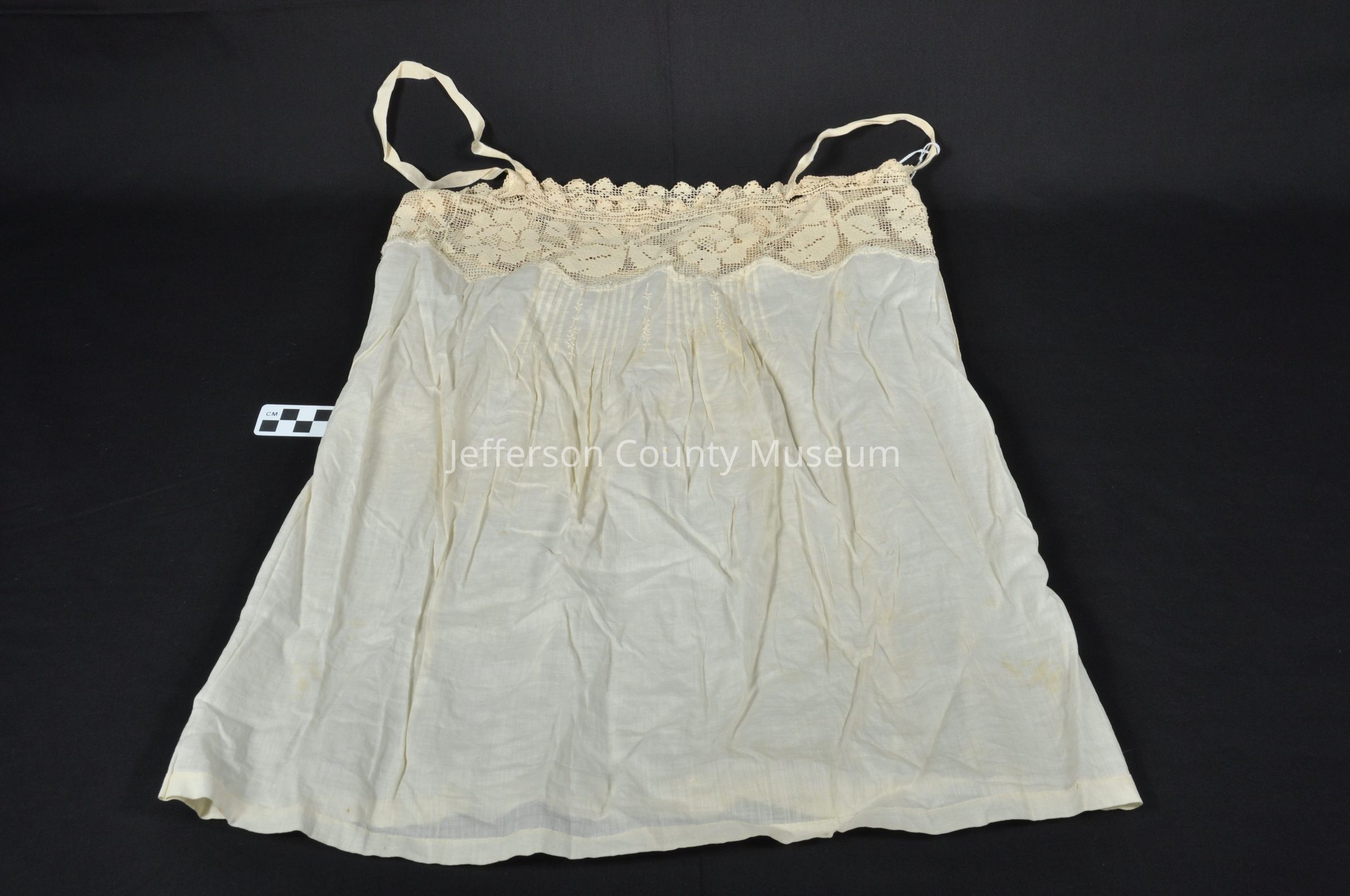 Off-white chemise was probably once white, thin straps, lace at top. Gathered in front near top with three flower-like designs down front.Acquisition
