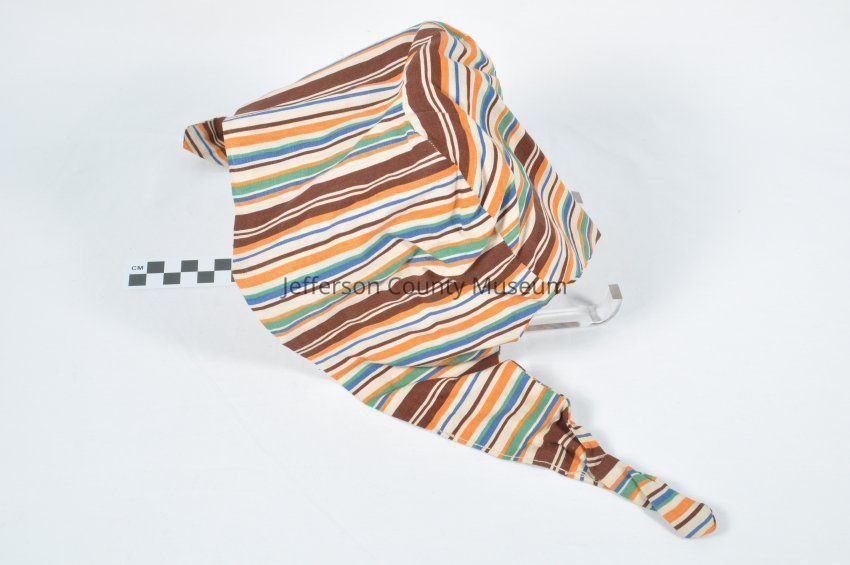 Woman's cotton bonnet. Striped colors are dark brown, tan, blue, orange and green. Tails for tying under chin. Label inside has picture of a woman in bonnet and says "Katushka U.S. PAT. NO. 107553". From the Estate of Frances Packette Todd.Acquisition