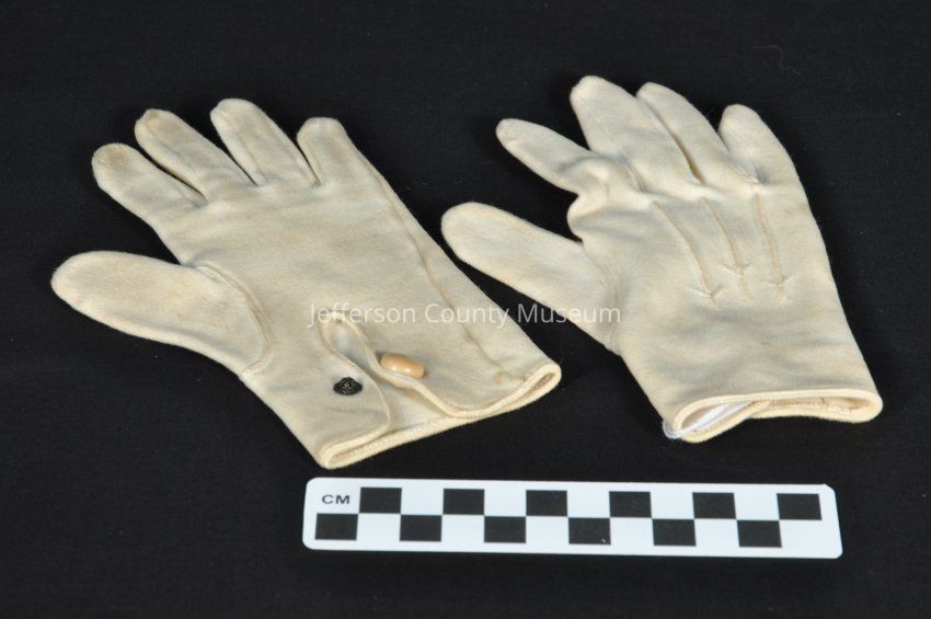 Cotton, off-white child's gloves with snap buttons at wrist.Acquisition