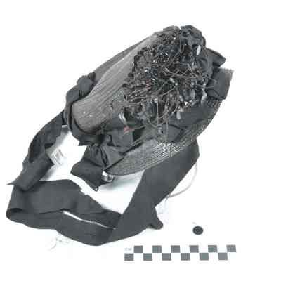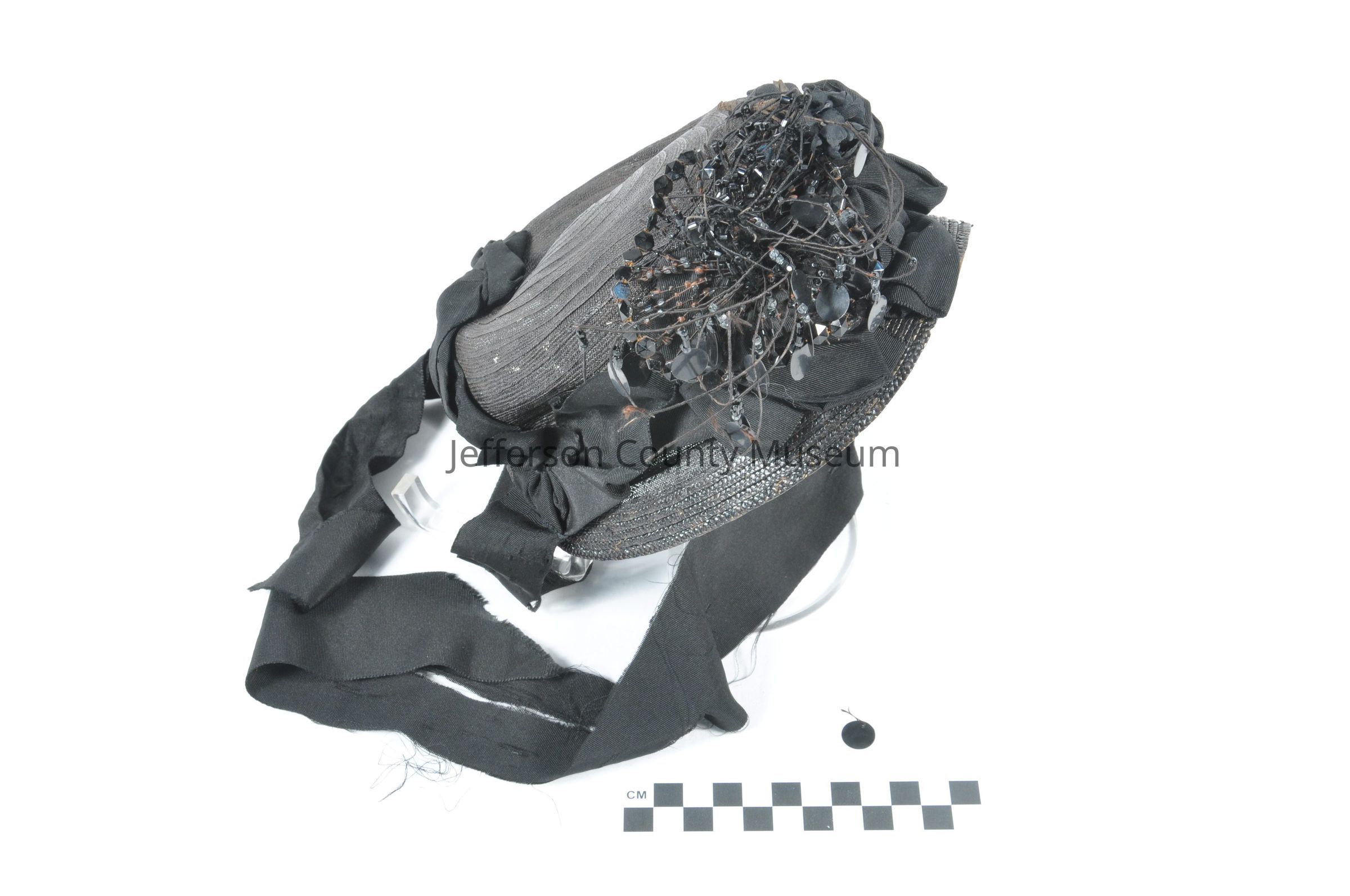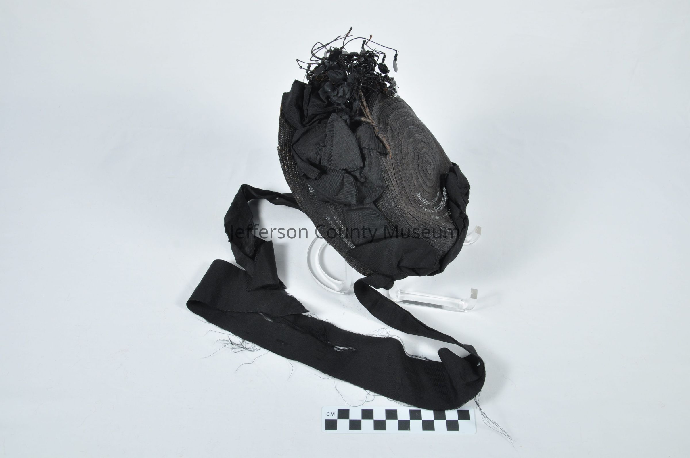 Small, black lady's straw hat with bow decoration on front and beaded wire decoration with black disk dangles. Long black ribbon for tying. From the Estate of Frances Packette Todd.Acquisition