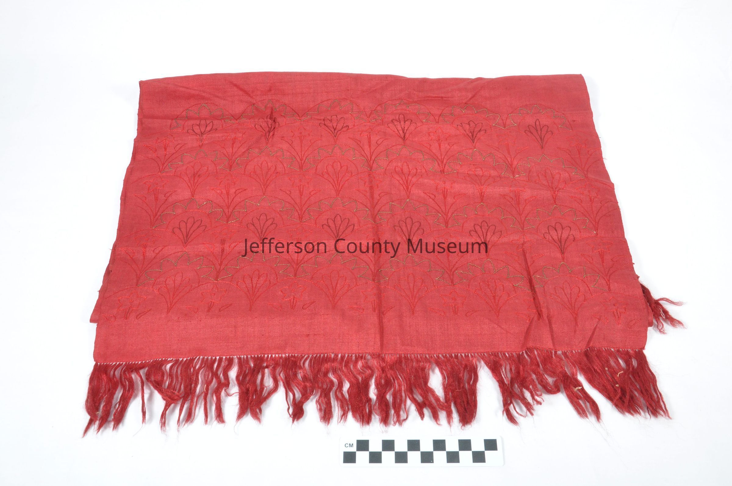 Maroon, thin material (possibly silk) table cover with red and brown sewn in designs on each end. Fringes on ends.Acquisition