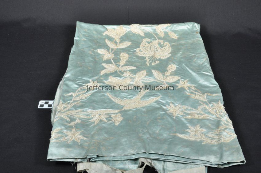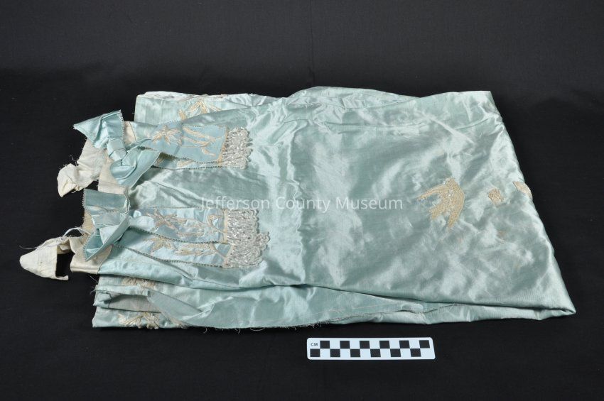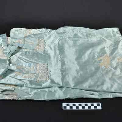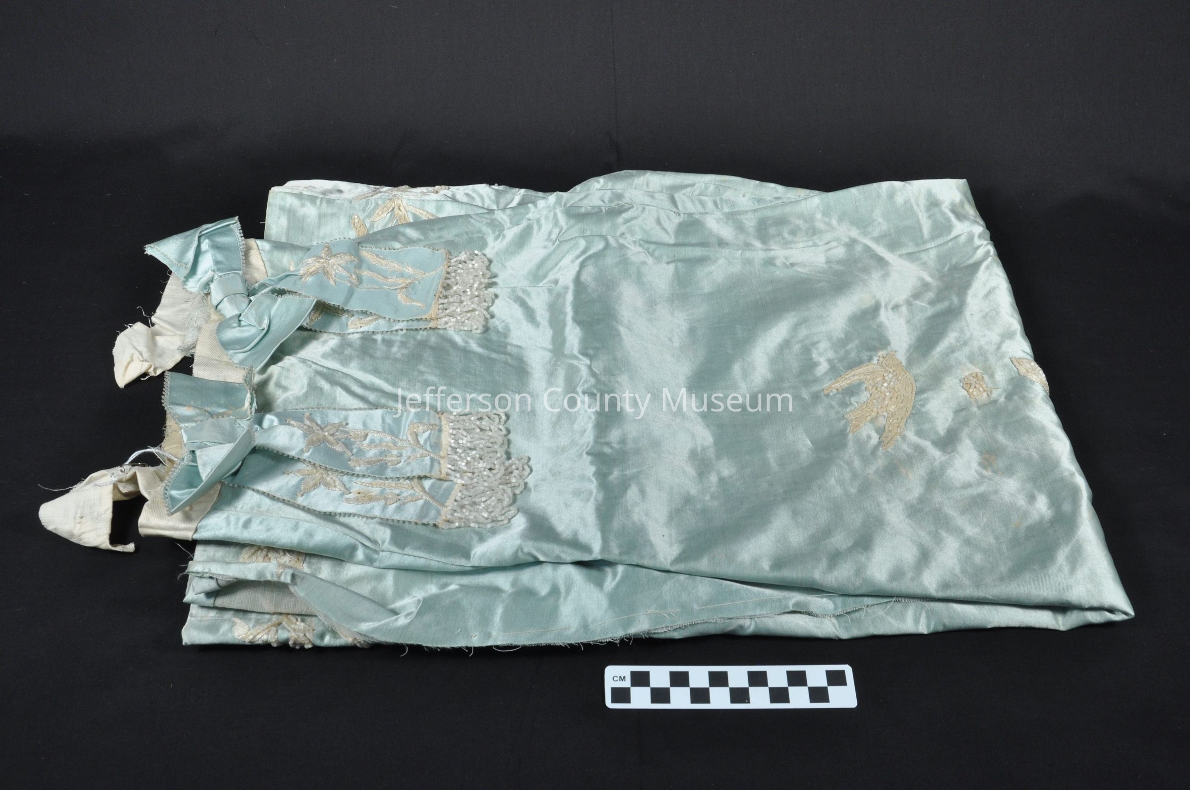 Light blue silk piece of material with beads sewn on in designs with birds, flowers and leaves. Backed with cotton material. Possibly the front piece of a dress or skirt. Two bows attached at top by safety pin have flower bead design and bead dangles at end of bow.Acquisition