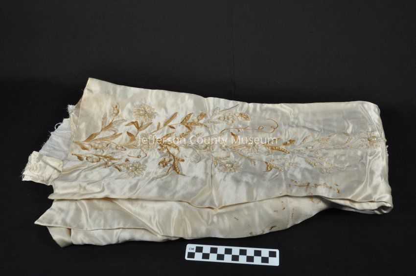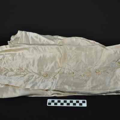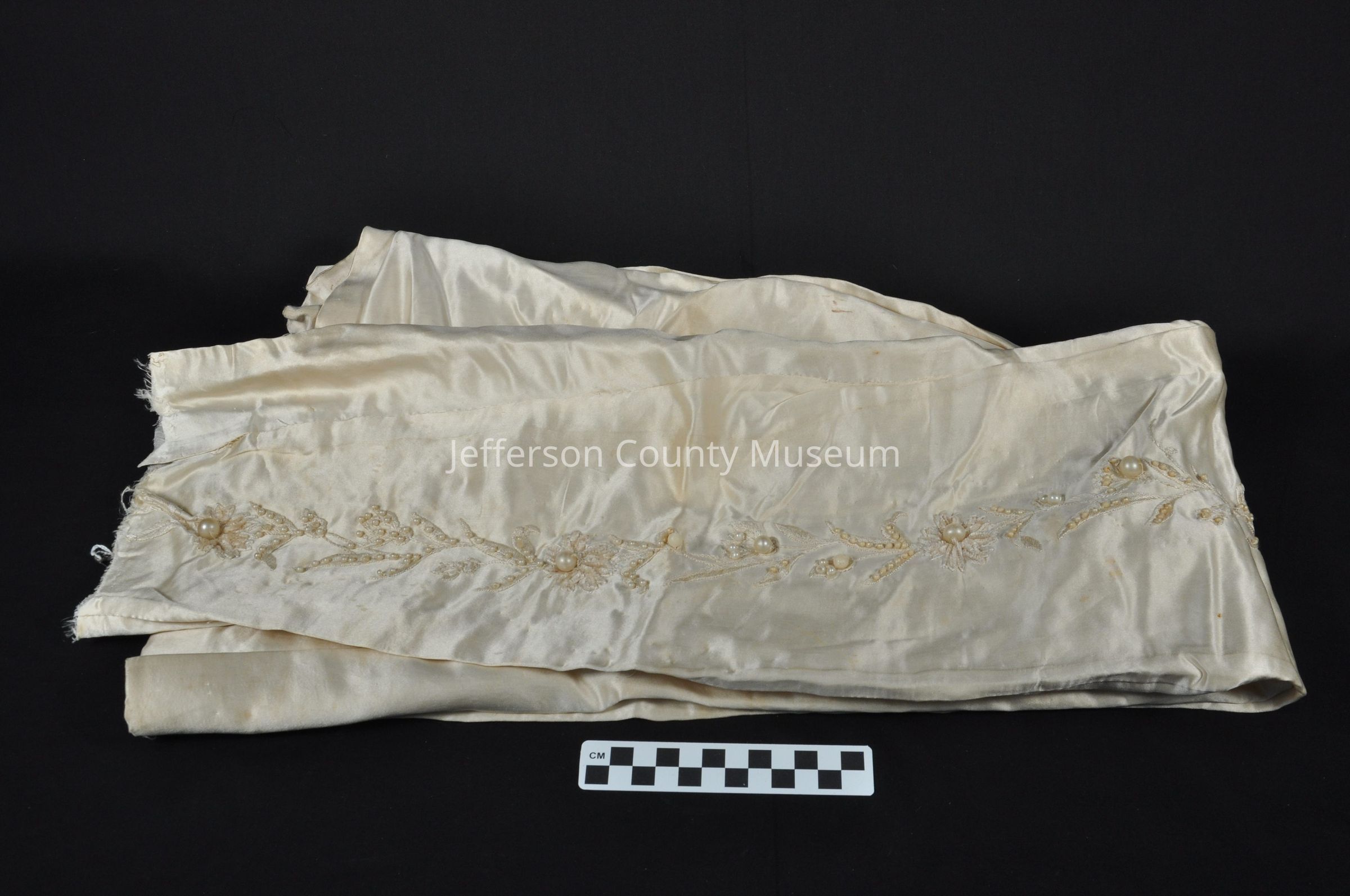 Off-white (probably once white) piece of silk or satin material with designs down front with flowers and leaves and fake pearls.Acquisition