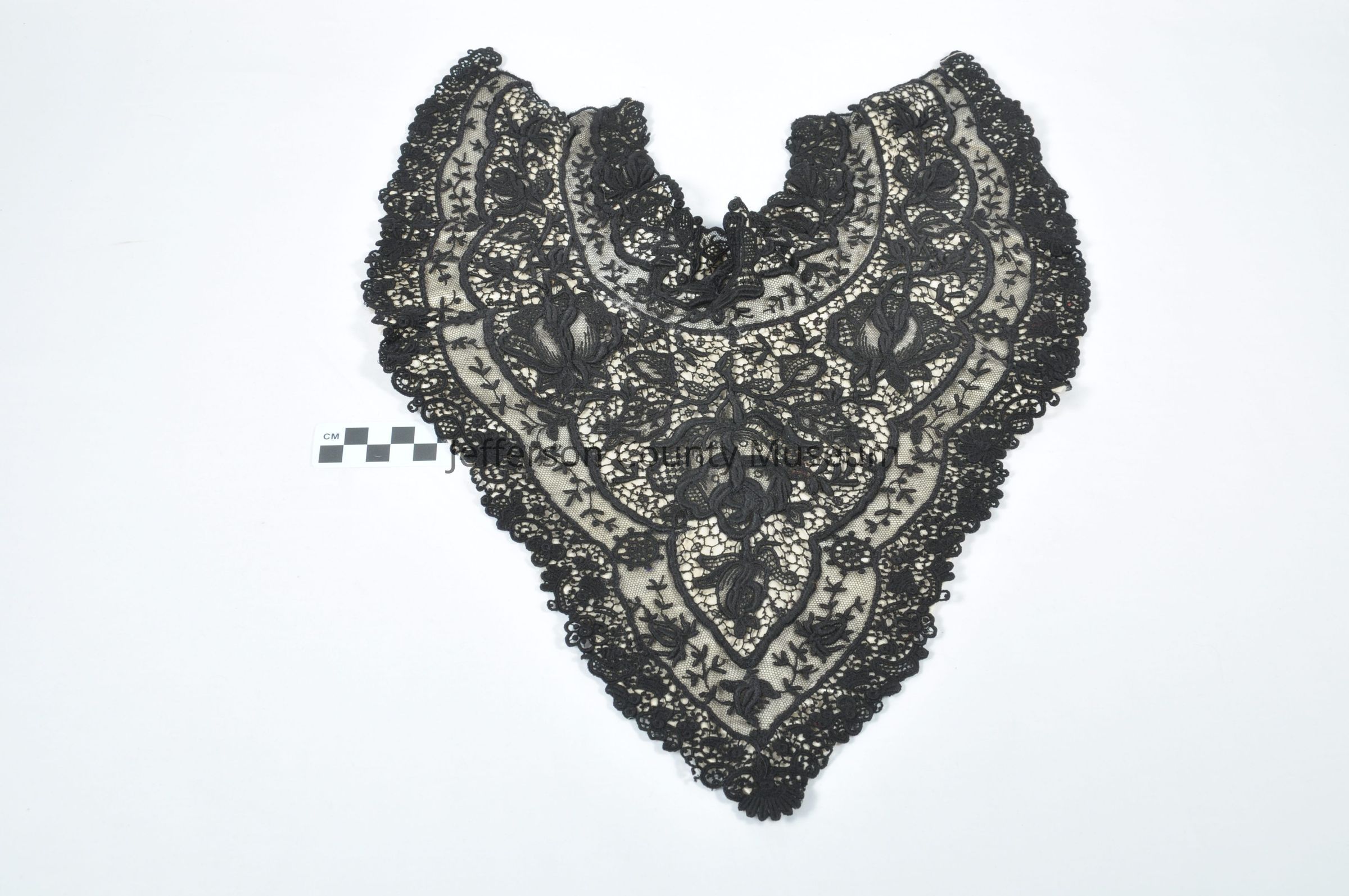 Black lace collar sewn onto a white backing. There are stays sewn to the back and there are metal hooks and loops sewn on for closure. The sides are rounded and the front drops down in a V shape.Acquisition
