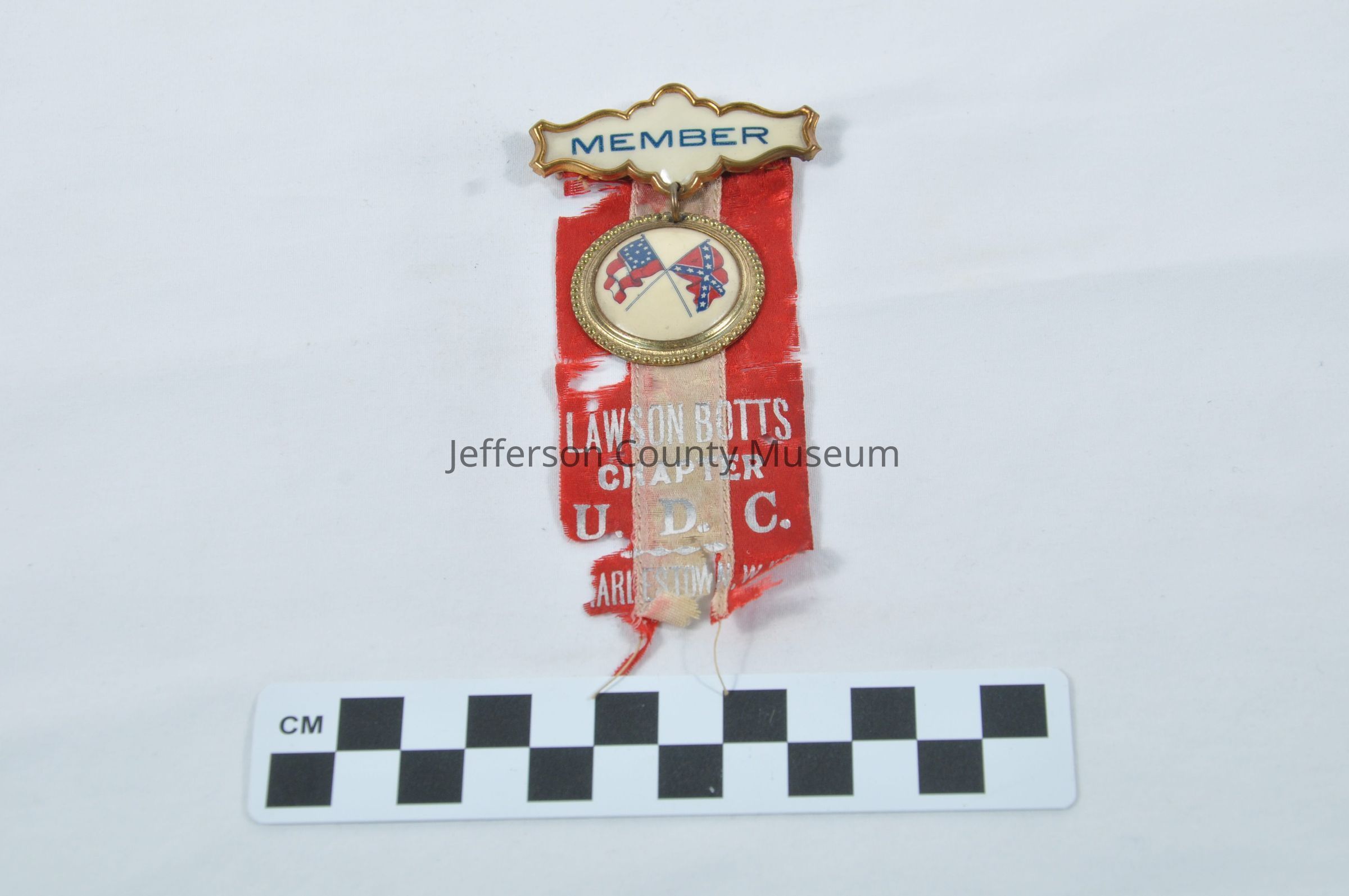 Red and white ribbon with silver letters. Letters say "LAWSON BOTTS CHAPTER U. D. C. CHARLESTOWN, W.VA." Bar at top is enameled with gold colored border. Blue letters say "MEMBER". Round medal hanging below bar has crossed Confederate battle flag and second national flag.Acquisition