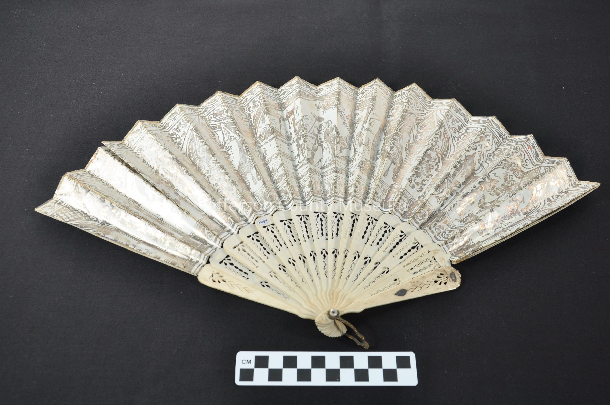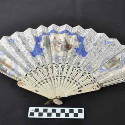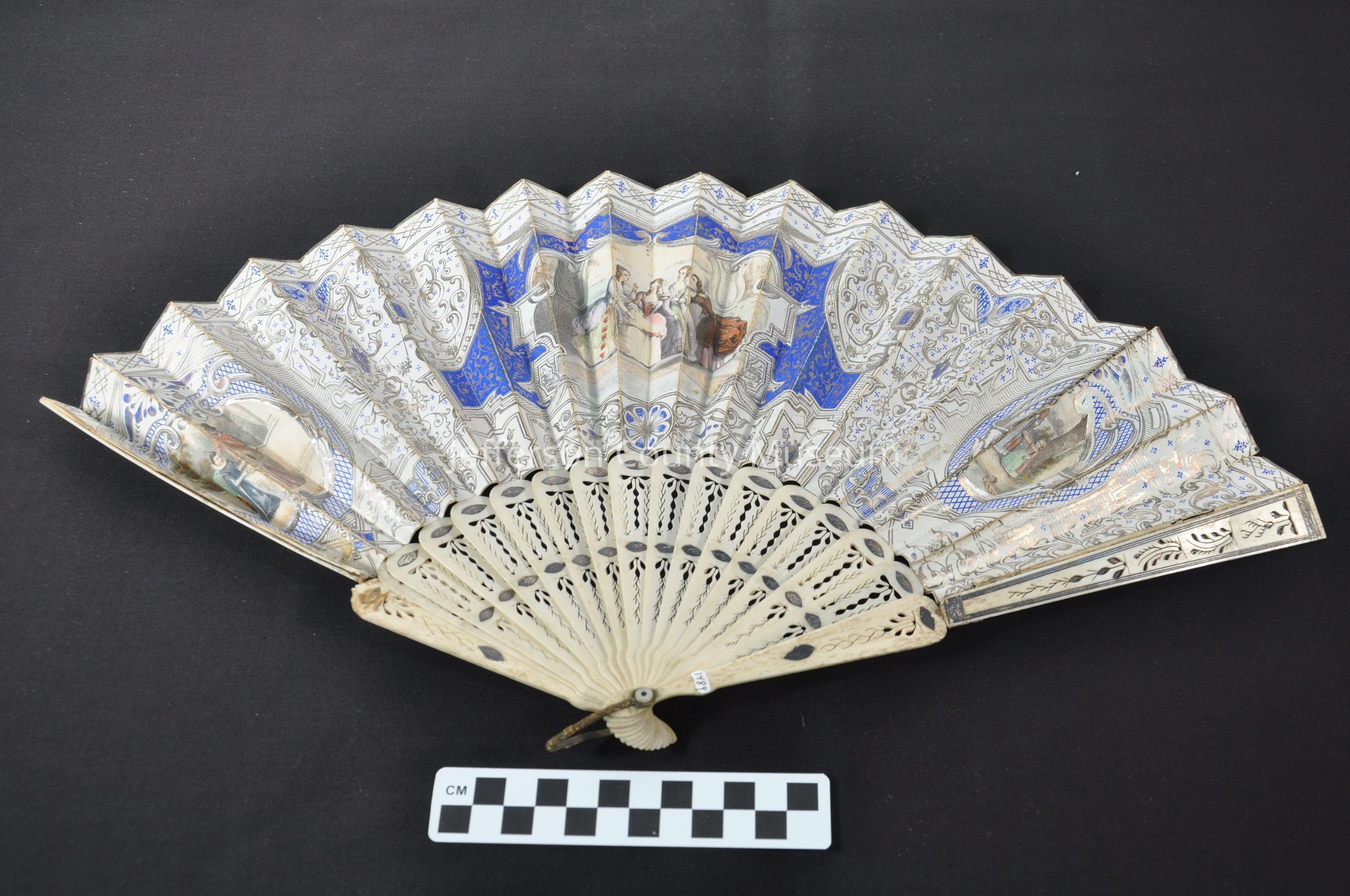 Fan with bone sticks. On each end the sticks are in two pieces and extend the whole length of the fan. There are small oval shaped silver inlays in the sticks on the side with blue and gold. There are different scenes on each side. One side is blue and gold with center scene of four ladies in 18th century dress standing and talking. Scene on left side shows a man, woman and small girl. Scene on right shows two women and small girl with ducks in lower right. Scene on other side is all gold and shows arches with birds and flowers. Center scene shows a man and woman with a boy behind them either fanning them of shading them from the sun.Acquisition