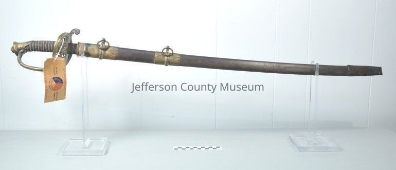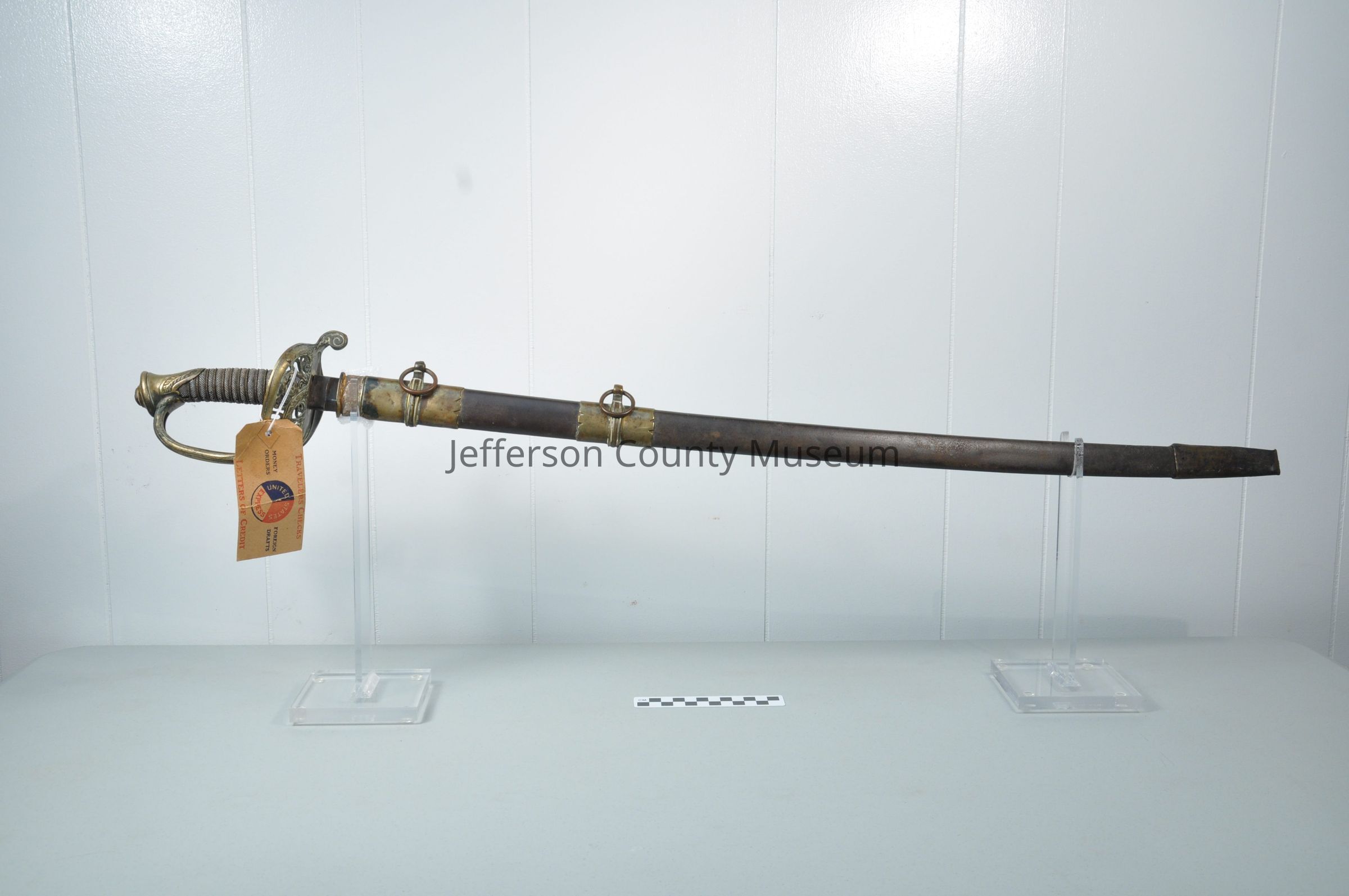 1850 officer's sword with fancy engraving on blade. Brass hilt. Marked near hilt "WARRANTED TO CUT WROUGHT IRON TIFFANY CO. NEW YORK. Scabbard with it has two brass rings for hanging on belt At the rings are two brass pieces surrounding the scabbard. Tip of scabbard is brass.Acquisition