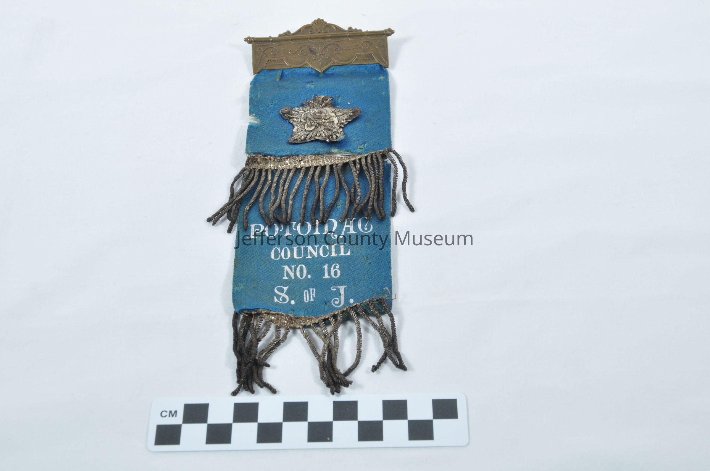 Blue ribbon with bronze colored bar at top designed like a valance with a heavy curtain rod. Large pin on back of bar. Silver colored star on top part of ribbon. Star is made with twisted wire and small silver colored disks. Fringe in center and bottom of ribbon made of silver colored wire. On lower part of ribbon in silver "POTOMAC COUNCIL NO. 16 S. OF J.". Sons of Jonadab was a temperance organization.Acquisition