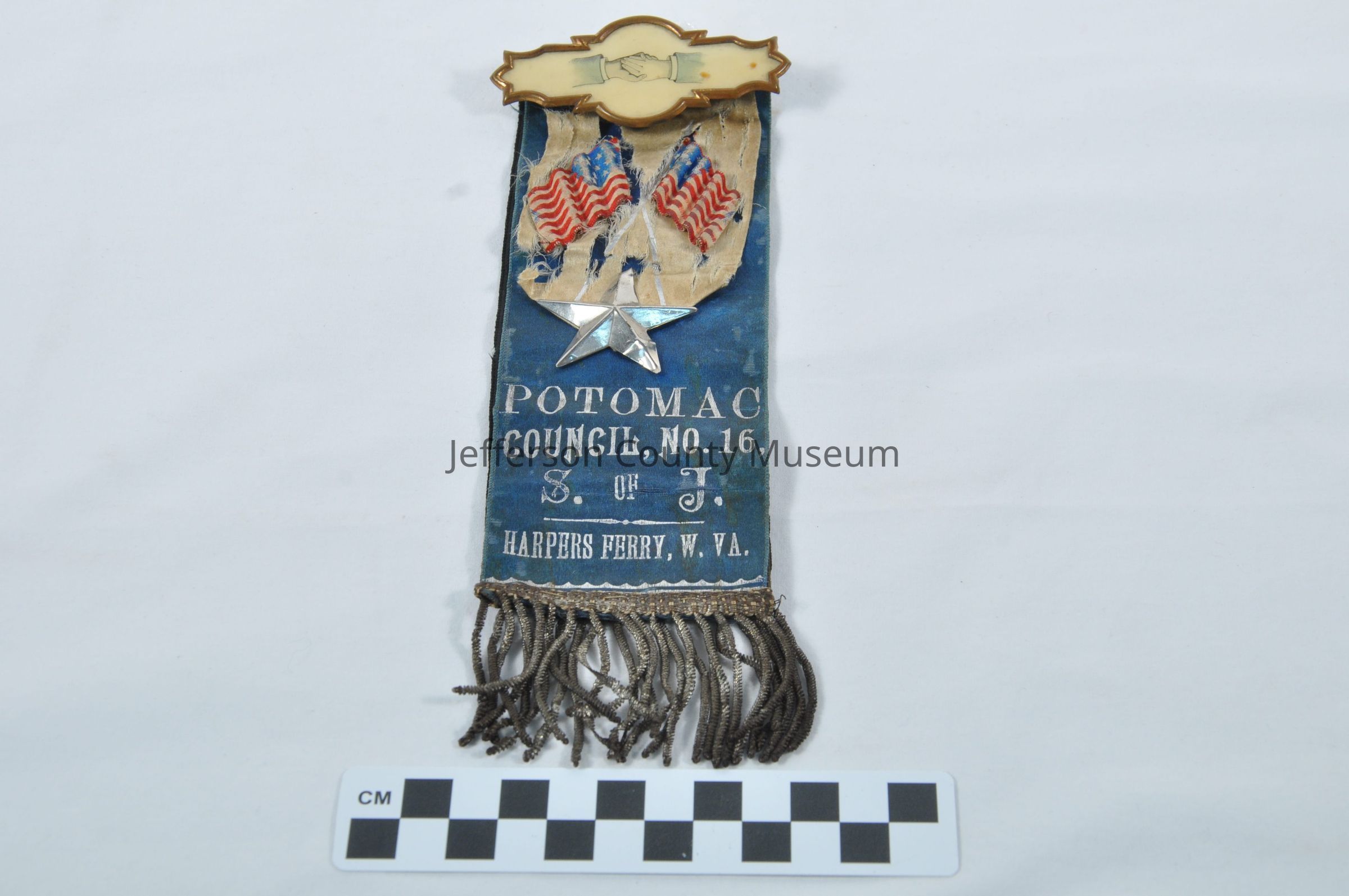 Blue ribbon on one side, black on reverse. Bar at top shows two hands shaking against off-white enameled background. Below bar is a badly deteriorating white ribbon with crossed American flags with a silver star at bottom. This white ribbon goes about halfway down ribbon. Below star is "POTOMAC COUNCIL NO. 16, S. OF J. HARPERS FERRY, W. VA.". Fringe of silver colored wire at bottom. On back is a black ribbon that has in silver letters "In Memoriam POTOMAC COUNCIL, NO., 16, S. OF J. HARPERS FERRY, W. VA." Sons of Jonadab was a temperance organization.Acquisition