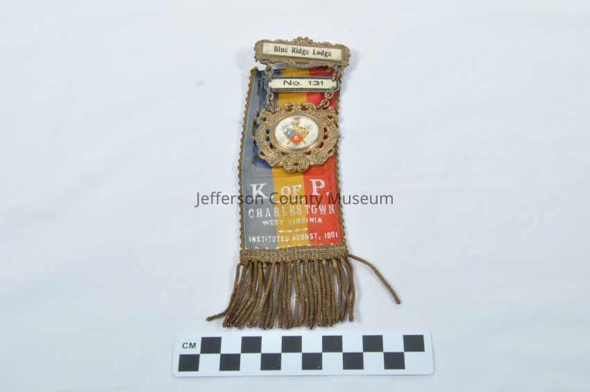 Faded blue, yellow and red ribbon with enameled bar at top and a hanging round medal. Top bar has large pin on back. Brass wire fringe at bottom. Bar at top says "Blue Ridge Lodge". Middle bar says "No. 131". On ribbon is silver "K. OF P. CHARLESTOWN WEST VIRGINIA INSTITUTED AUGUST, 1901". On back is black ribbon with silver lettering "K. OF P. CHARLESTOWN WEST VIRGINIA INSTITUTED AUGUST, 1901". Medal on front is surrounded with fancy brass design. White enameled medal has an armor helmet with visor on top of which is an eagle. Shield below has crossed halberds with "F B C".Acquisition