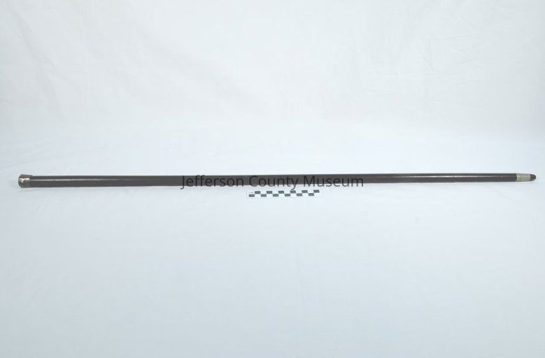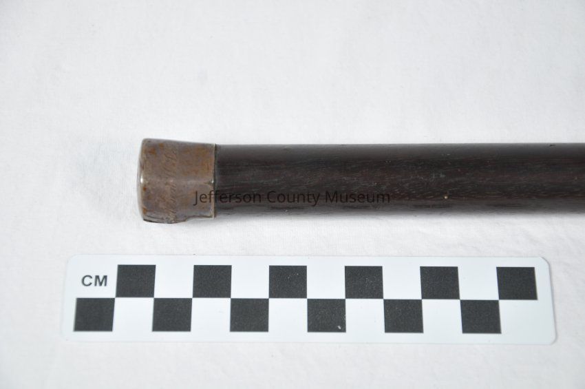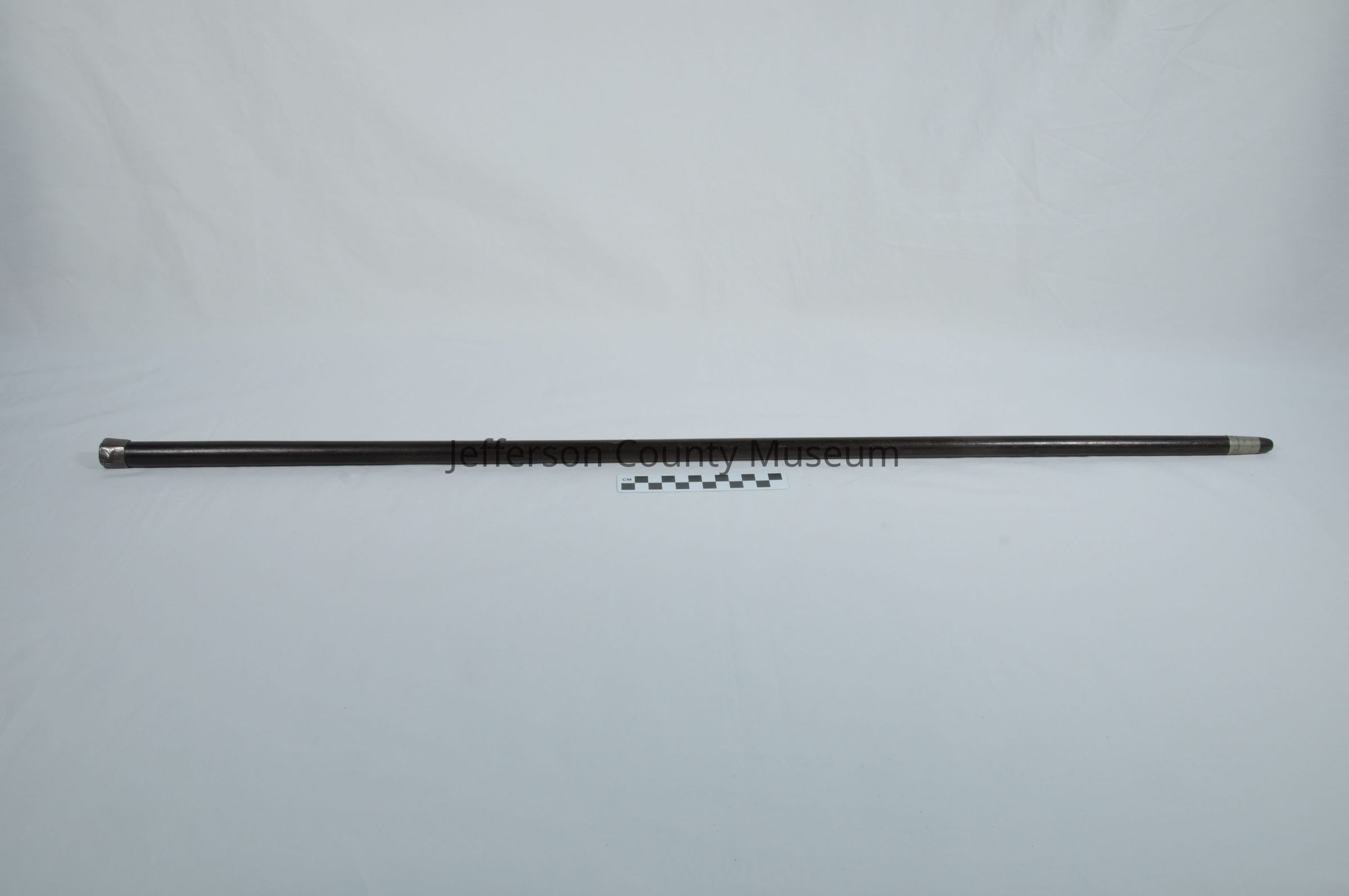 Wooden walking cane. Wood may be oak. Topped with a metal cap. Inscribed on top is "LUCAS". Inscribed around cap in script is "Charlestown. W. Va.". Bottom is tipped with metal and a silver colored band.Acquisition