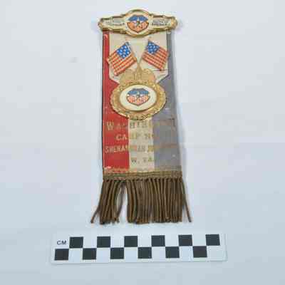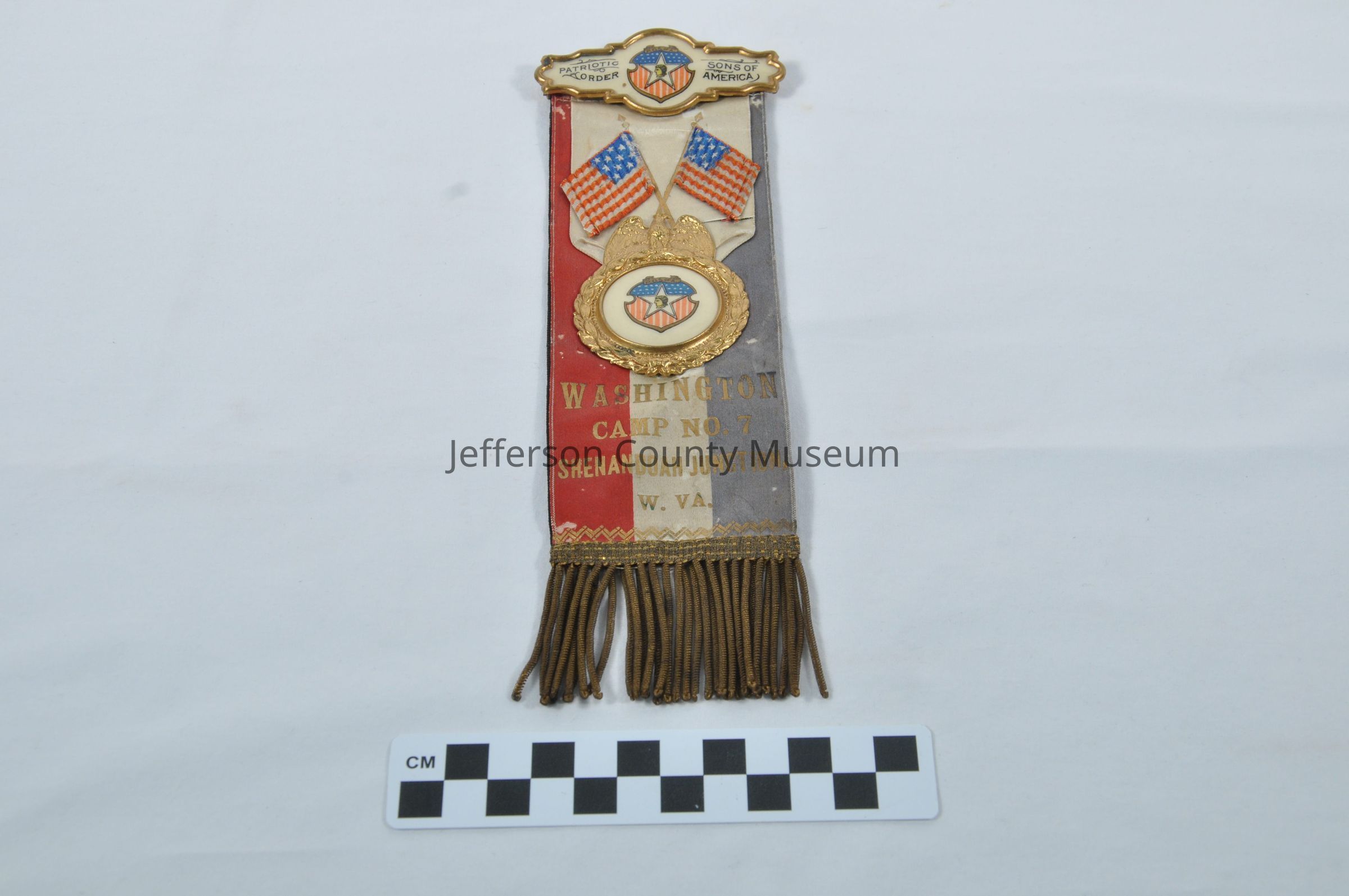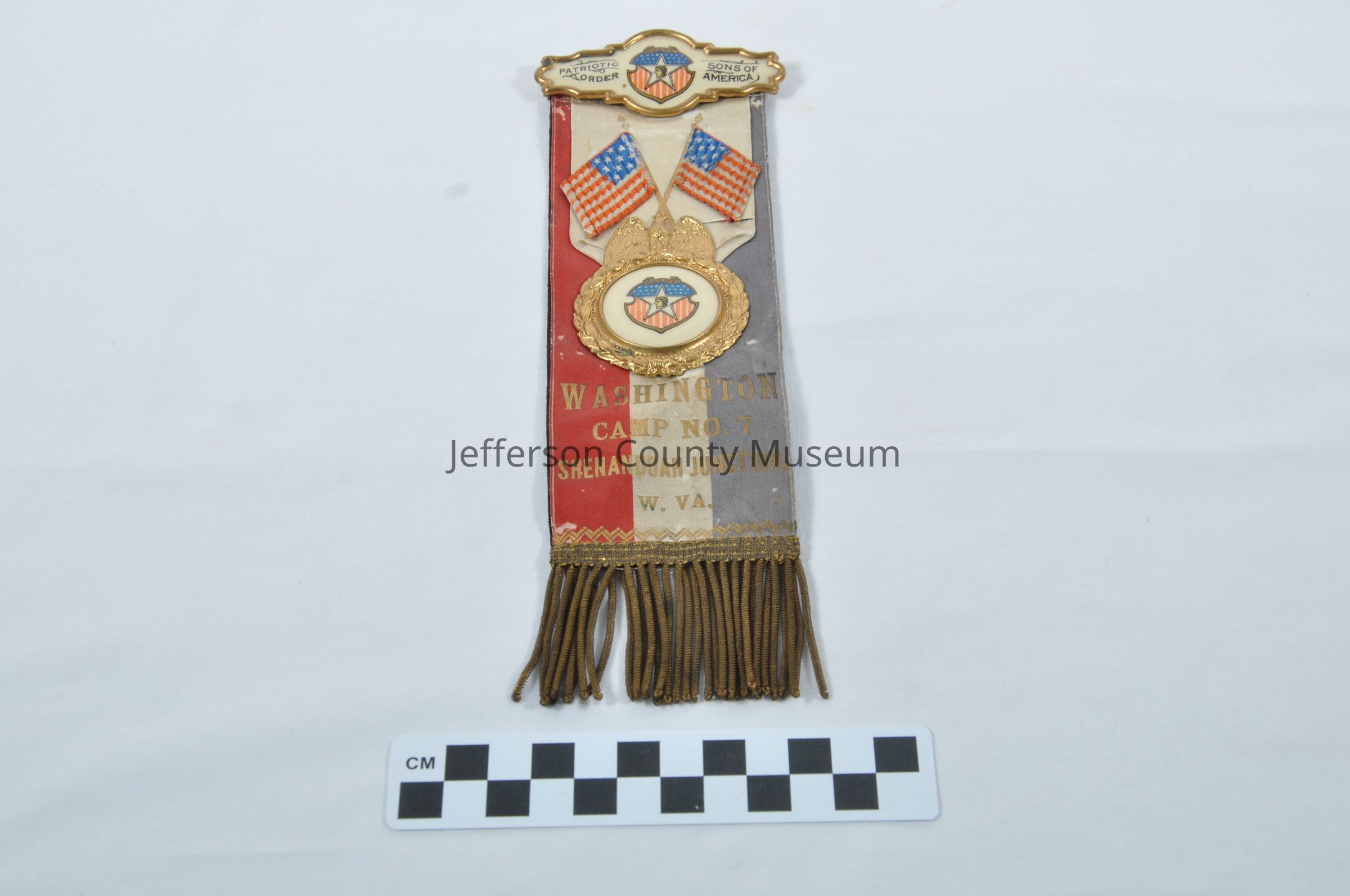 Faded red, white and blue ribbon with center medallion. Brass wire fringe at bottom. White enameled bar at top with gold border says "PATRIOTIC ORDER SONS OF AMERICA". In center of bar is American flag shield with star and man's head in center. At top of shield is banner that says "P.O.S. OF A.". Centered medallion is on white ribbon with crossed American flags. Medallion is white enamel with "P.O.S. OF A." shield in center surrounded by gold wreath with spread winged eagle at top. In gold letters on bottom half "WASHINGTON CAMP NO. 7 SHENANDOAH JUNCTION, W. VA.". Ribbon is black on back has silver letters in circle "IN MEMORIAM". Silver letters below say "WASHINGTON CAMP NO. 7 SHENANDOAH JUNCTION, W. VA.".Acquisition