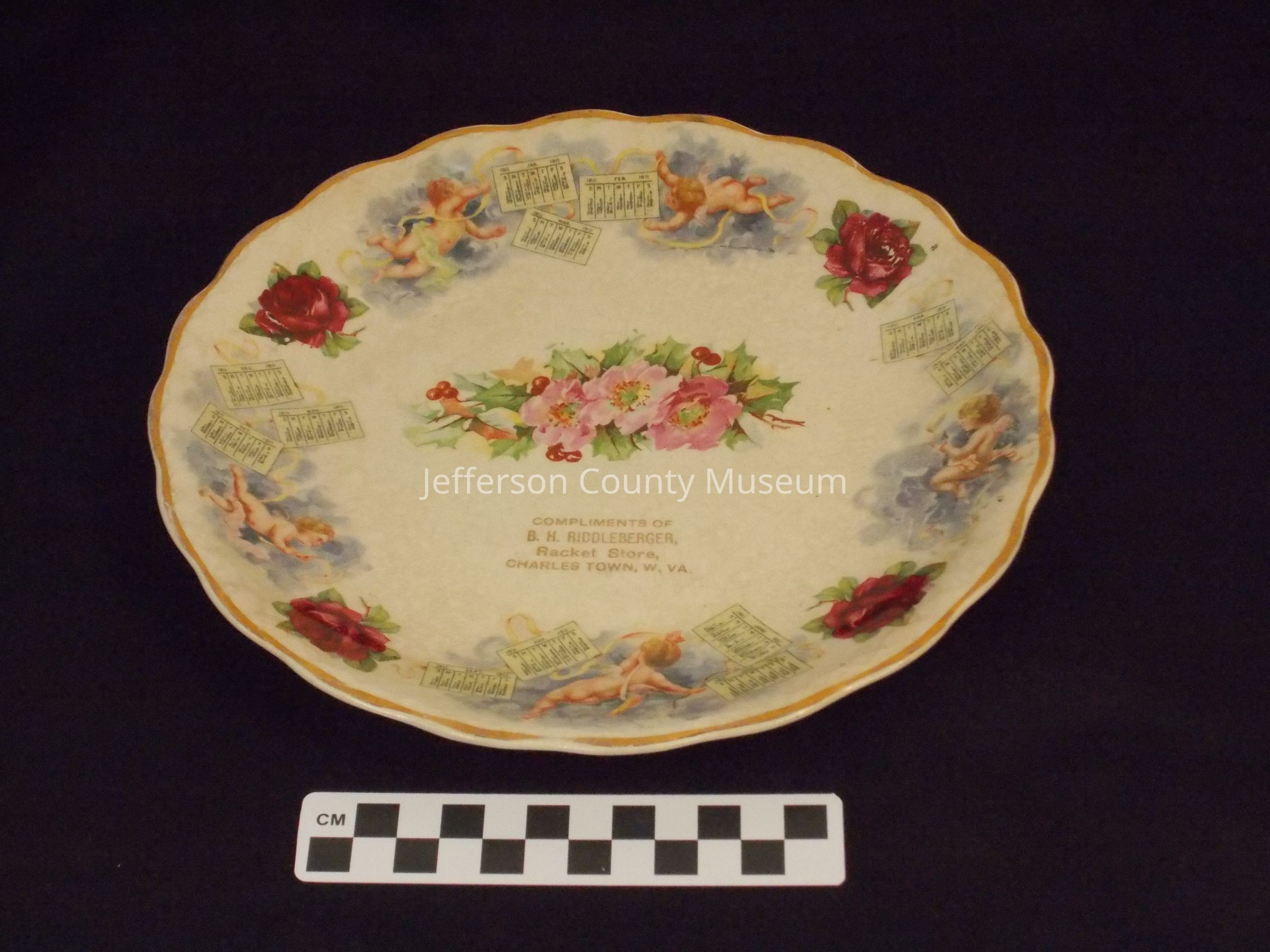 Calendar plate for 1911. Months are arranged around plate along with cherubs and red roses. Pink roses and holly berries in center of plate. Gold trim around edge. Below center roses in gold is "COMPLIMENTS OF B. H. RIDDLEBERGER, Racket Store, CHARLES TOWN, W. VA.". On back in center is "CARNATION McNICOL".Acquisition